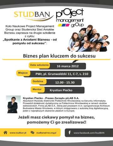 Koło Naukowe Project Management Group oraz Studencka Sieć Aniołów Biznesu zaprasza na drugie szkolenie z cyklu: „Spotkanie z Aniołami Biznesu - od pomysłu od sukcesu”: Biznes plan kluczem do sukcesu Data szkolenia Miejsce 16 marca 2012 PWr, pl. Grunwaldzki 11, C-7, s. 210 Godzina Mentor 12.00 - 15.30 Krys an Piećko Krystian Piećko - Prezes Zarządu piLAB S.A. Absolwent Wydziału Elektroniki Politechniki Wrocławskiej na kierunku Informatyka. Prowadził działalność dydaktyczną na Politechnice Wrocławskiej w ramach studiów doktoranckich. Firma piLAB S.A., której jest prezesem m.in. oprogramowuje Archiwum Budowlane Miasta Wrocławia, w którym zintegrowano z autorską linią digitalizacyjną, jeden z największych skanerów płaskich w Europie. 12.00 - 12.15 12.15 - 12.30 Rejestracja uczestników Wprowadzenia do świata Aniołów Biznesu Prowadzenie: Rafał Pałgan - Specjalista PSAB-I - Kim jest Anioł Biznesu? - Czym jest Sieć Aniołów Biznesu? - Przedstawienie firmy PiLAB S.A. jako inwestycji zrealizowanej przez PSAB-I 12.30 - 13.30 Jak zostałem pomysłodawcą? - panel dyskusyjny Prowadzenie: Krys an Piećko - Prezes Zarządu piLAB S.A. - Skąd się wziął mój pomysł? - Jak trafiłem do Sieci Aniołów Biznesu? - Jak Sieć Aniołów Biznesu pomogła mi w realizacji przedsięwzięcia? 13.30 - 13.45 Przerwa 13.45 - 14.30 Biznes plan i analiza kluczem do sucesu Prowadzenie: Piotr Wanicki, Łukasz Bandurowski - Specjaliści PSAB-I - Biznes plan - jak go napisać? - Jak poradzić sobie z prognozami? - Analiza finansowa projektu 14.30 - 15.30 Biznes plan - case study Prowadzenie: Piotr Wanicki, Łukasz Bandurowski - Specjaliści PSAB-I Zgłoszenia na szkolenie przyjmowane są mailowo na adres: [email protected] oraz pod numerem telefonu 728 819 371. Zgłoszenia prosimy przesyłać do 14 marca 2012r. Formularz zgłoszeniowy do pobrania ze strony www.studban.pl