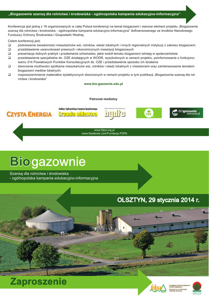 gazownie „Biogazownie szansą dla rolnictwa i środowiska - ogólnopolska kampania edukacyjno-informacyjna” Konferencja jest jedną z 19 organizowanych w całej Polsce konferencji na temat biogazowni i stanowi element projektu „Biogazownie szansą dla rolnictwa i środowiska - ogólnopolska kampania edukacyjno-informacyjna” dofinansowanego ze środków Narodowego Funduszu Ochrony Środowiska i Gospodarki Wodnej. Celem konferencji jest: q podniesienie świadomości mieszkańców wsi, rolników, władz lokalnych i innych regionalnych instytucji z zakresu biogazowni; q przedstawienie uwarunkowań prawnych i ekonomicznych inwestycji biogazowych q prezentacja dobrych praktyk i przełamanie schematów, jakie wokół tematu biogazowni istnieją w społeczeństwie q przedstawienie specjalistów ds. OZE działających w WODR, wyszkolonych w ramach projektu, poinformowanie o funkcjonowaniu 314 Powiatowych Punktów Konsultacyjnych ds. OZE i przedstawienie sposobu ich działania q stworzenie możliwości spotkania mieszkańców wsi, rolników i władz lokalnych z inwestorami oraz zainteresowanie tematem biogazowni mediów lokalnych; q rozpowszechnienie materiałów dydaktycznych stworzonych w ramach projektu w tym publikacji „Biogazownie szansą dla rolnictwa i środowiska” www.bio-gazownie.edu.pl Patronat medialny www.fdpa.org.pl www.facebook.com/Fundacja.FDPA Biogazownie Szansą dla rolnictwa i środowiska - ogólnopolska kampania edukacyjno-informacyjna OLSZTYN, 29 stycznia 2014 r. Zaproszenie 9.00 - 9.15 Rejestracja uczestników/kawa 9.15 - 9.30 Przywitanie gości i przedstawienie projektu - przedstawiciel FDPA i Dyrektor W-MODR Wystąpienie przedstawiciela Urzędu Marszałkowskiego - Departament Rolnictwa i Rozwoju Obszarów Wiejskich 9.30 - 11.00 Biogazownia szansą dla rolnictwa i środowiska Biogazownie szansą rozwoju dla regionu, doświadczenia inwestorów (rodzaje biogazowni z uwzględnieniem specyfiki regionu i dostępności substratu) - mgr inż. Ludwik Latocha 11.00 - 12.30 Aspekty prawne związane z biogazowniami (dokumenty prawne, definicje biogazowni, proces inwestycyjny) - dr Alina Kowalczyk-Juśko - Uniwersytet Przyrodniczy w Lublinie, Wydział Nauk Rolniczych w Zamościu 12.30 - 12.45 Przerwa na kawę 12.45 - 14.15 Aspekty ekonomiczne - nakłady, wskaźniki i możliwości pozyskania surowców (z uwzględnieniem źródeł finansowania i warunków województwa warmińsko-mazurskiego) - dr Alina Kowalczyk-Juśko - Uniwersytet Przyrodniczy w Lublinie, Wydział Nauk Rolniczych w Zamościu Dostępne źródła finansowania biogazowni - przedstawiciel WFOŚiGW w Olsztynie Przegląd postępowania administracyjnego - pozwolenie na budowę praktyczne aspekty - mgr inż. Patryk Stasiak 14.15 - 15.45 Uwarunkowania społeczne związane z biogazowniami (prezentacja korzyści z biogazowni, przedstawienie najczęstszych problemów oraz próba odpowiedzi - przykłady z danego województwa) - mgr inż. Ludwik Latocha 15.45 - 16.00 Dyskusja i podsumowanie 16.00 Poczęstunek 16.00 - 16.45 Konsultacje i doradztwo indywidualne z zakresu inwestycji biogazowych świadczone przez doradców W-MODR w trakcie i po zakończeniu konferencji. Patronat honorowy Ministra Rolnictwa i Rozwoju Wsi Patronat honorowy Marszałka Województwa Warmińsko-Mazurskiego Jacka Protasa Fundacja na rzecz Rozwoju Polskiego Rolnictwa wraz z Warmińsko-Mazurskim Ośrodkiem Doradztwa Rolniczego w Olsztynie ma przyjemność zaprosić na konferencję „Biogazownie szansą dla rolnictwa i środowiska” która odbędzie się w siedzibie W-MODR przy ul. Jagiellońskiej 91 w Olsztynie W DNIU 29 STYCZNIA 2014 ROKU W GODZINACH 9.00 - 16.45 SERDECZNIE ZAPRASZAMY