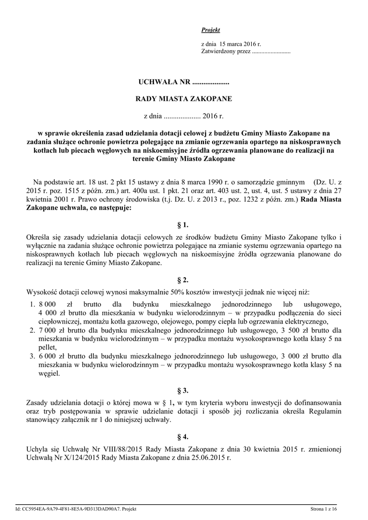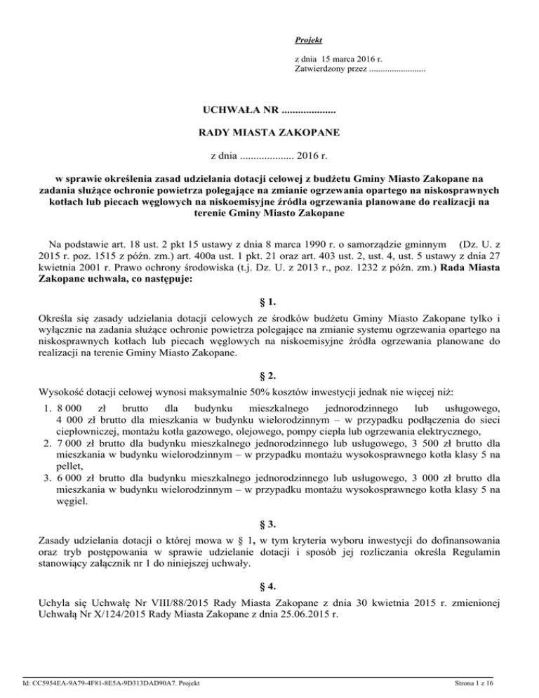 Projekt z dnia 15 marca 2016 r. Zatwierdzony przez ......................... UCHWAŁA NR .................... RADY MIASTA ZAKOPANE z dnia .................... 2016 r. w sprawie określenia zasad udzielania dotacji celowej z budżetu Gminy Miasto Zakopane na zadania służące ochronie powietrza polegające na zmianie ogrzewania opartego na niskosprawnych kotłach lub piecach węglowych na niskoemisyjne źródła ogrzewania planowane do realizacji na terenie Gminy Miasto Zakopane Na podstawie art. 18 ust. 2 pkt 15 ustawy z dnia 8 marca 1990 r. o samorządzie gminnym (Dz. U. z 2015 r. poz. 1515 z późn. zm.) art. 400a ust. 1 pkt. 21 oraz art. 403 ust. 2, ust. 4, ust. 5 ustawy z dnia 27 kwietnia 2001 r. Prawo ochrony środowiska (t.j. Dz. U. z 2013 r., poz. 1232 z późn. zm.) Rada Miasta Zakopane uchwala, co następuje: § 1. Określa się zasady udzielania dotacji celowych ze środków budżetu Gminy Miasto Zakopane tylko i wyłącznie na zadania służące ochronie powietrza polegające na zmianie systemu ogrzewania opartego na niskosprawnych kotłach lub piecach węglowych na niskoemisyjne źródła ogrzewania planowane do realizacji na terenie Gminy Miasto Zakopane. § 2. Wysokość dotacji celowej wynosi maksymalnie 50% kosztów inwestycji jednak nie więcej niż: 1. 8 000 zł brutto dla budynku mieszkalnego jednorodzinnego lub usługowego, 4 000 zł brutto dla mieszkania w budynku wielorodzinnym – w przypadku podłączenia do sieci ciepłowniczej, montażu kotła gazowego, olejowego, pompy ciepła lub ogrzewania elektrycznego, 2. 7 000 zł brutto dla budynku mieszkalnego jednorodzinnego lub usługowego, 3 500 zł brutto dla mieszkania w budynku wielorodzinnym – w przypadku montażu wysokosprawnego kotła klasy 5 na pellet, 3. 6 000 zł brutto dla budynku mieszkalnego jednorodzinnego lub usługowego, 3 000 zł brutto dla mieszkania w budynku wielorodzinnym – w przypadku montażu wysokosprawnego kotła klasy 5 na węgiel. § 3. Zasady udzielania dotacji o której mowa w § 1, w tym kryteria wyboru inwestycji do dofinansowania oraz tryb postępowania w sprawie udzielanie dotacji i sposób jej rozliczania określa Regulamin stanowiący załącznik nr 1 do niniejszej uchwały. § 4. Uchyla się Uchwałę Nr VIII/88/2015 Rady Miasta Zakopane z dnia 30 kwietnia 2015 r. zmienionej Uchwałą Nr X/124/2015 Rady Miasta Zakopane z dnia 25.06.2015 r. Id: CC5954EA-9A79-4F81-8E5A-9D313DAD90A7. Projekt Strona 1 z 16 § 5. 1. Wykonanie uchwały powierza się Burmistrzowi Miasta Zakopane. 2. W zakresie, w jakim niniejsza uchwała przewiduje udzielenie pomocy de minimis, przepisy § 2 pkt 8, § 5 ust 2 załącznika Nr 1 do uchwały, ust. 13 załącznika Nr 1 do Regulaminu, ust. 3 załącznika Nr 2 do Regulaminu Część A tracą moc z dniem 01.01.2021 r. § 6. Uchwała wchodzi w życie po upływie 14 dni od dnia ogłoszenia w Dzienniku Urzędowym Województwa Małopolskiego. Strona 2 z 16 Id: CC5954EA-9A79-4F81-8E5A-9D313DAD90A7. Projekt Załącznik do Uchwały Rady Miasta Zakopane z dnia .................... 2016r. REGULAMIN określający zasady udzielania dotacji celowej z budżetu Gminy Miasto Zakopane na zadania służące ochronie powietrza polegające na zmianie ogrzewania opartego na niskosprawnych kotłach lub piecach węglowych na niskoemisyjne źródła ogrzewania planowane do realizacji na terenie Gminy Miasto Zakopane Rozdział 1. Postanowienia ogólne §1 Regulamin określa zasady udzielania dotacji celowej ze środków budżetu Gminy Miasto Zakopane tylko i wyłącznie na zadania polegające na trwałej zmianie istniejącego systemu ogrzewania niskosprawnymi kotłami lub piecami opartego na paliwie stałym na niskoemisyjne źródła ogrzewania w tym na: 1) podłączenie do sieci ciepłowniczej; 2) kotły gazowe; 3) kotły olejowe; 4) pompy ciepła; 5) ogrzewanie elektryczne; 6) wysokosprawne kotły klasy 5 na paliwa stałe. §2 Ilekroć w niniejszym Regulaminie jest mowa o: 1) Dotacji celowej – rozumie się przez to dotację celową w rozumieniu przepisów ustawy z dnia 27 sierpnia 2009 r. o finansach publicznych (t. j. Dz. U. z 2013 r., poz. 885 z późn. zm.); 2) Dotującym – rozumie się przez to Gminę Miasto Zakopane; 3) Wnioskodawcy – rozumie się przez to podmiot będący właścicielem, współwłaścicielem: budynku usługowego, lokalu mieszkalnego, budynku mieszkalnego (jednorodzinnego lub wielorodzinnego), zlokalizowanego na terenie Gminy Miasto Zakopane, ubiegający się o udzielenie dotacji, tj.: a) podmioty niezaliczone do sektora finansów publicznych, w szczególności: - osoby fizyczne, - wspólnoty mieszkaniowe, - osoby prawne, - przedsiębiorcy; b) jednostki sektora finansów publicznych będące gminnymi lub powiatowymi osobami prawnymi,. 4) Zadaniu – rozumie się przez to wykonanie przedsięwzięcia (zadania) z zakresu ochrony środowiska, o którym mowa w art. 400a ust. 1 pkt 21 ustawy z dnia 27 kwietnia 2001 r. Prawo ochrony środowiska (t. j. Dz. U. 2013 r., poz.1232 z późn. zm.), polegającego na zmianie systemu ogrzewania opartego na niskosprawnych kotłach lub piecach węglowych na niskoemisyjne źródła ogrzewania w Id: CC5954EA-9A79-4F81-8E5A-9D313DAD90A7. Projekt Strona 1 z 13 nieruchomościach zlokalizowanych na terenie Gminy Miasto Zakopane, przyczyniającego się do ograniczenia niskiej emisji zanieczyszczeń powietrza; 5) Zmianie systemu ogrzewania opartego na niskosprawnych kotłach lub piecach węglowych na niskoemisyjne źródła ogrzewania – rozumie się przez to trwałą zmianę istniejącego, nieekologicznego pieca lub kotła c.o. przestarzałej konstrukcji (tradycyjne piece i kotły c.o. komorowe zasypowe opalane węglem, koksem, miałem, ekogroszkiem) o niskiej sprawności energetycznej, poprzez jego trwałą likwidację i zastąpienie go niskoemisyjnym źródłem ogrzewania (miejska sieć ciepłownicza, kotły gazowe, kotły olejowe, pompy ciepła, ogrzewanie elektryczne oraz kotły na paliwa stałe klasy 5), w sposób umożli