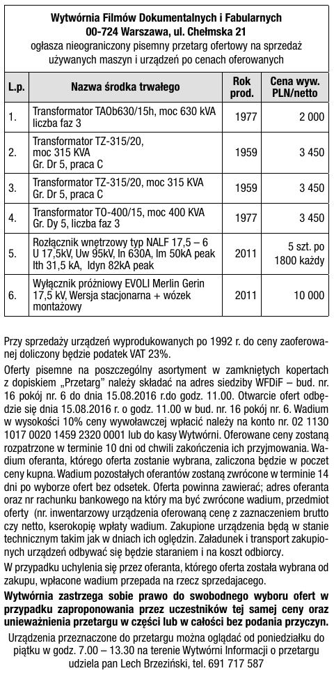 Wytwórnia Filmów Dokumentalnych i Fabularnych 00-724 Warszawa, ul. Chełmska 21 ogłasza nieograniczony pisemny przetarg ofertowy na sprzedaż używanych maszyn i urządzeń po cenach oferowanych L.p. Nazwa środka trwałego Rok prod. Cena wyw. PLN/netto 1. Transformator TAOb630/15h, moc 630 kVA liczba faz 3 1977 2 000 2. Transformator TZ-315/20, moc 315 KVA Gr. Dr 5, praca C 1959 3 450 3. Transformator TZ-315/20, moc 315 KVA Gr. Dr 5, praca C 1959 3 450 4. Transformator TO-400/15, moc 400 KVA Gr. Dy 5, liczba faz 3 1977 3 450 5. Rozłącznik wnętrzowy typ NALF 17,5 – 6 U 17,5kV, Uw 95kV, In 630A, Im 50kA peak Ith 31,5 kA, Idyn 82kA peak 2011 5 szt. po 1800 każdy 6. Wyłącznik próżniowy EVOLI Merlin Gerin 17,5 kV, Wersja stacjonarna + wózek montażowy 2011 10 000 Przy sprzedaży urządzeń wyprodukowanych po 1992 r. do ceny zaoferowanej doliczony będzie podatek VAT 23%. Oferty pisemne na poszczególny asortyment w zamkniętych kopertach z dopiskiem „Przetarg” należy składać na adres siedziby WFDiF – bud. nr. 16 pokój nr. 6 do dnia 15.08.2016 r.do godz. 11.00. Otwarcie ofert odbędzie się dnia 15.08.2016 r. o godz. 11.00 w bud. nr. 16 pokój nr. 6. Wadium w wysokości 10% ceny wywoławczej wpłacić należy na konto nr. 02 1130 1017 0020 1459 2320 0001 lub do kasy Wytwórni. Oferowane ceny zostaną rozpatrzone w terminie 10 dni od chwili zakończenia ich przyjmowania. Wadium oferanta, którego oferta zostanie wybrana, zaliczona będzie w poczet ceny kupna. Wadium pozostałych oferantów zostaną zwrócone w terminie 14 dni po wyborze ofert bez odsetek. Oferta powinna zawierać; adres oferanta oraz nr rachunku bankowego na który ma być zwrócone wadium, przedmiot oferty (nr. inwentarzowy urządzenia oferowaną cenę z zaznaczeniem brutto czy netto, kserokopię wpłaty wadium. Zakupione urządzenia będą w stanie technicznym takim jak w dniach ich oględzin. Załadunek i transport zakupionych urządzeń odbywać się będzie staraniem i na koszt odbiorcy. W przypadku uchylenia się przez oferanta, którego oferta została wybrana od zakupu, wpłacone wadium przepada na rzecz sprzedajacego. Wytwórnia zastrzega sobie prawo do swobodnego wyboru ofert w przypadku zaproponowania przez uczestników tej samej ceny oraz unieważnienia przetargu w części lub w całości bez podania przyczyn. Urządzenia przeznaczone do przetargu można oglądać od poniedziałku do piątku w godz. 7.00 – 13.30 na terenie Wytwórni Informacji o przetargu udziela pan Lech Brzeziński, tel. 691 717 587