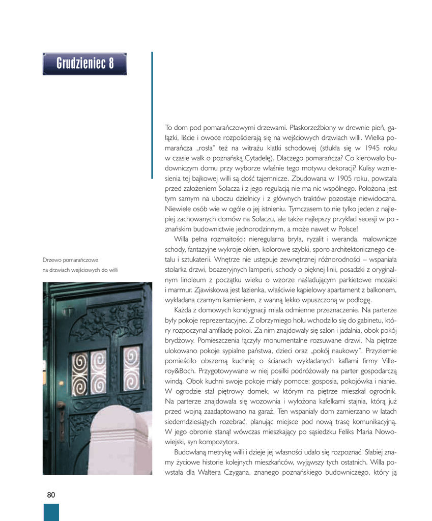 Grudzieniec 8 Drzewo pomarańczowe na drzwiach wejściowych do willi 80 To dom pod pomarańczowymi drzewami. Płaskorzeźbiony w drewnie pień, gałązki, liście i owoce rozpościerają się na wejściowych drzwiach willi. Wielka pomarańcza „rosła” też na witrażu klatki schodowej (stłukła się w 1945 roku w czasie walk o poznańską Cytadelę). Dlaczego pomarańcza? Co kierowało budowniczym domu przy wyborze właśnie tego motywu dekoracji? Kulisy wzniesienia tej bajkowej willi są dość tajemnicze. Zbudowana w 1905 roku, powstała przed założeniem Sołacza i z jego regulacją nie ma nic wspólnego. Położona jest tym samym na uboczu dzielnicy i z głównych traktów pozostaje niewidoczna. Niewiele osób wie w ogóle o jej istnieniu. Tymczasem to nie tylko jeden z najlepiej zachowanych domów na Sołaczu, ale także najlepszy przykład secesji w po znańskim budownictwie jednorodzinnym, a może nawet w Polsce! Willa pełna rozmaitości: nieregularna bryła, ryzalit i weranda, malownicze schody, fantazyjne wykroje okien, kolorowe szybki, sporo architektonicznego detalu i sztukaterii. Wnętrze nie ustępuje zewnętrznej różnorodności – wspaniała stolarka drzwi, boazeryjnych lamperii, schody o pięknej linii, posadzki z oryginalnym linoleum z początku wieku o wzorze naśladującym parkietowe mozaiki i marmur. Zjawiskowa jest łazienka, właściwie kąpielowy apartament z balkonem, wykładana czarnym kamieniem, z wanną lekko wpuszczoną w podłogę. Każda z domowych kondygnacji miała odmienne przeznaczenie. Na parterze były pokoje reprezentacyjne. Z olbrzymiego holu wchodziło się do gabinetu, który rozpoczynał amfiladę pokoi. Za nim znajdowały się salon i jadalnia, obok pokój brydżowy. Pomieszczenia łączyły monumentalne rozsuwane drzwi. Na piętrze ulokowano pokoje sypialne państwa, dzieci oraz „pokój naukowy”. Przyziemie pomieściło obszerną kuchnię o ścianach wykładanych kaflami firmy Villeroy&Boch. Przygotowywane w niej posiłki podróżowały na parter gospodarczą windą. Obok kuchni swoje pokoje miały pomoce: gosposia, pokojówka i nianie. W ogrodzie stał piętrowy domek, w którym na piętrze mieszkał ogrodnik. Na parterze znajdowała się wozownia i wyłożona kafelkami stajnia, którą już przed wojną zaadaptowano na garaż. Ten wspaniały dom zamierzano w latach siedemdziesiątych rozebrać, planując miejsce pod nową trasę komunikacyjną. W jego obronie stanął wówczas mieszkający po sąsiedzku Feliks Maria Nowowiejski, syn kompozytora. Budowlaną metrykę willi i dzieje jej własności udało się rozpoznać. Słabiej znamy życiowe historie kolejnych mieszkańców, wyjąwszy tych ostatnich. Willa powstała dla Waltera Czygana, znanego poznańskiego budowniczego, który ją Willa przy ul. Grudzieniec 8 Wiktor i Kazimiera Czyszowie, 1934 r. Zabytkowy kaloryfer z komorą podgrzewacza na napoje 82 zapewne sam zaprojektował. Czygan budował wiele domów, zazwyczaj kamienic, i znany był z tego, że je po jakimś czasie sprzedawał. Do wykonania sztukaterii willi zatrudnił Sante Zanettiego, dekoratora poznańskich kamienic z początku dwudziestego wieku. Najbliższe tym z Grudzieńca są ozdoby wspaniałej kamienicy z ulicy Dąbrowskiego 25. Czygan mieszkał przy Grudzieńcu tylko przez dwa lata i już w 1907 roku wyprowadził się do własnej kamienicy przy ulicy Głogowskiej 53. Wynajmowaną z początku willę sprzedał w 1909 roku Heinzowi Hoffmeyerowi, właścicielowi majątku Złotniki. Od lat dwudziestych dom był w posiadaniu Kazimierza Jarocińskiego, hurtownika bławatnego ze Starego Rynku. Przodkowie dzisiejszych właścicieli pojawili się na Grudzieńcu w 1935 roku. Wtedy to Wiktor i Kazimiera Czyszowie kupili willę od Jarocińskiego, swego przyjaciela, zarazem ojca chrzestnego ich najstarszej córki Bożeny. Dom wymagał już wtedy sporego remontu. Nowi właściciele podeszli do budynku, w niezbyt modnym w latach trzydziestych stylu secesyjnym, z dużym szacunkiem. Z fasady usunęli jedynie reliefową plakietę z roznegliżowaną nimfą, zastępując ją bardziej stosowną – z przedstawieniem czytających dziewczynek. Miała być zachętą do nauki dla dzieci. Czyszowie mieli ich czwórkę: trzy córki – Bożenę, Krystynę i Aleksandrę, oraz syna Henryka. Wiktor był przykładem self-made mana w odrodzonej Polsce. Pionier wielkopolskiego skautingu, miłośnik lotnictwa, harcerstwa, członek Stronnictwa Narodowego, radny miasta Poznania (w roku 1938), chórzysta „Arionu”, wreszcie wzięty kupiec. Urodzony w 1896 roku w Poznaniu, brał udział w słynnym strajku szkolnym 1905 roku. W 1915 został powołany do niemieckiego wojska, gdzie ukończył kurs mechaników lotniczych na Ławicy oraz w Berlinie. Do Poznania wrócił przed wybuchem powstania wielkopolskiego i natychmiast nawiązał kontakt ze skautami. Wraz z nimi brał udział w powstaniu, zdobywając Fort Grolman na Wildzie i stację lotniczą Ławica. Po odzyskaniu niepodległości związał się z harcerstwem, które do wojny wspierał finansowo. Jeszcze jako kawaler zajął się handlem. Najpierw założył hurtownię wyrobów skórzanych na Starym Rynku, następnie sklep z torbami, walizkami, parasolami i galanterią skórzaną przy ulicy Szkolnej 11 (obecnie 17). Z czasem otworzył elegancki magazyn przy placu Wolności i jego filię w Łodzi przy ulicy Piotrkowskiej 96. Prowadzona przez jego syna Henryka i wnuka Romana firma działa w Poznaniu do dziś. W 1924 roku poślubił poznaniankę Kazimierę Potocką. Dobra kondycja finansowa i rozwój firmy pozwoliły na zakup nieruchomości na terenie Poznania. Dwudziestego czwartego sierpnia 1939 roku Wiktor został zmobilizowany i powołany do służby w lotnictwie w stopniu porucznika. W trosce o bezpie-