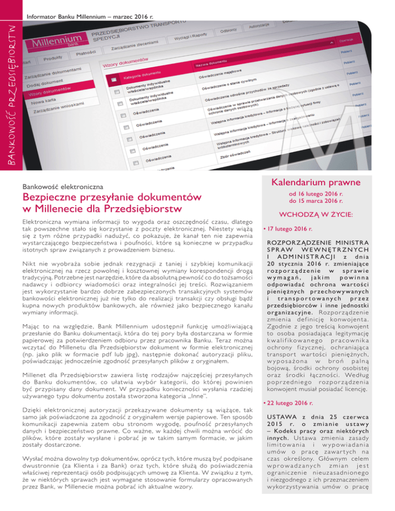 BANKOWOŚĆ PRZ EDSIĘBIORSTW Informator Banku Millennium – marzec 2016 r. Bankowość elektroniczna Bezpieczne przesyłanie dokumentów w Millenecie dla Przedsiębiorstw Elektroniczna wymiana informacji to wygoda oraz oszczędność czasu, dlatego tak powszechne stało się korzystanie z poczty elektronicznej. Niestety wiążą się z tym różne przypadki nadużyć, co pokazuje, że kanał ten nie zapewnia wystarczającego bezpieczeństwa i poufności, które są konieczne w przypadku istotnych spraw związanych z prowadzeniem biznesu. Nik t nie w yobraża sobie jednak rezygnacji z taniej i szybkiej komunikacji elektronicznej na rzecz powolnej i kosztownej wymiany korespondencji drogą tradycyjną. Potrzebne jest narzędzie, które da absolutną pewność co do tożsamości nadawcy i odbiorcy wiadomości oraz integralności jej treści. Rozwiązaniem jest wykorzystanie bardzo dobrze zabezpieczonych transakcyjnych systemów bankowości elektronicznej już nie tylko do realizacji transakcji czy obsługi bądź kupna nowych produktów bankowych, ale również jako bezpiecznego kanału wymiany informacji. Mając to na względzie, Bank Millennium udostępnił funkcję umożliwiającą przesłanie do Banku dokumentacji, która do tej pory była dostarczana w formie papierowej za potwierdzeniem odbioru przez pracownika Banku. Teraz można wczy tać do Millenetu dla Przedsiębiorstw dokument w formie elektronicznej (np. jako plik w formacie pdf lub jpg), następnie dokonać autor yzacji pliku, poświadczając jednocześnie zgodność przesyłanych plików z oryginałem. Millenet dla Pr zedsiębiorstw zawiera listę rodzajów najczęściej pr zesyłanych do Banku dokumentów, co ułatwia w ybór kategorii, do k tórej powinien być przypisany dany dokument. W przypadku konieczności wysłania rzadziej używanego typu dokumentu została stworzona kategoria „Inne”. Kalendarium prawne od 16 lutego 2016 r. do 15 marca 2016 r. WCHODZĄ W ŻYCIE: •17 lutego 2016 r. ROZPOR Z ĄDZENIE MINISTR A S P R AW W E W N Ę T R Z N YC H I A D M I N I S T R AC J I z d n i a 20 stycznia 2016 r. zmieniające rozpor z ądzenie w spr awie wymagań, jakim powinna odpowiadać ochrona war tości pienię żnych pr zechow y w anych i transpor towanych pr zez przedsiębiorców i inne jednostki org aniz ac yjne . Rozpor z ądze nie z m ie nia d ef inicj ę ko nwoje n t a . Zgodnie z jego treścią konwojent to osoba posiadająca legitymację k walif ikowanego pr acownik a ochrony f iz yc znej, ochr aniająca tr anspor t war tości pieniężnych, w yposa żona w broń palną bojową, środki ochrony osobistej or a z środk i ł ąc zności. Wed ł ug p o p r ze d n i e g o r oz p o r z ą d ze n i a konwojent musiał posiadać licencję. •22 lutego 2016 r. Dzięki elek tronicznej autor yzacji pr zekazy wane dokumenty są wiążące, tak samo jak poświadczone za zgodność z oryginałem wersje papierowe. Ten sposób komunikacji zapewnia zatem obu stronom w ygodę, poufność pr zesyłanych danych i bezpieczeństwo prawne. Co ważne, w każdej chwili można wrócić do plików, k tóre został y wysłane i pobrać je w takim samym formacie, w jakim zostały dostarczone. Wysłać można dowolny typ dokumentów, oprócz tych, które muszą być podpisane dwustronnie (za Klienta i za Bank) oraz tych, k tóre służą do poświadczenia właściwej reprezentacji osób podpisujących umowę za Klienta. W związku z tym, że w niektórych sprawach jest wymagane stosowanie formularzy opracowanych przez Bank, w Millenecie można pobrać ich aktualne wzory. U STAWA z dnia 25 c zer wc a 2 015 r. o z m i a n i e u s t aw y – Kodeks pracy oraz niektórych innych. Us tawa zmienia zasady limitowania i w ypowiadania umów o pr acę z aw a r t ych na czas określony. G łównym celem wprowadzanych zmian jes t og r a nic ze nie nie u z a s ad nionego i niezgodnego z ich przeznaczeniem w ykor zysty wania umów o pracę Nowa ścieżka komunikacji może być szczególnie interesująca dla Klientów, którzy korzystają w Banku z finansowania i – na podstawie umów kredytowych – są zobligowani do cyklicznego dostarczania dokumentów finansowych. Znacznie przyspieszy ona cały proces. W celu uruchomienia nowej funkcji w ystarczy w ype łnić jednostronicow y formular z def iniujący uprawnienia uż y tkowników oraz zasady autor yzacji przesyłek. W pr z ypadku zainteresowania nową funkcją bezpiec znego pr zesył ania dokumentów za pośrednictwem systemu Millenet dla Przedsiębiorstw, prosimy o kontakt ze swoim Doradcą lub Helpdeskiem bankowości elektronicznej pod numerem 810 632 632 lub 22 598 40 31. Zapraszamy również do odwiedzenia naszej strony internetowej www.bankmillennium.pl, sekcja „Przedsiębiorstwa”, gdzie znaleźć można więcej informacji na temat produktów i usług oferowanych przez Bank Millennium. na czas określony. Zmiany dotyczą również okresów w ypowiedzenia – te same okresy wypowiedzenia będą miał y zastosowanie do umów o pracę na czas określony i nieok r eś lony. N a pods t aw ie nowego ar t . 36 § 1 Kodek su pracy zarówno umowa o pracę na czas określony, jak i nieokreślony będą mog ł y być w ypowiedziane pr zez pr acodawcę i pr zez pracownika z zachowaniem okresu w ypowiedzenia, k tórego długość (dla umów na czas nieokreślony i ok reślony) będzie uzależniona od zakładowego stażu pracy. Prognozy makroekonomiczne Szansa na wzrost notowań złota na światowych rynkach w 2016 roku Rok 2015 nie był udany dla notowań złota, k tóre potaniało w ciągu roku o ponad 12% , osią gając 5 -letnie minimum na poziomie 1045 USD za uncję. Jednocześnie był to trzeci z rzędu rok spadku war tości tego surowca. I m p u ls e m d o p r ze ce ny k r u s zcu w 2015 roku była normalizacja polityki pieniężnej w Stanach Zjednoczonych skutkująca umocnieniem dolar a amerykańskiego, waluty używanej do kwotowań na rynkach surowcowych. Nie bez znaczenia była też niska inflac