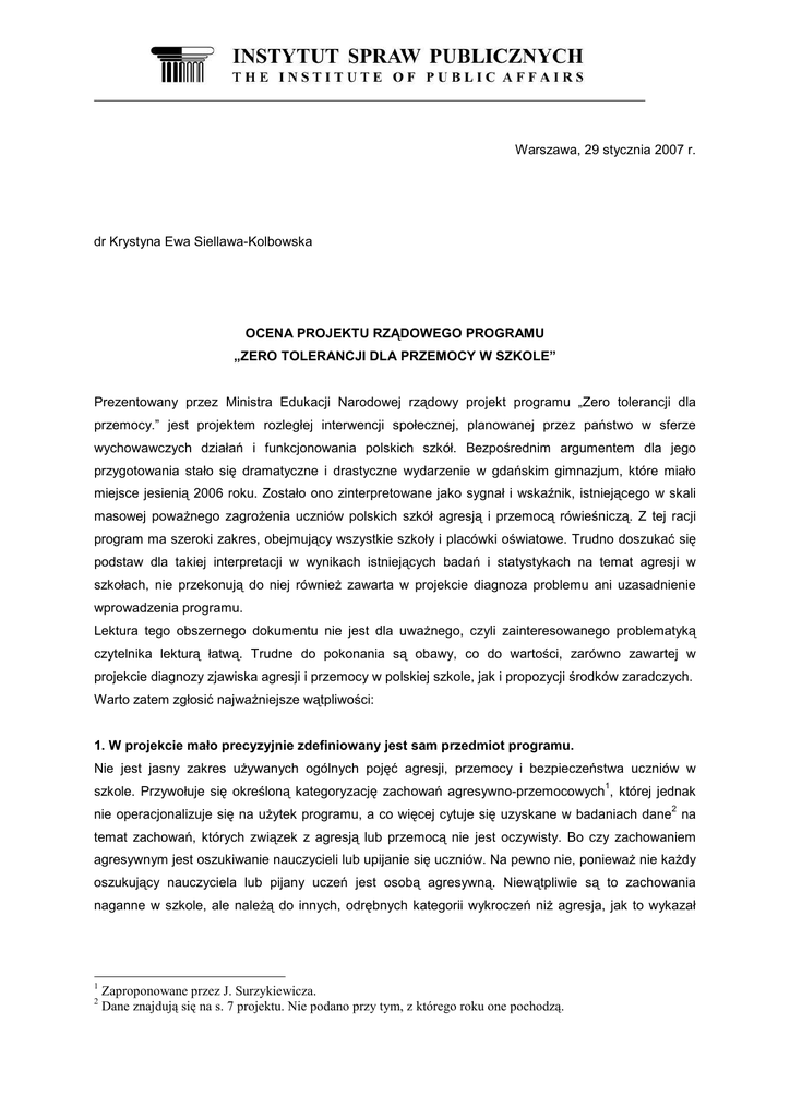 Warszawa, 29 stycznia 2007 r. dr Krystyna Ewa Siellawa-Kolbowska OCENA PROJEKTU RZĄDOWEGO PROGRAMU „ZERO TOLERANCJI DLA PRZEMOCY W SZKOLE” Prezentowany przez Ministra Edukacji Narodowej rządowy projekt programu „Zero tolerancji dla przemocy.” jest projektem rozległej interwencji społecznej, planowanej przez państwo w sferze wychowawczych działań i funkcjonowania polskich szkół. Bezpośrednim argumentem dla jego przygotowania stało się dramatyczne i drastyczne wydarzenie w gdańskim gimnazjum, które miało miejsce jesienią 2006 roku. Zostało ono zinterpretowane jako sygnał i wskaźnik, istniejącego w skali masowej poważnego zagrożenia uczniów polskich szkół agresją i przemocą rówieśniczą. Z tej racji program ma szeroki zakres, obejmujący wszystkie szkoły i placówki oświatowe. Trudno doszukać się podstaw dla takiej interpretacji w wynikach istniejących badań i statystykach na temat agresji w szkołach, nie przekonują do niej również zawarta w projekcie diagnoza problemu ani uzasadnienie wprowadzenia programu. Lektura tego obszernego dokumentu nie jest dla uważnego, czyli zainteresowanego problematyką czytelnika lekturą łatwą. Trudne do pokonania są obawy, co do wartości, zarówno zawartej w projekcie diagnozy zjawiska agresji i przemocy w polskiej szkole, jak i propozycji środków zaradczych. Warto zatem zgłosić najważniejsze wątpliwości: 1. W projekcie mało precyzyjnie zdefiniowany jest sam przedmiot programu. Nie jest jasny zakres używanych ogólnych pojęć agresji, przemocy i bezpieczeństwa uczniów w 1 szkole. Przywołuje się określoną kategoryzację zachowań agresywno-przemocowych , której jednak 2 nie operacjonalizuje się na użytek programu, a co więcej cytuje się uzyskane w badaniach dane na temat zachowań, których związek z agresją lub przemocą nie jest oczywisty. Bo czy zachowaniem agresywnym jest oszukiwanie nauczycieli lub upijanie się uczniów. Na pewno nie, ponieważ nie każdy oszukujący nauczyciela lub pijany uczeń jest osobą agresywną. Niewątpliwie są to zachowania naganne w szkole, ale należą do innych, odrębnych kategorii wykroczeń niż agresja, jak to wykazał 1 2 Zaproponowane przez J. Surzykiewicza. Dane znajdują się na s. 7 projektu. Nie podano przy tym, z którego roku one pochodzą. Instytut Spraw Publicznych 3 prof. K. Konarzewski w empirycznej analizie struktury uczniowskich wykroczeń . Warto przywołać wyniki jego analizy, gdyż mogą pomóc uporządkować myślenie na temat zachowań agresywnych w szkole. W wyniku analizy wśród szesnastu różnego rodzaju zachowań nagannych występujących w szkole wyraźnie wyodrębniły się trzy kategorie: - agresja: bicie, prześladowanie i poniżanie kolegów, kradzież, wymuszanie pieniędzy i rzeczy, wandalizm, rozsiewanie plotek o nauczycielu, ordynarne odnoszenie się do nauczycieli, groźby, popychanie nauczyciela, obrzucanie go przedmiotami. - odurzanie się: zażywanie narkotyków, rozprowadzanie narkotyków, picie alkoholu, - nieposłuszeństwo wobec norm świata dorosłych: wagarowanie, spóźnianie się na lekcje, palenie papierosów, nieodrabianie prac domowych, złośliwe przeszkadzanie na lekcjach. Warto zacytować wniosek sformułowany wówczas przez prof. K. Konarzewskiego: ”istota odkrycia polega na odróżnieniu wykroczeń świadczących o demoralizacji od wykroczeń będących normalną (choć drażniącą nas, dorosłych) cechą okresu dorastania. Problemy wychowawcze swoiste dla 4 gimnazjum należą głównie do tej kategorii ”. Brak takiego rozróżnienia pomiędzy różnego rodzaju nagannymi zachowaniami uczniów jest poważna słabością koncepcji programu. 2. W sposobie przedstawienia oraz uzasadnienia celów i założeń programu w projekcie dominuje perswazyjny język. Używanie określeń „powszechne” (inaczej „masowe”) w stosunku do zjawisk agresji i przemocy w odniesieniu do całego społeczeństwa polskiego, jak i środowisk uczniowskich jest semantycznym nadużyciem. Taki język buduje w świadomości społecznej obraz świata zagrażającego i spatologizowanego, pełnego wszechobecnego zła. Tworzy społeczny klimat lęku, podejrzliwości, zamiast klimatu spokojnej, otwartej debaty nad rozwiązaniem poważnych, ale nie powszechnych problemów związanych z występowaniem zachowań agresywnych uczniów w szkole i poza nią. 3. Perswazyjnemu językowi towarzyszy mało rzetelne prezentowanie danych na temat przyczyn, zasięgu i rodzaju agresji młodych ludzi uczących się w różnego typu szkołach. Nieliczne, wybrane i 5 zaprezentowane w projekcie dane dla specjalisty są po prostu nietrafne i nierzetelne, dla niespecjalisty mogą być mylące, bo wskazują na ważne i fundamentalne instytucje społeczne, takie jak szkoły czy media jako rozsadniki zła i demoralizacji młodych ludzi. Uważna lektura pkt. II projektu pt. „Diagnoza problemu agresji i przemocy w środowisku szkolnym” oraz pkt. III. pt. „Charakterystyka zjawiska agresji i przemocy” dobitnie przekonuje o niespójnym i słabo udokumentowanym obrazie problemu agresji, przemocy i bezpieczeństwa w polskich szkołach. 3 K. Konarzewski, Kształcenie i wychowanie w szkołach podstawowych i gimnazjach w roku szkolnym 2002/2003, ISP, Warszawa 2004, s. 41-47. 4 K. Konarzewski, Kształcenie i wychowanie w szkołach podstawowych i gimnazjach w roku szkolnym 2002/2003, ISP, Warszawa 2004, s.73. 5 Patrz. tabela nr 1 na s. 5 lub opis gier komputerowych na s. 44 lub charakterystyka mediów na s. 43. Ocena rządowego programu „Zero tolerancji dla przemocy w szkole” 2 Instytut Spraw Publicznych 4. Czy może być zatem skuteczna terapia oparta na niestarannej i błędnej diagnozie? Nie może. Tej słabości nie zaradzi ani wielka liczba zawartych w projekcie wskazań co do rozlicznych obszarów działań, ani szeroko zaplanowana korelacja programu z innymi programami i strategiami rządowymi, ani zabezpieczenie środków na jego re