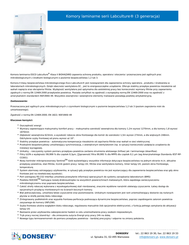 Komory laminarne serii Labculture® (3 generacja) Komora laminarna ESCO Labculture® Klasa II BIOHAZARD zapewnia ochronę produktu, operatora i otoczenia i przeznaczona jest ogólnych prac mikrobiologicznych z środkami biologicznymi o poziomie bezpieczeństwa 1,2 lub 3. Komora II klasy bezpieczeństwa mikrobiologicznego Esco Labculture® jest rozwiązaniem dla zapewnienia ochrony operatora , produktu i środowiska w laboratoriach mikrobiologicznych. Dzięki obecności wentylatora EC , jest to energooszczędne urządzenie. Oferuje stabilny przepływ powietrza niezależnie od wahań napięcia oraz obciążenia filtrów. Wydajność wentylatora jest optymalna dla wieloletniej pracy bez konieczności wymiany filtrów przy zapewnieniu zgodnych z normą EN 12469:2000 przepływów powietrza. Posiada certyfikat na zgodność z europejską normą EN 12469:2000 oraz na zgodność z amerykańskim standardem NSF/ANSI 49. Wszystkie zewnętrzne i wewnętrzne elementy malowane posiadają powłokę antybakteryjną. Zastosowanie: Przeznaczona jest ogólnych prac mikrobiologicznych z czynnikami biologicznymi o poziomie bezpieczeństwa 1,2 lub 3 (poziom zagrożenia niski do umiarkowanego). Zgodność z normą EN 12469:2000; EN 1822; NSF/ANSI 49 Kluczowe korzyści: Oszczędność energii Wymiary zapewniające maksymalny komfort pracy – maksymalna szerokość wewnętrzna dla komory 1,2m wynosi 1270mm, a dla komory 1,8 wynosi 1870mm Głębokość wewnętrzna 623mm, a wysokość robocza okna frontowego dla komór do szerokości 1,5m wynosi 274mm, a dla większych 248mm. Odchylenie szyby frontowej od pionu wynosi aż 10°. Stabilny przepływ powietrza – automatyczna kompensacja niezależnie od zapchania filtrów oraz wahań w sieci elektrycznej Przekaźnik bezpotencjałowy umożliwiający synchronizację, z zewnętrznym wentylatorem (np. w sytuacji konieczności podpięcia urządzenia do instalacji wyciągowej. Unikalny – rzeczywisty system pomiaru przepływu powietrza zarówno strumienia wlotowego (Inflow) jak i laminarnego (downflow). Filtry ULPA o wydajności 99,999 % dla cząstek 0,3μm, sprawność filtra 99,995 % dla MPPS dla cząstek 0,1 μm (wg Amerykańskiego Standardu IEST-RPCC001). Nowy kontroler mikroprocesorowy SentinelTM Gold wyświetlajacy wszystkie informacje dotyczące bezpieczeństwa na jednym ekranie m.in. aktualne przepływy powietrza, stan filtrów, licznik godzin pracy: lampy UV, filtrów oraz wentylatora komory, timer lampy UV, poziom okna frontowego, temperaturę. System alarmowy ostrzegający użytkownika, w sytuacji gdy przepływ powietrza nie jest wystarczający dla zapewnienia bezpieczeństwa oraz gdy okno frontowe jest na niewłaściwej wysokości. Port szeregowy RS-232 Interfejs umożliwia przesyłanie informacji operacyjnych do systemu zarządzania laboratorium (BMS) Powłoka ISOCIDETM hamująca rozwój drobnoustrojów na wszystkich powierzchniach malowanych, która zapobiega zanieczyszczeniu mikrobiologicznemu oraz poprawia bezpieczeństwo. Całość strefy roboczej wykonana z wysokogatunkowej stali nierdzewnej, znacznie wyoblone narożniki ułatwiają czyszczenie. Łatwy dostęp do opcjonalnych przyłączy montowanych na ścianach bocznych komory. Blat jednoczęściowy, umożliwia łatwe czyszczenie oraz poziomowanie. Unikalnym rozwiązaniem jest rant uniemożliwiający dostanie się rozlanych płynów w strefę poniżej blatu roboczego Zintegrowany podłokietnik oraz wypukła frontowa perforacja podnosząca dynamiczne bezpieczeństwo, poprzez zapobieganie zatorom powietrza zasysanego do komory (INFLOW). Szyba frontowa ukośna względem blatu roboczego, regulowana manualnie (lob opcjonalnie elektrycznie), z funkcją pełnego zamykania do aktywacji lampy UV. Nastawne przez użytkownika zabezpieczenie hasłem w celu uniemożliwienia pracy osobom niepowołanym. Tryb pracy nocnej /stand-by/ – dla zmieszenia zużycia Energii przy pracy 24h na dobę. Nowego typu termoanemometr do pomiaru przepływu powietrza – bardziej precyzyjny i odporne na zmiany położenia. DONSERV ul. Spisaka 31, 02-495 Warszawa tel.: 22 863 19 30, fax: 22 863 19 33 [email protected], www.donserv.pl Wbudowany system oświetlenia (5000 k) o ciepłej barwie światła zapewnia doskonałe oświetlenie strefy pracy i zmniejsza zmęczenie operatora. QuickStart ™ - system natychmiastowego startu pracy wentylatora po ustawieniu szyby w położeniu roboczym. Pomimo swoich wymiarów komora posiada elementy, które można zdemontować, aby zmieściła się w drzwi o szerokości 800mm. Wymiary Typ zewnętrzne No. (mm) bez podłokietnika LA2- 1115 x 815 x 1540 Wymiary zewnętrzne Wymiary Prędkość Prędkość (mm) wewnętrzne przepływu przepływu z podłokietnikiem (mm) (Inflow) (Downflow) 1115 x 852 x 1540 970 x 623 x 670 0.53 m/s 0.35 m/s 3A1-E Zasilanie 230 V 50 Hz LA2- 1420 x 815 x 1540 1420 x 852 x 1540 1270 x 623 x 670 0.53 m/s 0.35 m/s 4A1-E 230 V 50 Hz LA2- 1725 x 815 x 1540 1725 x 852 x 1540 1570 x 623 x 670 0.53 m/s 0.35 m/s 5A1-E 230 V 50 Hz LA2- 2030 x 815 x 1540 2030 x 852 x 1540 1870 x 623 x 670 0.53 m/s 0.33 m/s 6A1-E 230 V 50 Hz LA2- 2600 x 815 x 1540 2600 x 852 x 1540 2440 x 623 x 670 0.53 m/s 8A1-E 0.33 m/s 230 V 50 Hz Producent: ESCO Micro Pte. Ltd. - Singapur Link do pliku źródłowego DONSERV ul. Spisaka 31, 02-495 Warszawa tel.: 22 863 19 30, fax: 22 863 19 33 [email protected], www.donserv.pl