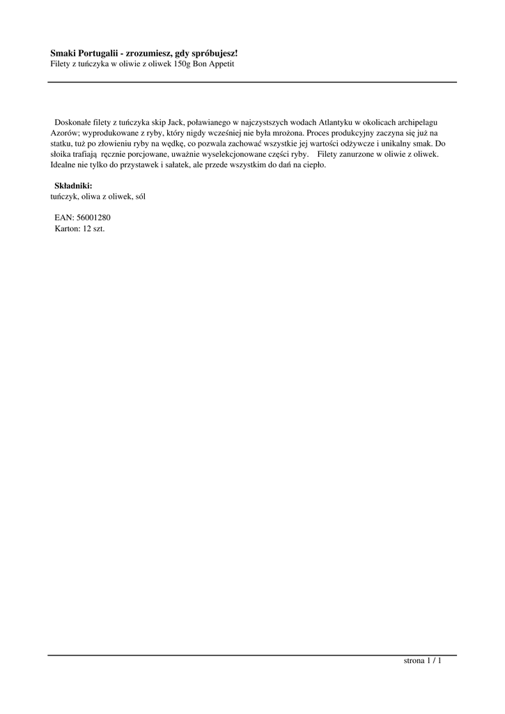 Smaki Portugalii - zrozumiesz, gdy spróbujesz! Filety z tuńczyka w oliwie z oliwek 150g Bon Appetit Doskonałe filety z tuńczyka skip Jack, poławianego w najczystszych wodach Atlantyku w okolicach archipelagu Azorów; wyprodukowane z ryby, który nigdy wcześniej nie była mrożona. Proces produkcyjny zaczyna się już na statku, tuż po złowieniu ryby na wędkę, co pozwala zachować wszystkie jej wartości odżywcze i unikalny smak. Do słoika trafiają ręcznie porcjowane, uważnie wyselekcjonowane części ryby. Filety zanurzone w oliwie z oliwek. Idealne nie tylko do przystawek i sałatek, ale przede wszystkim do dań na ciepło. Składniki: tuńczyk, oliwa z oliwek, sól EAN: 56001280 Karton: 12 szt. strona 1 / 1