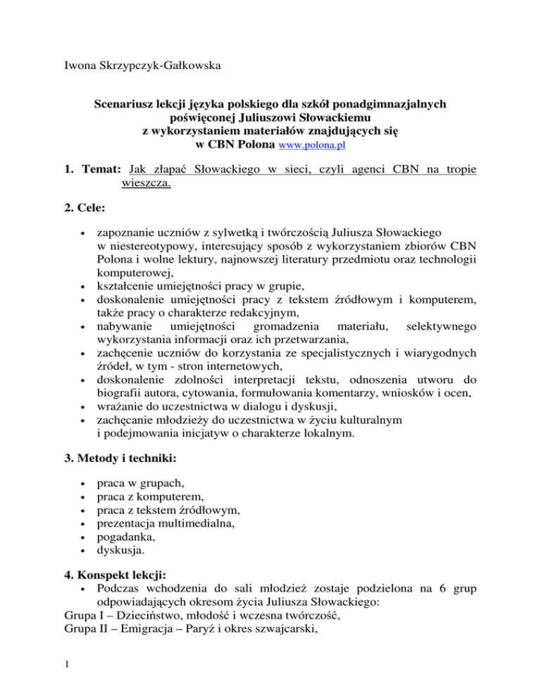 Iwona Skrzypczyk-Gałkowska Scenariusz lekcji języka polskiego dla szkół ponadgimnazjalnych poświęconej Juliuszowi Słowackiemu z wykorzystaniem materiałów znajdujących się w CBN Polona www.polona.pl 1. Temat: Jak złapać Słowackiego w sieci, czyli agenci CBN na tropie wieszcza. 2. Cele: • • • • • • • • zapoznanie uczniów z sylwetką i twórczością Juliusza Słowackiego w niestereotypowy, interesujący sposób z wykorzystaniem zbiorów CBN Polona i wolne lektury, najnowszej literatury przedmiotu oraz technologii komputerowej, kształcenie umiejętności pracy w grupie, doskonalenie umiejętności pracy z tekstem źródłowym i komputerem, także pracy o charakterze redakcyjnym, nabywanie umiejętności gromadzenia materiału, selektywnego wykorzystania informacji oraz ich przetwarzania, zachęcenie uczniów do korzystania ze specjalistycznych i wiarygodnych źródeł, w tym - stron internetowych, doskonalenie zdolności interpretacji tekstu, odnoszenia utworu do biografii autora, cytowania, formułowania komentarzy, wniosków i ocen, wrażanie do uczestnictwa w dialogu i dyskusji, zachęcanie młodzieży do uczestnictwa w życiu kulturalnym i podejmowania inicjatyw o charakterze lokalnym. 3. Metody i techniki: • • • • • • praca w grupach, praca z komputerem, praca z tekstem źródłowym, prezentacja multimedialna, pogadanka, dyskusja. 4. Konspekt lekcji: • Podczas wchodzenia do sali młodzież zostaje podzielona na 6 grup odpowiadających okresom życia Juliusza Słowackiego: Grupa I – Dzieciństwo, młodość i wczesna twórczość, Grupa II – Emigracja – Paryż i okres szwajcarski, 1 Grupa III – Emigracja – okres podróży na Wschód, Grupa IV– powrót z podróży do Paryża – fascynacja towianizmem, Grupa V – Paryż – filozofia genezyjska, Grupa VI – Śmierć, pogrzeb, pamięć współczesnych i potomnych. • Członkowie grup siadają przy stanowiskach komputerowych oznaczonych numerem grupy. • Nauczyciel zapoznaje uczniów z tematem i celami lekcji. • Informuje ich, że na dzisiejszych zajęciach będą wcielać się w agentów, którzy, wykorzystując wskazane teksty źródłowe, materiały ikonograficzne oraz te, które można znaleźć w CBN Polona, ustalą, kim był i czym się zajmował wieszcz polski – Juliusz Słowacki. Dalsze wskazówki uczniowie znajdą w kopertach, które leżą na ich stanowiskach pracy. • Uczniowie pracują w grupach zgodnie z instrukcjami zawartymi w kopertach. • Po upływie danego czasu liderzy kolejnych grup przedstawiają pozostałym uczniom wyniki swojej pracy – prezentacje multimedialne. W ten sposób powstaje ciągła „opowieść” prezentująca sylwetkę twórczą Juliusza Słowackiego. • Nauczyciel podsumowuje pracę uczniów i przypomina, że rok 2009 został uznany przez Sejm polski za Rok Słowackiego, ponieważ na ten rok przypada dwusetna rocznica urodzin wieszcza, a zarazem sto sześćdziesiąta rocznica jego śmierci. W związku z tym w kraju organizowane są liczne przedsięwzięcia, tj. np. projekt „Maska Słowackiego”. • Korzystając z strony internetowej „Gazety wyborczej”, uczniowie zapoznają się z Instalacją poetycką „Maska Słowackiego”, w tym z dedykacjami współczesnych poetów polskich poświęconych wieszczowi. • Nauczyciel inicjuje krótką dyskusję nad potrzebą i oceną tego przedsięwzięcia. • Podsumowaniem lekcji powinna być wspólna konkluzja, że młodzież też chciałaby włączyć się w obchody jubileuszu. • W związku z tym nauczyciel zadaje pracę domową: ➔ dla chętnego ucznia - informatyka: Nadaj prezentacjom powstałym podczas lekcji formę jednego spójnego dokumentu. ➔ dla wszystkich: Przygotuj własną, autorską propozycję włączenia się młodzieży w obchody Roku Słowackiego. 5. Wykorzystanie środków dydaktycznych: • 2 Chmielewski P., Słowacki w supermarkecie. Szkice o polskim dramacie, Gdańsk 2002, s. 5 • filozofia genezyjska (definicja), [w:] http://www.culture.pl/pl/culture/artykuly/os_slowacki_juliusz • Instalacja poetycka „Maska Słowackiego”, [w:] http://wyborcza.pl/5,101967,7088627,Wspolczesni_poeci_w_holdzie_Slowackiemu.ht ml • Kowalczykowa A., Słowacki, Warszawa 1994, s. 389 Słowacki J., Bo mię matka moja miła…, [w:] • • • http://www.wolnelektury.pl/katalog/lektura/bo-mie-matka-moja-mila.html Słowacki J., Hymn, [w:] http://www.wolnelektury.pl/katalog/lektura/hymn-ozachodzie-slonca-na-morzu.html Słowacki J., Kordian, [w:] http://www.wolnelektury.pl/katalog/lektura/kordian.html • Słowacki J., Pagórkowaty brzeg morski, Pejzaż nad Nilem, Wąwóz wśród gór, (Rysunki Słowackiego z „Albumu podróży na Wschód”), [w:] Ławski J., Ironia i mistyka. Doświadczenia graniczne wyobraźni poetyckiej Juliusza Słowackiego, Białystok 2005 Słowacki J., Pamiętnik (fragment), [w:] Bychowski G., Słowacki i jego dusza. Studium psychoanalityczne, wstęp i oprac. D. Danek, Kraków 2002, s. 157, 167 Słowacki J., Testament mój, [w:] • http://www.wolnelektury.pl/katalog/lektura/testament-moj.html Towianizm (definicja), [w:] http://sjp.pwn.pl/haslo.php?id=2530203 • • 6. Wykorzystanie materiałów, które można znaleźć w CBN Polona www.polona.pl: • Apoteoza Słowackiego, reprodukcja obrazu Antoniego Gawińskiego [...] [Dokument ikonograficzny], [w:] http://www.polona.pl/dlibra/doccontent2?id=17739&from=&from=generalsearch&dir ids=1&lang=pl • Apoteoza Słowackiego, K. Górski [Dokument ikonograficzny], [w:] http://www.polona.pl/dlibra/doccontent2?id=17737&from=&from=generalsearch&dir ids=1&lang=pl • Apoteoza Słowackiego, reprodukcja obrazu Józefa Rapackiego [...] [Dokument ikonograficzny] Apoteoza Słowackiego, reprodukcja obrazu Józefa Rapackiego [...] [Dokument ikonograficzny], [w:] http://www.polona.pl/dlibra/doccontent2?id=17745&from=&from=generalsearch&dir ids=1&lang=pl • Apoteoza Słowackiego, reprodukcja obrazu Juliusza Zubera [...] [D