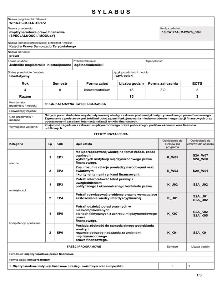 SYLABUS Nazwa programu kształcenia: WPiA-P-JM-O-N-16/17Z Nazwa przedmiotu: Kod przedmiotu: międzynarodowe prawo finansowe (SPECJALNOŚCI / MODUŁY) 10.0WI27AJMJ2576_60N Nazwa jednostki prowadzącej przedmiot / moduł: Katedra Prawa Samorządu Terytorialnego Nazwa kierunku: prawo Forma studiów: Profil kształcenia: Specjalność: Jednolite magisterskie, niestacjonarne ogólnoakademicki Status przedmiotu / modułu: Język przedmiotu / modułu: język polski fakultatywny Rok Semestr Forma zajęć Liczba godzin Forma zaliczenia ECTS 4 8 konwersatorium 15 ZO 3 Razem Koordynator przedmiotu / modułu: 15 3 dr hab. KATARZYNA ŚWIĘCH-KUJAWSKA Prowadzący zajęcia: Cele przedmiotu / modułu: Wymagania wstępne: Nabycie przez studentów usystematyzowanej wiedzy z zakresu problematyki międzynarodowego prawa finansowego. Zapoznanie z podstawowymi źródłami dotyczącymi funkcjonowania międzynarodowych organizacji finansowych oraz podstawowymi zasadami internacjonalizacji rynków finansowych. Znajomość zagadnień z zakresu: międzynarodowego prawa publicznego, podstaw ekonomii oraz finansów publicznych. EFEKTY KSZTAŁCENIA Kategoria Lp Odniesienie do efektów dla programu Odniesienie do efektów dla obszaru KOD Opis efektu 1 EP1 Ma uporządkowaną wiedzę na temat źródeł, zasad ogólnych i wybranych instytucji międzynarodowego prawa finansowego. K_W05 S2A_W07 S2A_W08 2 EP2 Zna i rozumie relacje pomiędzy narodowymi oraz światowym i kontynentalnymi rynkami finansowymi. K_W03 S2A_W01 K_U02 S2A_U02 K_U01 S2A_U01 S2A_U02 EP5 Potrafi udzielać porad prawnych w nieskomplikowanych stanach faktycznych z zakresu międzynarodowego prawa finansowego. K_K07 S2A_K02 S2A_K05 EP6 Posiada zdolność do samodzielnego pogłębiania wiedzy i rozumie potrzebę nadążania za zmianami międzynarodowego prawa finansowego. K_K01 S2A_K01 Semestr Liczba godzin wiedza 1 EP3 2 EP4 Potrafi interpretować tekst prawny z uwzględnieniem politycznego i ekonomicznego kontekstu prawa. umiejętności 1 Potrafi rozwiązywać problemy prawne wymagające zastosowania wiedzy interdyscyplinarnej. kompetencje społeczne 2 TREŚCI PROGRAMOWE Przedmiot: międzynarodowe prawo finansowe Forma zajęć: konwersatorium 1. Międzynarodowe instytucje finansowe o zasięgu światowym oraz europejskim. 8 1 1/3 2. Stosunki monetarne i podstawy unii walutowych. 8 1 3. Międzynarodowe stosunki walutowe, bankowe i finansowe. 8 2 4. Problem zadłużenia międzynarodowego. 8 1 5. Międzynarodowe stosunki podatkowe. 8 2 6. Oazy podatkowe i bankowe. 8 2 7. Międzynarodowa pomoc finansowa. 8 2 8. Lokowanie inwestycji zagranicznych. 8 1 9. Międzynarodowe stosunki pożyczkowe. 8 1 10. Światowy kryzys finansowy i metody jego przezwyciężania. 8 2 Metody kształcenia Prezentacja multimedialna. Analiza tekstów z dyskusją. Nr efektu kształcenia z sylabusa Metody weryfikacji efektów kształcenia SPRAWDZIAN Zaliczenie pisemne z oceną. Ocena końcowa jest oceną z testu końcowego złożonego z 15 pytań jednokrotnego wyboru. Student wybiera dla każdego zagadnienia 1 odpowiedź spośród proponowanych 3 wersji. Każda prawidłowa odpowiedź umożliwia uzyskanie 1 punktu. Prawidłowo rozwiązany test umożliwia uzyskanie 15 punktów. Zasady oceniania testu są następujące: - 15 pkt; bardzo dobry, - 14 pkt; dobry plus, Forma i warunki zaliczenia - 12-13 pkt; dobry, - 10-11 pkt; dostateczny plus, - 9 pkt; dostateczny, - poniżej 9 pkt; ocena niedostateczny. Zasady wyliczania oceny z przedmiotu Ocenę z przedmiotu stanowi 100% oceny z zaliczenia. Chrabonszczewska E. (2005): Międzynarodowe organizacje finansowe, Szkoła Główna Handlowa. Oficyna Wydawnicza Warszawa Literatura podstawowa Jakubczyc J. (2012): Finanse międzynarodowe, Wolters Kluwer Kosikowski C. (2014): Finanse i prawo finansowe Unii Europejskiej, Wolters Kluwer Warszawa Bacia B., Zawidzka A. (2011): Swoboda przepływu kapitału i usługi finansowe w Unii Europejskiej, Instytut Wydawniczy EuroPrawo Literatura uzupełniająca Głuchowski J. (red.) (2010): System prawa finansowego. Tom IV. Prawo walutowe. Prawo dewizowe. Prawo rynku kapitałowego, Wolters Kluwer Nowak-Far A. (2011): Unia gospodarcza i walutowa w Europie, Instytut Wydawniczy EuroPrawo NAKŁAD PRACY STUDENTA Liczba godzin Zajęcia dydaktyczne 15 Udział w egzaminie/zaliczeniu 1 Przygotowanie się do zajęć 10 Studiowanie literatury 24 Udział w konsultacjach 10 Przygotowanie projektu / eseju / itp. 0 Przygotowanie się do egzaminu/zaliczenia 15 Inne 0 2/3 ŁĄCZNY nakład pracy studenta w godz. 75 Liczba punktów ECTS 3 3/3