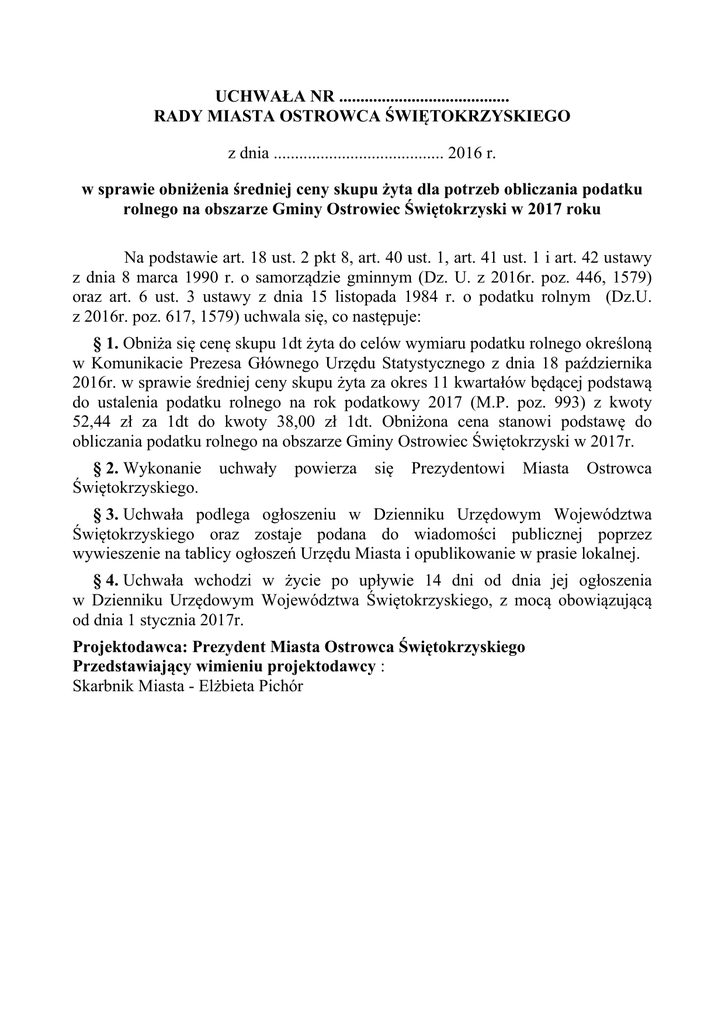 UCHWAŁA NR ........................................ RADY MIASTA OSTROWCA ŚWIĘTOKRZYSKIEGO z dnia ........................................ 2016 r. w sprawie obniżenia średniej ceny skupu żyta dla potrzeb obliczania podatku rolnego na obszarze Gminy Ostrowiec Świętokrzyski w 2017 roku Na podstawie art. 18 ust. 2 pkt 8, art. 40 ust. 1, art. 41 ust. 1 i art. 42 ustawy z dnia 8 marca 1990 r. o samorządzie gminnym (Dz. U. z 2016r. poz. 446, 1579) oraz art. 6 ust. 3 ustawy z dnia 15 listopada 1984 r. o podatku rolnym (Dz.U. z 2016r. poz. 617, 1579) uchwala się, co następuje: § 1. Obniża się cenę skupu 1dt żyta do celów wymiaru podatku rolnego określoną w Komunikacie Prezesa Głównego Urzędu Statystycznego z dnia 18 października 2016r. w sprawie średniej ceny skupu żyta za okres 11 kwartałów będącej podstawą do ustalenia podatku rolnego na rok podatkowy 2017 (M.P. poz. 993) z kwoty 52,44 zł za 1dt do kwoty 38,00 zł 1dt. Obniżona cena stanowi podstawę do obliczania podatku rolnego na obszarze Gminy Ostrowiec Świętokrzyski w 2017r. § 2. Wykonanie Świętokrzyskiego. uchwały powierza się Prezydentowi Miasta Ostrowca § 3. Uchwała podlega ogłoszeniu w Dzienniku Urzędowym Województwa Świętokrzyskiego oraz zostaje podana do wiadomości publicznej poprzez wywieszenie na tablicy ogłoszeń Urzędu Miasta i opublikowanie w prasie lokalnej. § 4. Uchwała wchodzi w życie po upływie 14 dni od dnia jej ogłoszenia w Dzienniku Urzędowym Województwa Świętokrzyskiego, z mocą obowiązującą od dnia 1 stycznia 2017r. Projektodawca: Prezydent Miasta Ostrowca Świętokrzyskiego Przedstawiający wimieniu projektodawcy : Skarbnik Miasta - Elżbieta Pichór UZASADNIENIE do uchwały w sprawie obniżenia średniej ceny skupu żyta stanowiącej podstawę do obliczeń podatku rolnego na rok 2017 Na podstawie art. 1 oraz art 6 ust.2 ustawy z dnia 15 listopada 1984r. o podatku rolnym (Dz. U. z 2016r poz.617 z późn. zm.) opodatkowanie podatkiem rolnym podlegają grunty sklasyfikowane w ewidencji gruntów i budynków jako użytki rolne, z wyjątkiem gruntów zajętych na prowadzenie działalności gospodarczej innej niż działalność rolnicza. Podstawę opodatkowania podatkiem rolnym stanowi: 1. Dla gruntów rolnych - liczba hektarów przeliczeniowych ustalona na podstawie powierzchni, rodzaju i klasy użytków rolnych wynikających z ewidencji gruntów i budynków 2. Dla pozostałych gruntów – liczba hektarów wynikających z ewidencji gruntów i budynków Średnią cenę skupu żyta, o której mowa w ustawie o podatku rolnym ustala się na podstawie komunikatu Prezesa Głównego Urzędu Statystycznego ogłoszonego w Dzienniku Ustaw Rzeczypospolitej Polski „Monitor Polski” w terminie 20 dni po upływie trzeciego kwartału każdego roku. Wg. komunikatu GUS z 18 października 2016r. średnia cena żyta za okres 11 kwartałów będąca podstawą do ustalenia podatku rolnego na rok podatkowy 2017 wynosi 52,44 zł za 1 dt. Przy tej cenie żyta stawka podatku rolnego wyniosłaby: Dla gospodarstw rolnych 131,10 zł z ha przeliczeniowego Dla gruntów rolnych pozostałych nie stanowiących gospodarstwa rolnego 262,20 zł za ha fizycznego Rada Gminy na podstawie art. 6 ust 3 ustawy o podatku rolnym jest uprawniona do obniżenia ceny skupu żyta przyjętej, jako podstawa obliczenia stawki w podatku rolnym na obszarze swojej gminy. Na terenie naszego miasta żyto nie jest skupowane. Najbliższy skup żyta znajduje się w Kielcach . Na terenie Gminy Ostrowiec Świętokrzyski struktura gruntów w aspekcie wymiaru podatku rolnego kształtuje się następująco: Grunty orne klasa II - 160 ha fizycznego Grunty orne klasa IIIa - 185 ha fizycznego Grunty orne klasy IIIb – 54 ha fizycznego Grunty orne klasa IVa – 41 ha fizycznego Grunty orne klasa IVb – 27 ha fizycznego Użytki zielone klasa II – 50 ha fizycznego Użytki zielone klasa III – 49 ha fizycznego Użytki zielone klasa IV – 23 ha fizycznego Pozostałe grunty to: grunty orne, użytki zielone klasy V, VI, nieużytki, rowy które podlegają zwolnieniu z podatku rolnego. Na terenach sąsiednich gmin w roku 2016 ceny skupu żyta przyjmowane do obliczenia stawki podatku rolnego kształtowały się następująco: Cena żyta w podatku rolnym w roku 2016 Nazwa gminy Cena żyta za 1 kwintal Gmina Bodzechów Gmina Ćmielów Gmina Waśniów Gmina Bałtów Gmina Kunów Gmina Kielce Gmina Starachowice Gmina Skarżysko-Kamienna Gmina Opatów Gmina Ostrowiec Świętokrzyski 42,00 42,00 39,00 36,00 53,00 53,75 44,00 53,75 39,00 38,00 Stawka podatku rolnego w 2016r. za 1 ha przeliczeniowy 105,00 105,00 97,50 90,00 132,50 134,37 110,00 134,37 97,50 95,00 W granicach miasta Ostrowca Świętokrzyskiego jest: L.p Grunty rolne 1. Grunty rolne powyżej 1 ha osoby fizyczne Grunty rolne poniżej 1 ha osoby fizyczne Grunty rolne powyżej 1 ha osoby prawne 2. 3. ha fizyczne ha przeliczeniowe 404 Ilość gospodarstw rolnych i nieruchomości objętych podatkiem rolnym 547 415 191 - 4,3 11 2 016 5 Proponuję się utrzymanie obniżonej ceny żyta na poziomie ubiegłego roku tj. 38, 00 zł za 1 dt w celu wymiaru podatku rolnego tj. o 14,44 zł mniej za 1 dt.