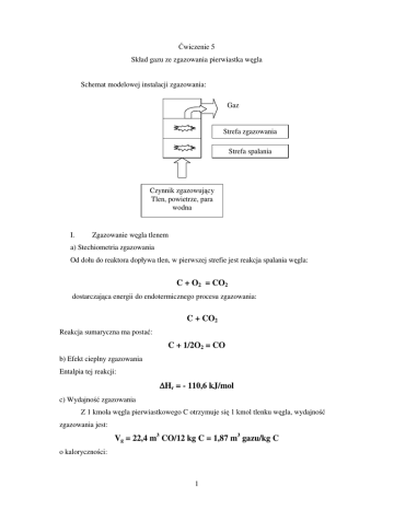 Ćwiczenie 5 Skład gazu ze zgazowania pierwiastka węgla Schemat modelowej instalacji zgazowania: Gaz Strefa zgazowania Strefa spalania Czynnik zgazowujący Tlen, powietrze, para wodna I. Zgazowanie węgla tlenem a) Stechiometria zgazowania Od dołu do reaktora dopływa tlen, w pierwszej strefie jest reakcja spalania węgla: C + O2 = CO2 dostarczająca energii do endotermicznego procesu zgazowania: C + CO2 Reakcja sumaryczna ma postać: C + 1/2O2 = CO b) Efekt cieplny zgazowania Entalpia tej reakcji: ∆Hr = - 110,6 kJ/mol c) Wydajność zgazowania Z 1 kmola węgla pierwiastkowego C otrzymuje się 1 kmol tlenku węgla, wydajność zgazowania jest: Vg = 22,4 m3 CO/12 kg C = 1,87 m3 gazu/kg C o kaloryczności: 1 Qi,CO = 10,1 MJ/kg ≈ 12,6 MJ/m3. II. Zgazowanie węgla powietrzem a) Stechiometria zgazowania Układ reakcji jest w zasadzie taki sam jak w I: C + ½(O2 + 3,76N2) = CO + 1,88N2 b) efekt cieplny reakcji jest taki sam jak w I: ∆Hr = - 110,6 kJ/mol c) Wydajność zgazowania Z 1 kmola węgla pierwiastkowego C otrzymuje się (1 + 1,88) = 2,88 kmola gazu (mieszaniny CO i N2), o składzie (udziałach molowych αi): αCO = 1/(1 + 1,88) = 0,347 = 34,7% αN2 = 1,88/(1 + 1,88) = 0,653 = 65,3% Wydajność zgazowania jest, więc następująca: Vg = 22,4 m3 2,88/12 kg C = 5,376 m3 gazu/kg C o kaloryczności: Qi,g = 4,34 MJ/m3. III. Zgazowanie węgla parą wodną a) Stechiometria zgazowania: C + H2O = CO + H2 b) efekt cieplny reakcji: ∆Hr = 131,0 kJ/mol czyli reakcja jest silnie endotermiczna, więc do reaktora trzeba dostarczać ciepło. 2 c) Wydajność zgazowania Z 1 kmola węgla pierwiastkowego C otrzymuje się 2 kmole gazu (mieszaniny 0,5CO i 0,5 H2), o składzie (udziałach molowych αi): αCO = 1/(1 + 1) = 0,5 = 50% αN2 = 1/(1 + 1) = 0,5 = 50% Wydajność zgazowania jest: Vg = 22,4 m3 2/12 kg C = 3,73 m3 gazu/kg C o kaloryczności: Qi,g = 11,7 MJ/m3. IV. Zgazowanie węgla mieszaniną pary wodnej i powietrza a) Stechiometria zgazowania: C + α(O2 + 3,76N2) + βH2O = CO + 3,76α α N2 + βH2 gdzie α i β oznaczają liczbę moli. Z bilansu atomów tlenu można wyeliminować np. β: 2α + β = 1, stąd β = 1 – 2α i równanie stechiometrii przybiera postać: C + α(O2 + 3,76N2) + (1- 2α α)H2O = CO + 3,76 N2 + (1- 2α α)H2 Zmieniając wartość α można zmieniać skład gazu. Zadanie: Wyznaczyć wzory na udziały składników gazu (αCO, αN2, αH2) b) Efekt cieplny zgazowania: ∆Hr = - 110,6 - (1 - 2α α)(-241,83) kJ/mol czyli zależnie od liczby moli powietrza α efekt cieplny zgazowania może być dodatni lub ujemny. 3 Optymalne (teoretycznie) warunki zgazowania to takie, kiedy ∆Hr = 0, czyli cały efekt cieplny półspalania węgla został wykorzystany do zgazowania węgla parą wodną. c) Wydajność zgazowania (skład energetycznie optymalny) Optymalną liczbę moli wyznacza się z warunku ∆Hr = 0, czyli: 110,6 - (1 - 2α α)(-241,83) kJ/mol = 0 Stąd: α = 0,27 i β = 0,46 i równanie stechiometryczne przyjmuje postać: C + 0,27(O2 + 3,76N2) +0,46H2O = CO + 1,0152N2 +0,46H2 Zadanie: a) obliczyć wydajność gazu optymalnego Vg [m3 gazu/kg C] b) kaloryczność gazu Qi,g [MJ/m3] c) obliczyć udziały składników w gazie αi. 4