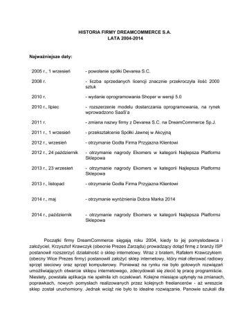 HISTORIA FIRMY DREAMCOMMERCE S.A. LATA 20042014 Najważniejsze daty: 2005 r., 1 wrzesień powołanie spółki Devarea S.C. 2008 r. liczba sprzedanych licencji znacznie przekroczyła ilość 2000 sztuk 2010 r. wydanie oprogramowania Shoper w wersji 5.0 2010 r., lipiec rozszerzenie modelu dostarczania oprogramowania, na rynek wprowadzono SaaS’a 2011 r. zmiana nazwy firmy z Devarea S.C. na DreamCommerce Sp.J. 2011 r., 1 wrzesień przekształcenie Spółki Jawnej w Akcyjną 2012 r., wrzesień otrzymanie Godła Firma Przyjazna Klientowi 2012 r., 24 październik otrzymanie nagrody Ekomers w kategorii Najlepsza Platforma Sklepowa 2013 r., 23 wrzesień otrzymanie nagrody Ekomers w kategorii Najlepsza Platforma Sklepowa 2013 r., listopad otrzymanie Godła Firma Przyjazna Klientowi 2014 r., maj otrzymanie wyróżnienia Dobra Marka 2014 2014 r., październik otrzymanie nagrody Ekomers w kategorii Najlepsza Platforma Sklepowa Początki firmy DreamCommerce sięgają roku 2004, kiedy to jej pomysłodawca i założyciel, Krzysztof Krawczyk (obecnie Prezes Zarządu) prowadzący dotąd firmę z branży ISP postanowił rozszerzyć działalność o sklep internetowy. Wraz z bratem, Rafałem Krawczykiem (obecny Wice Prezes firmy) postanowili założyć sklep internetowy, który miał oferować radiowy sprzęt sieciowy oraz sprzęt komputerowy. Ponieważ na rynku nie było gotowych rozwiązań umożliwiających otwarcie sklepu internetowego, zdecydowali się zlecić tę pracę programiście. Niestety, powstała aplikacja nie spełniła ich oczekiwań. Kolejne miesiące upłynęły na zmianach, poprawkach, nowych pomysłach realizowanych przez kolejnych freelancerów aż wreszcie sklep został uruchomiony. Jednak wciąż nie było to idealne rozwiązanie. Panowie szukali dla niego alternatywy, jednak bezskutecznie wobec tego Krzysztof postanowił napisać oprogramowanie samodzielnie była to jedyna szansa by spełniało ono wszystkie oczekiwania i założenia. Nowe oprogramowanie było gotowe po 3 miesiącach i tak w połowie 2005 roku sklep został uruchomiony. Efekt pracy był na tyle zadowalający, iż zapadła decyzja o sprzedaży oprogramowania innym firmom. Tak powstała marka Shoper® dla której została uruchomiona strona produktowa: www.shoper.pl. W pierwszym tygodniu od uruchomienia sprzedaży był już pierwszy klient, a ponieważ rozwiązanie było nowatorskie kolejni dołączali bardzo szybko. 1 września 2005 roku powołano do życia spółkę cywilną Devarea. Skład firmy był dwuosobowy: Krzysztof Krawczyk odpowiadał za rozwój produktu, natomiast Rafał Krawczyk za obsługę klienta. W tym czasie Shoper był tzw. wersją pudełkową oprogramowania z możliwością wprowadzania modyfikacji. W praktyce oznaczało to, że Klienci składali zamówienia na indywidualne funkcje, a firma je przygotowywała. Po niedługim czasie okazało się, że aktualizacja utworzonych sklepów jest trudna lub wręcz niemożliwa właśnie ze względu na indywidualne zmiany, jakie zostały w nich wprowadzone. Kolejne dwa lata były czasem intensywnej sprzedaży oprogramowania Shoper. W 2007 roku zatrudniono dodatkową osobę do obsługi klientów, wprowadzono także usprawnienia i regulacje w tym obszarze. Na początku 2008 roku zatrudniony został programista, Adrian Słowik, wtedy jeszcze student, obecnie Szef Działu Developerów, Architekt Oprogramowania. W jego ocenie, kod aplikacji nie sprzyjał łatwemu rozwijaniu funkcjonalności, nie było też możliwości przygotowania automatycznego procesu wdrażania nowych wersji oprogramowania do indywidualnie modyfikowanych sklepów. Adrian zaproponował zaprojektowanie i przepisanie aplikacji na nowo, z uwzględnieniem planowanej na przyszłość ścieżki rozwoju. W tym samym roku zespół został powiększony o kolejne osoby. Zatrudniono grafika a także kolejną osobę do BOK Wojciecha Lisowskiego obecnie Koordynatora Biura Obsługi Klienta. Firma zmieniła również siedzibę, na większą. Dwa lata później, w marcu 2010 roku miała miejsce kolejna przeprowadzka do obecnej lokalizacji na ulicę Bociana 22. W 2010 roku opublikowana została wersja 5.0 oprogramowania Shoper, była to całkowicie nowa wersja platformy, przygotowana pod platformę SaaS. Innowacyjność oferowanego rozwiązania sprawiła, że klienci pojawili się szybko. W lipcu 2010 roku rozszerzono model korzystania z oprogramowania wprowadzając SaaS’a. Do firmy dołączyły kolejne osoby zasilając dział IT oraz Biuro Obsługi Klienta. Rok 2011 przyniósł kolejne zmiany skład firmy powiększył się o osobę Tomasza Tybona obecnie Managera Marketingu i Sprzedaży, który w ciągu kilku miesięcy zbudował od podstaw Dział Sprzedaży i Marketingu. Jednocześnie spółka rozpoczęła proces reorganizacyjny zmieniona została nazwa z Devarea s.c. na DreamCommerce Sp.j., a następnie (1 września 2011 roku) przekształceniu uległa również forma prawna ze spółki jawnej na spółkę akcyjną. Kolejny rok w DreamCommerce S.A. to nowe osoby oraz coraz większa aktywność spółki, także w obszarze edukacji rynku a przede wszystkim to czas rozwoju oprogramowania zgodnie z potrzebami branży i oczekiwaniami klientów. W 2012 roku DreamCommerce S.A. udostępniła swoim klientom forum sugestii by rozwijać oprogramowanie zgodnie z potrzebami i oczekiwaniami klientów. Nagrody i wyróżnienia, jakie otrzymał Shoper są potwierdzeniem słusznie przyjętej strategii. Na dzień 01.11.2014 roku stan zatrudnienia wynosi 29 osób. Firma rozwija się bardzo intensywnie jako lider wśród dostawców oprogramowania do prowadzenia sklepu internetowego poszukuje nowych pracowników, którzy dołączą do zespołu i wraz z nami będą wdrażać innowacyjne rozwiązania dla branży ecommerce. Aktualne oferty pracy na stronie: Praca w Shoper. Nagrody i wyróżnienia: Wrzesień 2012 rok DreamCommerce S.A. otrzymała Godło Firma Przyjazna Klientowi (materiał informacyjny). Październik 2012 rok Oprog