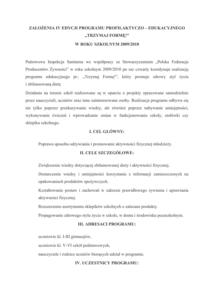 ZAŁOŻENIA IV EDYCJI PROGRAMU PROFILAKTYCZO – EDUKACYJNEGO „TRZYMAJ FORMĘ!” W ROKU SZKOLNYM 2009/2010 Państwowa Inspekcja Sanitarna we współpracy ze Stowarzyszeniem „Polska Federacja Producentów Żywności” w roku szkolnym 2009/2010 po raz czwarty koordynuje realizację programu edukacyjnego pt.: „Trzymaj Formę!”, który promuje zdrowy styl życia i zbilansowaną dietę Działania na terenie szkół realizowane są w oparciu o projekty opracowane samodzielnie przez nauczycieli, uczniów oraz inne zainteresowane osoby. Realizacja programu odbywa się nie tylko poprzez przekazywanie wiedzy, ale również poprzez nabywanie umiejętności, wykonywanie ćwiczeń i wprowadzanie zmian w funkcjonowaniu szkoły, stołówki czy sklepiku szkolnego. I. CEL GŁÓWNY: Poprawa sposobu odżywiania i promowanie aktywności fizycznej młodzieży. II. CELE SZCZEGÓŁOWE: Zwiększenie wiedzy dotyczącej zbilansowanej diety i aktywności fizycznej. Dostarczenie wiedzy i umiejętności korzystania z informacji zamieszczonych na opakowaniach produktów spożywczych. Kształtowanie postaw i zachowań w zakresie prawidłowego żywienia i uprawiania aktywności fizycznej. Rozszerzenie asortymentu sklepików szkolnych o zalecane produkty. Propagowanie zdrowego stylu życia w szkole, w domu i środowisku pozaszkolnym. III. ADRESACI PROGRAMU: uczniowie kl. I-III gimnazjów, uczniowie kl. V-VI szkół podstawowych, nauczyciele i rodzice uczniów biorących udział w programie. IV. UCZESTNICY PROGRAMU: - dyrekcje szkół, nauczyciele, społeczność szkolna, - pielęgniarki środowiska nauczania i wychowania, - władze wojewódzkie i lokalne oraz inni wg możliwości i potrzeb środowiskowych. V. CZAS TRWANIA PROGRAMU: IV edycja- rok szkolny 2009/ 2010 V edycja - rok szkolny 2010/ 2011 VI edycja - rok szkolny 2011/ 2012 VI. ORGANIZATORZY PROGRAMU: Główny Inspektorat Sanitarny, Stowarzyszenie "Polska Federacja Producentów Żywności" Związek Pracodawców VII. KOORDYNATORZY PROGRAMU: poziom wojewódzki - Wojewódzkie Stacje Sanitarno-Epidemiologiczne, poziom powiatowy - Powiatowe Stacje Sanitarno-Epidemiologiczne, poziom szkolny - szkoły podstawowe i gimnazjalne. VIII. PARTNERZY PROGRAMU: Ministerstwo Edukacji Narodowej, Instytut Matki i Dziecka, Instytut Żywności i Żywienia, Ministerstwo Sportu i Turystyki, Szkoła Główna Gospodarstwa Wiejskiego w Warszawie, Akademia Wychowania Fizycznego w Warszawie. IX. MATERIAŁ Y I POMOCE PROGRAMOWE: poradnik dla szkolnych koordynatorów programu, nauczycieli/pielęgniarek środowiska nauczania i wychowania, materiały dla. młodzieży dotyczące zbilansowanej diety i znaczenia aktywności fizycznej, plakat piramida zdrowia, internetowa interaktywna strona edukacyjna (treści programowe, gry, informacja o znakowaniu żywności na wirtualnych produktach) X. UZASADNIENIE: Niezdrowe odżywianie i brak aktywności fizycznej są wiodącymi przyczynami najważniejszych chorób niezakaźnych, włącznie z chorobą wieńcową, cukrzycą typu drugiego i pewnymi typami nowotworów oraz stanowią znaczącą część problemów związanych z chorobami, zgonami i kalectwem. Odżywianie się jest jednym z istotniejszych czynników wpływających na stan zdrowia człowieka, jego rozwój psychofizyczny, zdolność do uczenia się, aktywność ruchową, samopoczucie i stan emocjonalny. Młodzi ludzie są najbardziej narażeni na skutki nieprawidłowego żywienia. W wielu krajach rozwiniętych wzrasta liczba dzieci i dorosłych z nadwagą i otyłych oraz blisko z tym związanych przypadków cukrzycy typu II. Z badań prowadzonych w Polsce przez IMiDz wynika, że 13,3% młodzieży w wieku 13-15 lat ma nadwagę lub otyłość. Odsetek ten zwiększył się o 2% w porównaniu do badań prowadzonych 10 lat wcześniej. Badania żywienia dzieci i młodzieży prowadzone przez Instytut Matki i Dziecka, Instytut Żywności i Żywienia, Katedrę Biomedycznych Podstaw Rozwoju i Wychowania Uniwersytetu Warszawskiego wykazują: zbyt duży udział w całodziennej kaloryczności energii pochodzącej z tłuszczu, co spowodowane jest nadkonsumpcją mięsa i jego przetworów, niedobory w diecie warzyw i owoców, ciemnego pieczywa, produktów zbożowych, mleka i jego przetworów, masła i śmietany oraz ryb, nadmierne spożycie słodyczy, chipsów, słodkich napoi gazowanych, potraw typu „fast food”. XI. TREŚCI PROGRAMU: Piramida zdrowia – bloki produktów, rozkład posiłków w ciągu dnia, dzienne zalecenia żywieniowe dla młodzieży, rola podstawowych składników odżywczych, zasady zdrowego żywienia, BMI, zaburzenia stanu zdrowia (otyłość, nadwaga, niedobór masy ciała, anoreksja, bulimia), Znaczenie aktywności fizycznej dla zdrowia: pożądana aktywność fizyczna dla dzieci i młodzieży, test wydolności fizycznej, test sprawności fizycznej, przykłady ćwiczeń: mięśni brzucha, mięśni bioder, mięśni grzbietu, mięśni klatki piersiowej, oddechowych, utrzymywania poprawnej postawy ciała, marszu. XII. AKCEPTACJE: Program zyskał akceptację: Ministerstwa Edukacji Narodowej, Ministerstwa Sportu, Instytutu Żywności i Żywienia, Zakładu Medycyny Szkolnej Instytutu Matki i Dziecka, Podlaskiego Kuratora Oświaty, Zakładu Dietetyki Akademii Medycznej w Białymstoku. XIII. LINKI: Dodatkowe informacje o programie można uzyskać na stronach internetowych: http://www.trzymajforme.pl/ i http://www.pfpz.pl/index/ Biała Księga. Strategia dla Europy w zakresie zagadnień zdrowia związanych z żywieniem, nadwagą i otyłością: http://eur-lex.europa.eu/LexUriServ/site/pl/com/2007/com2007_0279pl01.pdf http://ec.europa.eu/health/ph_determinants/life_style/nutrition/documents/nutrition_w p_pl.pdf Stanowisko Rządu Rzeczypospolitej Polskiej: http://www.pfpz.pl/nowosci/?id_news=347&lang_id=1 WYKAZ SZKÓŁ REALIZUJĄCYCH PROGRAM „TRZYMAJ FORMĘ!” NA TERENIE POWIATU WODZISŁAWSKIEGO I JASTRZĘBIA ZDROJU W ROKU SZKONYM 2009/2010 1. Szkoły podstawowe Szkoły przystępuj