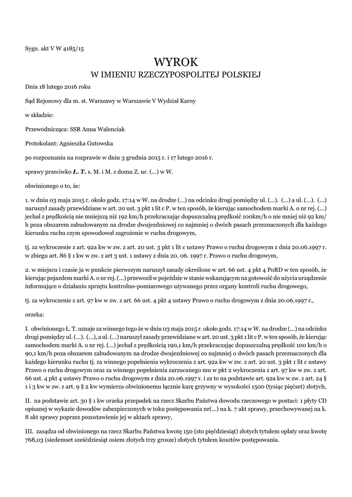 Sygn. akt V W 4185/15 WYROK W IMIENIU RZECZYPOSPOLITEJ POLSKIEJ Dnia 18 lutego 2016 roku Sąd Rejonowy dla m. st. Warszawy w Warszawie V Wydział Karny w składzie: Przewodnicząca: SSR Anna Walenciak Protokolant: Agnieszka Gutowska po rozpoznaniu na rozprawie w dniu 3 grudnia 2015 r. i 17 lutego 2016 r. sprawy przeciwko Ł. T. s. M. i M. z domu Z. ur. (...) w W. obwinionego o to, że: 1. w dniu 03 maja 2015 r. około godz. 17:14 w W. na drodze (...) na odcinku drogi pomiędzy ul. (...). (...) a ul. (...). (...) naruszył zasady przewidziane w art. 20 ust. 3 pkt 1 lit c P. w ten sposób, że kierując samochodem marki A. o nr rej. (...) jechał z prędkością nie mniejszą niż 192 km/h przekraczając dopuszczalną prędkość 100km/h o nie mniej niż 92 km/ h poza obszarem zabudowanym na drodze dwujezdniowej co najmniej o dwóch pasach przeznaczonych dla każdego kierunku ruchu czym spowodował zagrożenie w ruchu drogowym, tj. za wykroczenie z art. 92a kw w zw. z art. 20 ust. 3 pkt 1 lit c ustawy Prawo o ruchu drogowym z dnia 20.06.1997 r. w zbiegu art. 86 § 1 kw w zw. z art 3 ust. 1 ustawy z dnia 20. 06. 1997 r. Prawo o ruchu drogowym, 2. w miejscu i czasie ja w punkcie pierwszym naruszył zasady określone w art. 66 ust. 4 pkt 4 PoRD w ten sposób, że kierując pojazdem marki A. o nr rej. (...) przewoził w pojeździe w stanie wskazującym na gotowość do użycia urządzenie informujące o działaniu sprzętu kontrolno-pomiarowego używanego przez organy kontroli ruchu drogowego, tj. za wykroczenie z art. 97 kw w zw. z art. 66 ust. 4 pkt 4 ustawy Prawo o ruchu drogowym z dnia 20.06.1997 r., orzeka: I. obwinionego Ł. T. uznaje za winnego tego że w dniu 03 maja 2015 r. około godz. 17:14 w W. na drodze (...) na odcinku drogi pomiędzy ul. (...). (...), a ul. (...) naruszył zasady przewidziane w art. 20 ust. 3 pkt 1 lit c P. w ten sposób, że kierując samochodem marki A. o nr rej. (...) jechał z prędkością 190,1 km/h przekraczając dopuszczalną prędkość 100 km/h o 90,1 km/h poza obszarem zabudowanym na drodze dwujezdniowej co najmniej o dwóch pasach przeznaczonych dla każdego kierunku ruchu tj. za winnego popełnienia wykroczenia z art. 92a kw w zw. z art. 20 ust. 3 pkt 1 lit c ustawy Prawo o ruchu drogowym oraz za winnego popełnienia zarzucanego mu w pkt 2 wykroczenia z art. 97 kw w zw. z art. 66 ust. 4 pkt 4 ustawy Prawo o ruchu drogowym z dnia 20.06.1997 r. i za to na podstawie art. 92a kw w zw. z art. 24 § 1 i 3 kw w zw. z art. 9 § 2 kw wymierza obwinionemu łącznie karę grzywny w wysokości 1500 (tysiąc pięćset) złotych, II. na podstawie art. 30 § 1 kw orzeka przepadek na rzecz Skarbu Państwa dowodu rzeczowego w postaci: 1 płyty CD opisanej w wykazie dowodów zabezpieczonych w toku postępowania nr(...) na k. 7 akt sprawy, przechowywanej na k. 8 akt sprawy poprzez pozostawienie jej w aktach sprawy, III. zasądza od obwinionego na rzecz Skarbu Państwa kwotę 150 (sto pięćdziesiąt) złotych tytułem opłaty oraz kwotę 768,03 (siedemset sześćdziesiąt osiem złotych trzy grosze) złotych tytułem kosztów postępowania. Sygn. akt V W 4185/15 UZASADNIENIE Sąd ustalił następujący stan faktyczny: Funkcjonariusze T. B. i D. D. pełnili w dniu 3 maja 2015 r. służbę patrolową trasy S-2 w W.. W trakcie czynności około godz. 17:14 w na odcinku drogi pomiędzy ul. (...). (...) a ul. (...) dokonali pomiaru prędkości pojazdu A. o nr rej. (...), którym Ł. T. jechał z prędkością 190,1 km/h przekraczając dopuszczalną prędkość 100 km/h o 90,1 km/h poza obszarem zabudowanym na drodze dwujezdniowej co najmniej o dwóch pasach przeznaczonych dla każdego kierunku ruchu. W związku z powyższym funkcjonariusze Policji zatrzymali Ł. T. do kontroli, podczas której ujawnili w prowadzonym przez niego pojeździe urządzenie informujące o działaniu sprzętu kontrolno – pomiarowego używanego przez organy kontroli ruchu drogowego, które Ł. T. przewoził w pojeździe – w stanie wskazującym na gotowość do użycia. Powyższy stan faktyczny Sąd ustalił na podstawie: częściowo wyjaśnień obwinionego /k. 9 -11, k. 42 - 44 /, zeznań świadka T. B. /k. 2 – 3, k. 44 – 46/, n/u /k. 1/, świadectwo legalizacji /k. 4/, płyta Cd /k. 7 – 8/, instrukcja obsługi video rejestratora /k. 40/, dane z (...) /k. 54/, , opinia biegłego /k. 170 – 175/. Obwiniony Ł. T. w toku postępowania wyjaśniającego k. 10-11 przyznał się do popełnienia zarzucanych mu czynów i wyraził skruchę, natomiast przed Sądem k. 42-44 nie przyznał się do ich popełnienia i wyjaśnił, że poruszał się ze znacznie mniejszą prędkością niż wskazana w zarzucie. Obwiniony wyjaśnił, że wcześniej przyznał się ze stresu w związku z pobytem na komisariacie Policji. W kwestii drugiego z zarzutów, obwiniony wyjaśnił, że samochód którym się poruszał został przez niego pożyczony, wyjaśnił, że nie wiedział co się w nim znajduje. Sąd zważył, co następuje: Sąd uznał za wiarygodne wyjaśnienia obwinionego w zakresie, w jakim obwiniony potwierdził, że w dniu zdarzenia to on prowadził pojazd, co zostało uwiecznione na nagraniu z urządzenia pomiarowego oraz za wiarygodne uznał te wyjaśnienia obwinionego, w których nie kwestionował on swojego sprawstwa i winy w odniesieniu do zarzucanych mu czynów. Sąd nie dał wiary wyjaśnieniom obwinionego, w zakresie w jakim wynikać ma z nich, że prowadząc pojazd nie przekroczył dopuszczalnej prędkości, a pomiar może wynikać ma z błędu urządzenia, stanowisko to nie znalazło bowiem potwierdzenia w zgromadzonym w sprawie materiale dowodowym i przeprowadzonej w sprawie opinii biegłego z zakresu ruchu drogowego J. K. k. 57-71, którą to opinię Sąd w pełni podzielił. Opinia ta jest bowiem w ocenie Sądu jasna, pełna, wewnętrznie spójna, a nadto została przygotowana przez osobę posiadającą wiadomości specjalne, o wieloletnim stażu zawodowym. Biegły przede wszystkim wskazał