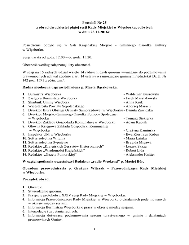 Protokół Nr 25 z obrad dwudziestej piątej sesji Rady Miejskiej w Więcborku, odbytych w dniu 23.11.2016r. Posiedzenie odbyło się w Sali Krajeńskiej Miejsko - Gminnego Ośrodka Kultury w Więcborku. Sesja trwała od godz. 12:00 – do godz. 15:20. Obecność według załączonej listy obecności. W sesji na 15 radnych udział wzięło 14 radnych, czyli quorum wymagane do podejmowania prawomocnych uchwał zgodnie z art. 14 ustawy o samorządzie gminnym /jedn.tekst Dz.U. Nr 142 poz. 1591 z późn. zm./. Radna nieobecna usprawiedliwiona p. Marta Bączkowska. Burmistrz Więcborka - Waldemar Kuszewski Zastępca Burmistrza Więcborka - Jacek Masztakowski Skarbnik Gminy Więcbork - Alina Kruk Wicestarosta Powiatu Sępoleńskiego - Andrzej Marach Dyrektor Biura Obsługi Oświaty Samorządowej w Więcborku - Danuta Zawidzka Dyrektor Miejsko-Gminnego Ośrodka Pomocy Społecznej w Więcborku - Tomasz Siekierka 7. Dyrektor Zakładu Gospodarki Komunalnej w Więcborku - Adam Kubiak 8. Główna Księgowa Zakładu Gospodarki Komunalnej w Więcborku - Grażyna Kamińska 9. Inspektor UM w Więcborku - Ewa Kiestrzyn Kobus 10. Sołtys sołectwa Witunia - Maria Łańska 11. Sołtys sołectwa Sypniewo - Brygida Migawa 12. Redaktor „Krajeńskich Zeszytów Historycznych” - Leszek Skaza 13. Redaktor „Wiadomości Krajeńskich” - Robert Lida 14. Redaktor „Gazety Pomorskiej” - Aleksander Knitter 1. 2. 3. 4. 5. 6. W części spotkania uczestniczył Redaktor „radio Weekend” p. Maciej Bór. Obradom przewodniczyła p. Grażyna Witczak – Przewodnicząca Rady Miejskiej w Więcborku. Porządek obrad: 1. 2. 3. 4. Otwarcie. Stwierdzenie quorum. Przyjęcie protokołu z XXIV sesji Rady Miejskiej w Więcborku. Informacja Przewodniczącej Rady Miejskiej w Więcborku o działaniach podejmowanych w okresie między sesjami. 5. Informacja Burmistrza Więcborka o pracy w okresie między sesjami. 6. Interpelacje i zapytania radnych. 7. Informacja dotycząca podsumowania sezonu turystycznego w gminie i działaniach promocyjnych Gminy. 1 8. Rozpatrzenie wniosku Zakładu Gospodarki Komunalnej w sprawie przedłużenia czasu obowiązywania dotychczasowych taryf dla zbiorowego zaopatrzenia w wodę i zbiorowego odprowadzania ścieków obowiązujących na terenie miasta i gminy Więcbork – podjęcie uchwały w sprawie przedłużenia taryfy za zbiorowe zaopatrzenie w wodę i zbiorowe odprowadzanie ścieków ustalone przez Zakład Gospodarki Komunalnej Spółka z o.o. w Więcborku 9. Podjecie uchwał podatkowych na rok 2017: a) w sprawie określenia wysokości stawek podatku od nieruchomości oraz poboru tego podatku w drodze inkasa, b) w sprawie określenia wysokości stawek podatku od środków transportowych, c) w sprawie stawek opłaty targowej i jej poboru 10. Podjęcie uchwały w sprawie określenia wysokości, przyznawania i wypłacania dodatku mieszkaniowego nauczycielom zatrudnionym w placówkach oświatowych, dla których Gmina Więcbork jest organem prowadzącym. 11. Podjęcie uchwały w sprawie uchwalenia „Programu współpracy Gminy Więcbork z organizacjami pozarządowymi oraz podmiotami prowadzącymi działalność pożytku publicznego na rok 2017. 12. Podjecie uchwały w sprawie przyjęcia Gminnego Programu Przeciwdziałania Przemocy w Rodzinie orz Ochrony Ofiar Przemocy w Rodzinie w Gminie Więcbork na lata 2017 – 2022. 13. Przyjęcia uchwały w sprawie przyjęcia „Gminnego Programu Profilaktyki i Rozwiązywania Problemów Alkoholowych oraz przeciwdziałania Narkomanii na rok 2017”. 14. Podjecie uchwały w sprawie statutu Miejsko-Gminnego Ośrodka Pomocy Społecznej w Więcborku. 15. Podjecie uchwały w sprawie zasad i trybu udzielania dotacji celowej na dofinansowanie kosztów budowy studni wierconych oraz sposobu jej rozliczania. 16. Podjęcie uchwały w sprawie zmian budżetu Gminy Więcbork na rok 2016. 17. Podjęcie uchwały w sprawie zmian Wieloletniej Prognozy Finansowej Gminy Więcbork. 18. Odpowiedzi na interpelacje i zapytania radnych. 19. Wolne wnioski i informacje. 20. Zakończenie. Do powyższego nie wniesiono zmian. Przewodnicząca RM zarządziła głosowanie nad porządkiem obrad. Na sali 14 radnych Porządek obrad przyjęto jednogłośnie Ad. 3 Przewodnicząca RM p. Grażyna Witczak poinformowała, że protokół z XXIV sesji został napisany. Do dnia sesji nie wniesiono poprawek. Zapytała, czy ewentualnie ktoś z radnych w danej chwili ma jakieś uwagi. Takowych nie zgłoszono, więc poddano protokół pod głosowanie. Na sali 14 radnych Protokół przyjęto jednogłośnie 2 Ad. 4 Informacja Przewodniczącej Rady Miejskiej w Więcborku o działaniach podejmowanych w okresie między sesjami. W przedmiotowym okresie Przewodnicząca RM pełniła cotygodniowy – wtorkowy dyżur w biurze Rady Miejskiej. Ponadto: 6.11.2016r.- udział w otwarciu wystawy pt.: „ Umarł za prawdę. Narodził się dla Nieba” wystawa materiałów IPN na temat błogosławionego ks. Jerzego Popiełuszki. Wystawie tej towarzyszyła również prezentacja twórczości religijnej autorów lokalnych p. Anny Radeckiej i p. Piotra Skowron / obchody – otwarcie XVIII Powiatowego Tygodnia Kultury Chrześcijańskiej/. Tego samego dnia Przewodnicząca RM uczestniczyła w benefisie 30-lecia pracy artystycznej p. Józefa Walczaka. 8.11.2016r. – udział w wykładzie ks. Marcina Wierzchosławskiego „Chrzest, a człowiek XXI wieku”/ miejsce Miejsko - Gminnej Bibliotece Publicznej w Więcborku/. 11.11.2016r. – udział w obchodach Święta Niepodległości /przemarsz, złożenie kwiatów pod pomnikiem „Orła Białego”, udział w uroczystej mszy św. za ojczyznę oraz koncercie chóru parafialnego/. 13.11.2016 – udział we mszy św. kończącej Powiatowy Tydzień Kultury Chrześcijańskiej. 14.11.2016r. – udział w otwarciu wystawy fotograficznej p. Andrzeja Osowskiego pt.: „Kraj między górami, a morzem” oraz w wystawie pokonkursowej „Razem promujemy Więcbork”/miejsce Miejsko-Gminna Biblioteka