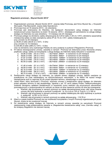 Regulamin promocji „ Skynet Domki 2014” 1. Organizatorem promocji „Skynet Domki 2014”, zwanej dalej Promocją, jest firma Skynet Sp. j. Krzysztof Skorupski, Filip Bacciarelli, zwana dalej Operatorem. 2. Promocja trwa od 16 sierpnia 2014 r. do odwołania. 3. Promocja jest skierowana do Klientów, nie będących Abonentami usług dostępu do Internetu świadczonych przez Operatora na dzień 16 sierpnia 2014 r. składających zamówienie na usługę stałego dostępu do Internetu na czas określony - 12 miesięcy lub 24 miesiące. 4. Promocja polega na obniżeniu opłaty aktywacyjnej do 0,81zł netto (1,00 zł z VAT), obniżeniu opcjonalnej miesięcznej opłaty za stały zewnętrzny adres IP do 10 zł z VAT, opłaty instalacyjnej do: przy umowie na 24 miesiące: a) 38,84 zł netto (48,00 zł z VAT) - 5 Ghz przy umowie na 12 miesięcy: b) 234,96 zł netto (289 zł z VAT) - 5 Ghz oraz na obniżeniu ceny wybranego Pakietu do ceny podanej w punkcie 5 Regulaminu Promocji. 5. W trakcie obowiązywania umowy, zawartej w ramach Promocji lub dokonania przez Abonenta zmiany prędkości usługi, opłaty za korzystanie z usługi dostępu do Internetu będą naliczane w wysokości a. 34,96 zł netto (43 zł z VAT) – dla Pakiet 2Mbit+ w wariancie na 24 miesiące b. 39,84 zł netto (49 zł z VAT) – dla Pakiet 5Mbit+ w wariancie na 24 miesiące c. 47,97 zł netto (59 zł z VAT) – dla Pakiet 10Mbit+ w wariancie na 24 miesiące d. 64,23 zł netto (79 zł z VAT) – dla Pakiet 15Mbit+ w wariancie na 24 miesiące e. 80,49 zł netto (99 zł z VAT) – dla Pakiet 25Mbit+ w wariancie na 24 miesiące 6. 7. 8. 9. f. 41,46 zł netto (51 zł z VAT) – dla Pakiet 2Mbit+ w wariancie na 12 miesięcy g. 49,59 zł netto (61 zł z VAT) – dla Pakiet 5Mbit+ w wariancie na 12 miesięcy h. 60,16 zł netto (74 zł z VAT) – dla Pakiet 10Mbit+ w wariancie na 12 miesięcy i. 80,49 zł netto (99 zł z VAT) – dla Pakiet 15Mbit+ w wariancie na 12 miesięcy j. 96,75 zł netto (119 zł z VAT) – dla Pakiet 25Mbit+ w wariancie na 12 miesięcy Świadczenie usługi dostępu do Internetu, po upływie okresu objętego umową, będzie uważane za przedłużone na czas nieokreślony na dotychczasowych warunkach, o ile Klient nie wyrazi innego oświadczenia woli co najmniej 30 dni przed upływem terminu, określonego w umowie. Jeżeli Klient, który skorzysta z Promocji, wypowie umowę o świadczenie usługi dostępu do Internetu przed upływem terminu w niej określonego, zgodnie z art. 57 ust.6 ustawy Prawo Telekomunikacyjne, zostanie obciążony opłatami dodatkowymi w wysokości sumy wartości ulg przyznanych abonentowi, pomniejszonych o proporcjonalną ich wartość za okres od dnia zawarcia umowy do dnia jej rozwiązania: a. Wartość ulgi przyznanej w ramach promocji na opłatę abonamentową przez cały okres trwania umowy dla opcji wybranej w punkcie 5 podpunkt: a) ,b),c),d),e) 720 zł, f),g),h), i), j) 180 zł. b. Wartość ulgi przyznanej w ramach promocji na opłatę instalacyjną dla opcji wybranej w punkcie 4. podpunkt: a) 551 zł; b) 310 zł c. Wartość ulgi przyznanej w ramach promocji na opłatę aktywacyjną - 119,78 zł Klient w czasie trwania Promocji nie ma możliwości korzystania z innych Promocji organizowanych przez Skynet, chyba że ten postanowi inaczej. Do świadczenia usługi dostępu do Internetu w ramach umowy zawartej na warunkach Promocji zastosowanie mają postanowienia zawarte w „Regulaminie świadczenia usług” oraz „Cenniku usług”, o ile niniejszy Regulamin nie stanowi inaczej.