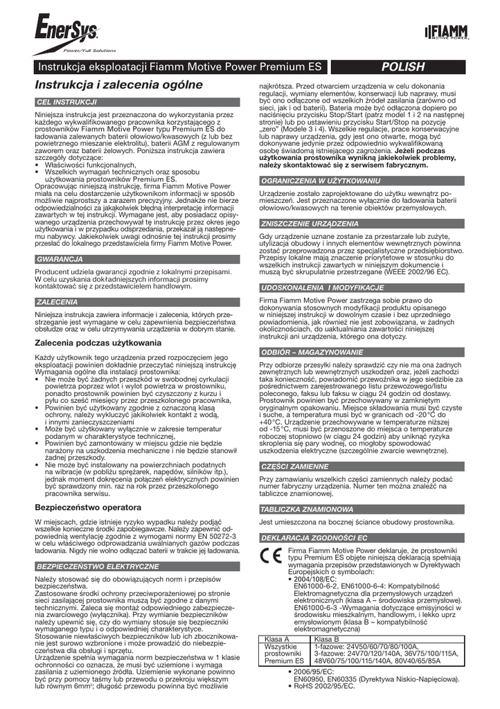 Instrukcja eksploatacji Fiamm Motive Power Premium ES Instrukcja i zalecenia ogólne CEL INSTRUKCJI Niniejsza instrukcja jest przeznaczona do wykorzystania przez każdego wykwalifikowanego pracownika korzystającego z prostowników Fiamm Motive Power typu Premium ES do ładowania zalewanych baterii ołowiowo/kwasowych (z lub bez powietrznego mieszanie elektrolitu), baterii AGM z regulowanym zaworem oraz baterii żelowych. Poniższa instrukcja zawiera szczegóły dotyczące: • Właściwości funkcjonalnych, • Wszelkich wymagań technicznych oraz sposobu użytkowania prostowników Premium ES. Opracowując niniejszą instrukcję, firma Fiamm Motive Power miała na celu dostarczenie użytkownikom informacji w sposób możliwie najprostszy a zarazem precyzyjny. Jednakże nie bierze odpowiedzialności za jakąkolwiek błędną interpretację informacji zawartych w tej instrukcji. Wymagane jest, aby posiadacz opisywanego urządzenia przechowywał tę instrukcję przez okres jego użytkowania i w przypadku odsprzedania, przekazał ją następnemu nabywcy. Jakiekolwiek uwagi odnośnie tej instrukcji prosimy przesłać do lokalnego przedstawiciela firmy Fiamm Motive Power. GWARANCJA Producent udziela gwarancji zgodnie z lokalnymi przepisami. W celu uzyskania dokładniejszych informacji prosimy kontaktować się z przedstawicielem handlowym. ZALECENIA Niniejsza instrukcja zawiera informacje i zalecenia, których przestrzeganie jest wymagane w celu zapewnienia bezpieczeństwa obsłudze oraz w celu utrzymywania urządzenia w dobrym stanie. Zalecenia podczas użytkowania Każdy użytkownik tego urządzenia przed rozpoczęciem jego eksploatacji powinien dokładnie przeczytać niniejszą instrukcję Wymagania ogólne dla instalacji prostownika: • Nie może być żadnych przeszkód w swobodnej cyrkulacji powietrza poprzez wlot i wylot powietrza w prostowniku, ponadto prostownik powinien być czyszczony z kurzu i pyłu co sześć miesięcy przez przeszkolonego pracownika, • Powinien być użytkowany zgodnie z oznaczoną klasą ochrony, należy wykluczyć jakikolwiek kontakt z wodą, i innymi zanieczyszczeniami • Może być użytkowany wyłącznie w zakresie temperatur podanym w charakterystyce technicznej, • Powinien być zamontowany w miejscu gdzie nie będzie narażony na uszkodzenia mechaniczne i nie będzie stanowił żadnej przeszkody. • Nie może być instalowany na powierzchniach podatnych na wibracje (w pobliżu sprężarek, napędów, silników itp.), jednak moment dokręcenia połączeń elektrycznych powinien być sprawdzony min. raz na rok przez przeszkolonego pracownika serwisu. POLISH najkrótsza. Przed otwarciem urządzenia w celu dokonania regulacji, wymiany elementów, konserwacji lub naprawy, musi być ono odłączone od wszelkich źródeł zasilania (zarówno od sieci, jak i od baterii). Bateria może być odłączona dopiero po naciśnięciu przycisku Stop/Start (patrz model 1 i 2 na następnej stronie) lub po ustawieniu przycisku Start/Stop na pozycję „zero” (Modele 3 i 4). Wszelkie regulacje, prace konserwacyjne lub naprawy urządzenia, gdy jest ono otwarte, mogą być dokonywane jedynie przez odpowiednio wykwalifikowaną osobę świadomą istniejącego zagrożenia. Jeżeli podczas użytkowania prostownika wynikną jakiekolwiek problemy, należy skontaktować się z serwisem fabrycznym. OGRANICZENIA W UŻYTKOWANIU Urządzenie zostało zaprojektowane do użytku wewnątrz pomieszczeń. Jest przeznaczone wyłącznie do ładowania baterii ołowiowo/kwasowych na terenie obiektów przemysłowych. ZNISZCZENIE URZĄDZENIA Gdy urządzenie uznane zostanie za przestarzałe lub zużyte, utylizacja obudowy i innych elementów wewnętrznych powinna zostać przeprowadzona przez specjalistyczne przedsiębiorstwo. Przepisy lokalne mają znaczenie priorytetowe w stosunku do wszelkich instrukcji zawartych w niniejszym dokumencie i muszą być skrupulatnie przestrzegane (WEEE 2002/96 EC). UDOSKONALENIA I MODYFIKACJE Firma Fiamm Motive Power zastrzega sobie prawo do dokonywania stosownych modyfikacji produktu opisanego w niniejszej instrukcji w dowolnym czasie i bez uprzedniego powiadomienia, jak również nie jest zobowiązana, w żadnych okolicznościach, do uaktualniania zawartości niniejszej instrukcji ani urządzenia, którego ona dotyczy. ODBIÓR – MAGAZYNOWANIE Przy odbiorze przesyłki należy sprawdzić czy nie ma ona żadnych zewnętrznych lub wewnętrznych uszkodzeń oraz, jeżeli zachodzi taka konieczność, powiadomić przewoźnika w jego siedzibie za pośrednictwem zarejestrowanego listu przewozowego/listu poleconego, faksu lub faksu w ciągu 24 godzin od dostawy. Prostownik powinien być przechowywany w zamkniętym oryginalnym opakowaniu. Miejsce składowania musi być czyste i suche, a temperatura musi być w granicach od -20 °C do +40 °C. Urządzenie przechowywane w temperaturze niższej od -15 °C, musi być przenoszone do miejsca o temperaturze roboczej stopniowo (w ciągu 24 godzin) aby uniknąć ryzyka skroplenia się pary wodnej, co mogłoby spowodować uszkodzenia elektryczne (szczególnie zwarcie wewnętrzne). CZĘŚCI ZAMIENNE Przy zamawianiu wszelkich części zamiennych należy podać numer fabryczny urządzenia. Numer ten można znaleźć na tabliczce znamionowej. Bezpieczeństwo operatora TABLICZKA ZNAMIONOWA W miejscach, gdzie istnieje ryzyko wypadku należy podjąć wszelkie konieczne środki zapobiegawcze. Należy zapewnić odpowiednią wentylację zgodnie z wymogami normy EN 50272-3 w celu właściwego odprowadzania uwalnianych gazów podczas ładowania. Nigdy nie wolno odłączać baterii w trakcie jej ładowania. Jest umieszczona na bocznej ściance obudowy prostownika. BEZPIECZEŃSTWO ELEKTRYCZNE Należy stosować się do obowiązujących norm i przepisów bezpieczeństwa. Zastosowane środki ochrony przeciwporażeniowej po stronie sieci zasilającej prostownika muszą być zgodne z danymi technicznymi. Zaleca się montaż odpowiedniego zabezpiec