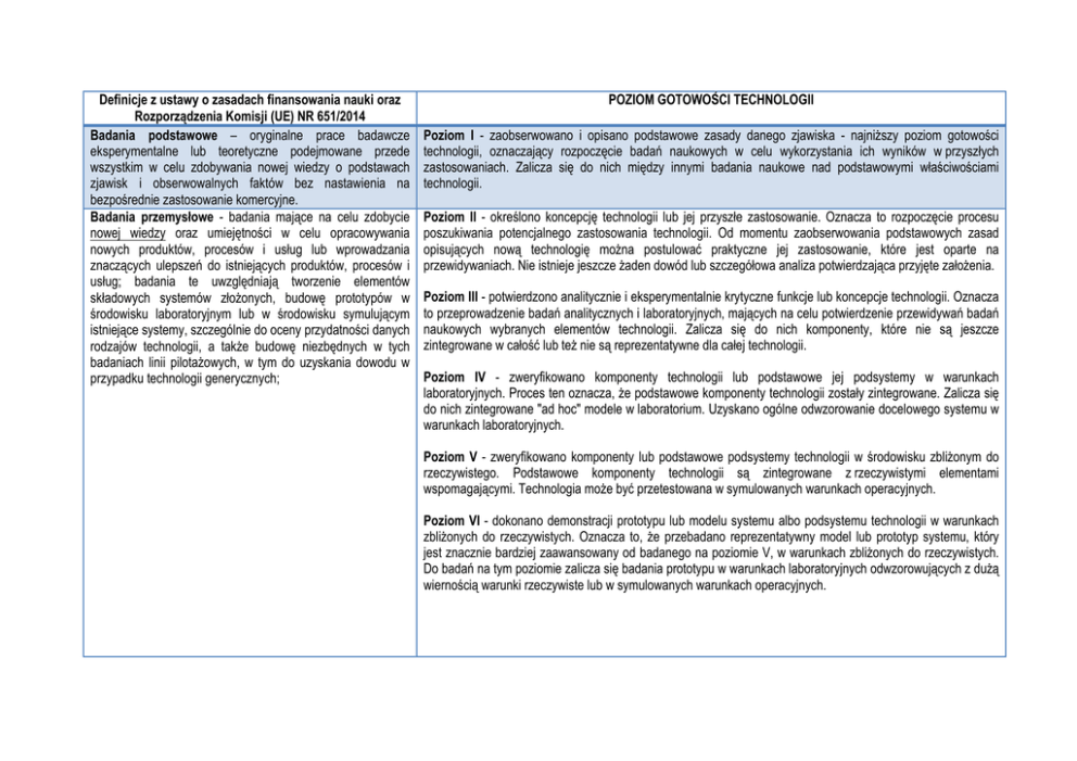 Definicje z ustawy o zasadach finansowania nauki oraz Rozporządzenia Komisji (UE) NR 651/2014 Badania podstawowe – oryginalne prace badawcze eksperymentalne lub teoretyczne podejmowane przede wszystkim w celu zdobywania nowej wiedzy o podstawach zjawisk i obserwowalnych faktów bez nastawienia na bezpośrednie zastosowanie komercyjne. Badania przemysłowe - badania mające na celu zdobycie nowej wiedzy oraz umiejętności w celu opracowywania nowych produktów, procesów i usług lub wprowadzania znaczących ulepszeń do istniejących produktów, procesów i usług; badania te uwzględniają tworzenie elementów składowych systemów złożonych, budowę prototypów w środowisku laboratoryjnym lub w środowisku symulującym istniejące systemy, szczególnie do oceny przydatności danych rodzajów technologii, a także budowę niezbędnych w tych badaniach linii pilotażowych, w tym do uzyskania dowodu w przypadku technologii generycznych; POZIOM GOTOWOŚCI TECHNOLOGII Poziom I - zaobserwowano i opisano podstawowe zasady danego zjawiska - najniższy poziom gotowości technologii, oznaczający rozpoczęcie badań naukowych w celu wykorzystania ich wyników w przyszłych zastosowaniach. Zalicza się do nich między innymi badania naukowe nad podstawowymi właściwościami technologii. Poziom II - określono koncepcję technologii lub jej przyszłe zastosowanie. Oznacza to rozpoczęcie procesu poszukiwania potencjalnego zastosowania technologii. Od momentu zaobserwowania podstawowych zasad opisujących nową technologię można postulować praktyczne jej zastosowanie, które jest oparte na przewidywaniach. Nie istnieje jeszcze żaden dowód lub szczegółowa analiza potwierdzająca przyjęte założenia. Poziom III - potwierdzono analitycznie i eksperymentalnie krytyczne funkcje lub koncepcje technologii. Oznacza to przeprowadzenie badań analitycznych i laboratoryjnych, mających na celu potwierdzenie przewidywań badań naukowych wybranych elementów technologii. Zalicza się do nich komponenty, które nie są jeszcze zintegrowane w całość lub też nie są reprezentatywne dla całej technologii. Poziom IV - zweryfikowano komponenty technologii lub podstawowe jej podsystemy w warunkach laboratoryjnych. Proces ten oznacza, że podstawowe komponenty technologii zostały zintegrowane. Zalicza się do nich zintegrowane "ad hoc" modele w laboratorium. Uzyskano ogólne odwzorowanie docelowego systemu w warunkach laboratoryjnych. Poziom V - zweryfikowano komponenty lub podstawowe podsystemy technologii w środowisku zbliżonym do rzeczywistego. Podstawowe komponenty technologii są zintegrowane z rzeczywistymi elementami wspomagającymi. Technologia może być przetestowana w symulowanych warunkach operacyjnych. Poziom VI - dokonano demonstracji prototypu lub modelu systemu albo podsystemu technologii w warunkach zbliżonych do rzeczywistych. Oznacza to, że przebadano reprezentatywny model lub prototyp systemu, który jest znacznie bardziej zaawansowany od badanego na poziomie V, w warunkach zbliżonych do rzeczywistych. Do badań na tym poziomie zalicza się badania prototypu w warunkach laboratoryjnych odwzorowujących z dużą wiernością warunki rzeczywiste lub w symulowanych warunkach operacyjnych. Prace rozwojowe – nabywanie, łączenie, kształtowanie i wykorzystywanie dostępnej aktualnie wiedzy i umiejętności z dziedziny nauki, technologii i działalności gospodarczej oraz innej wiedzy i umiejętności do planowania produkcji oraz tworzenia i projektowania nowych, zmienionych lub ulepszonych produktów, procesów i usług (z wyłączeniem prac obejmujących rutynowe i okresowe zmiany wprowadzane do produktów, linii produkcyjnych, procesów wytwórczych, istniejących usług oraz innych operacji w toku, nawet jeżeli takie zmiany mają charakter ulepszeń), w szczególności: Poziom VII - dokonano demonstracji prototypu technologii w warunkach operacyjnych. Prototyp jest już prawie na poziomie systemu operacyjnego. Poziom ten reprezentuje znaczący postęp w odniesieniu do poziomu VI i wymaga zademonstrowania, że rozwijana technologia jest możliwa do zastosowania w warunkach operacyjnych. Do badań na tym poziomie zalicza się badania prototypów na tzw. platformach badawczych. Poziom VIII - zakończono badania i demonstrację ostatecznej formy technologii. Oznacza to, że potwierdzono, że docelowy poziom technologii został osiągnięty i technologia może być zastosowana w przewidywanych dla niej warunkach. Praktycznie poziom ten reprezentuje koniec demonstracji. Przykłady obejmują badania i ocenę systemów w celu potwierdzenia spełnienia założeń projektowych, włączając w to założenia odnoszące się do zabezpieczenia logistycznego i szkolenia. a) opracowywanie prototypów i projektów pilotażowych oraz Poziom IX - sprawdzenie technologii w warunkach rzeczywistych odniosło zamierzony efekt. Wskazuje to, demonstracje, testowanie i walidację nowych lub ulepszonych że demonstrowana technologia jest już w ostatecznej formie i może zostać zaimplementowana w docelowym produktów, procesów lub usług w otoczeniu stanowiącym systemie. Między innymi dotyczy to wykorzystania opracowanych systemów w warunkach rzeczywistych. model warunków rzeczywistego funkcjonowania, których głównym celem jest dalsze udoskonalenie techniczne produktów, procesów lub usług, których ostateczny kształt nie został określony, b) opracowywanie prototypów i projektów pilotażowych, które można wykorzystać do celów komercyjnych, w przypadku gdy prototyp lub projekt pilotażowy stanowi produkt końcowy gotowy do wykorzystania komercyjnego, a jego produkcja wyłącznie do celów demonstracyjnych i walidacyjnych jest zbyt kosztowna.