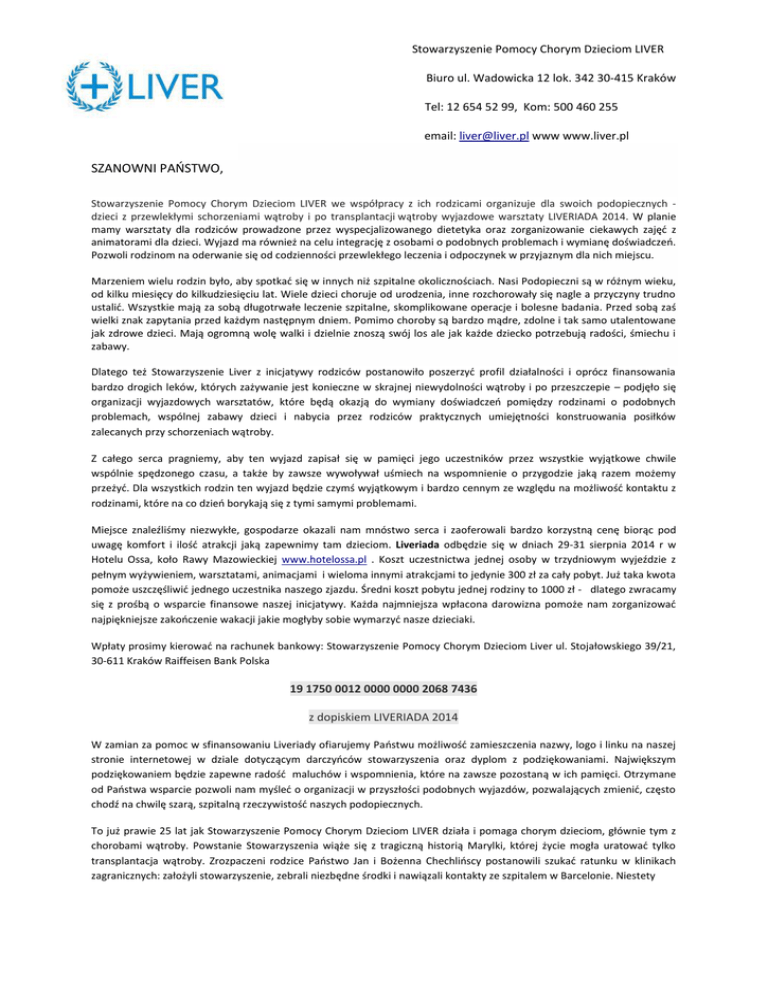 Stowarzyszenie Pomocy Chorym Dzieciom LIVER Biuro ul. Wadowicka 12 lok. 342 30-415 Kraków Tel: 12 654 52 99, Kom: 500 460 255 email: [email protected] www www.liver.pl SZANOWNI PAŃSTWO, Stowarzyszenie Pomocy Chorym Dzieciom LIVER we współpracy z ich rodzicami organizuje dla swoich podopiecznych dzieci z przewlekłymi schorzeniami wątroby i po transplantacji wątroby wyjazdowe warsztaty LIVERIADA 2014. W planie mamy warsztaty dla rodziców prowadzone przez wyspecjalizowanego dietetyka oraz zorganizowanie ciekawych zajęć z animatorami dla dzieci. Wyjazd ma również na celu integrację z osobami o podobnych problemach i wymianę doświadczeń. Pozwoli rodzinom na oderwanie się od codzienności przewlekłego leczenia i odpoczynek w przyjaznym dla nich miejscu. Marzeniem wielu rodzin było, aby spotkać się w innych niż szpitalne okolicznościach. Nasi Podopieczni są w różnym wieku, od kilku miesięcy do kilkudziesięciu lat. Wiele dzieci choruje od urodzenia, inne rozchorowały się nagle a przyczyny trudno ustalić. Wszystkie mają za sobą długotrwałe leczenie szpitalne, skomplikowane operacje i bolesne badania. Przed sobą zaś wielki znak zapytania przed każdym następnym dniem. Pomimo choroby są bardzo mądre, zdolne i tak samo utalentowane jak zdrowe dzieci. Mają ogromną wolę walki i dzielnie znoszą swój los ale jak każde dziecko potrzebują radości, śmiechu i zabawy. Dlatego też Stowarzyszenie Liver z inicjatywy rodziców postanowiło poszerzyć profil działalności i oprócz finansowania bardzo drogich leków, których zażywanie jest konieczne w skrajnej niewydolności wątroby i po przeszczepie – podjęło się organizacji wyjazdowych warsztatów, które będą okazją do wymiany doświadczeń pomiędzy rodzinami o podobnych problemach, wspólnej zabawy dzieci i nabycia przez rodziców praktycznych umiejętności konstruowania posiłków zalecanych przy schorzeniach wątroby. Z całego serca pragniemy, aby ten wyjazd zapisał się w pamięci jego uczestników przez wszystkie wyjątkowe chwile wspólnie spędzonego czasu, a także by zawsze wywoływał uśmiech na wspomnienie o przygodzie jaką razem możemy przeżyć. Dla wszystkich rodzin ten wyjazd będzie czymś wyjątkowym i bardzo cennym ze względu na możliwość kontaktu z rodzinami, które na co dzień borykają się z tymi samymi problemami. Miejsce znaleźliśmy niezwykłe, gospodarze okazali nam mnóstwo serca i zaoferowali bardzo korzystną cenę biorąc pod uwagę komfort i ilość atrakcji jaką zapewnimy tam dzieciom. Liveriada odbędzie się w dniach 29-31 sierpnia 2014 r w Hotelu Ossa, koło Rawy Mazowieckiej www.hotelossa.pl . Koszt uczestnictwa jednej osoby w trzydniowym wyjeździe z pełnym wyżywieniem, warsztatami, animacjami i wieloma innymi atrakcjami to jedynie 300 zł za cały pobyt. Już taka kwota pomoże uszczęśliwić jednego uczestnika naszego zjazdu. Średni koszt pobytu jednej rodziny to 1000 zł - dlatego zwracamy się z prośbą o wsparcie finansowe naszej inicjatywy. Każda najmniejsza wpłacona darowizna pomoże nam zorganizować najpiękniejsze zakończenie wakacji jakie mogłyby sobie wymarzyć nasze dzieciaki. Wpłaty prosimy kierować na rachunek bankowy: Stowarzyszenie Pomocy Chorym Dzieciom Liver ul. Stojałowskiego 39/21, 30-611 Kraków Raiffeisen Bank Polska 19 1750 0012 0000 0000 2068 7436 z dopiskiem LIVERIADA 2014 W zamian za pomoc w sfinansowaniu Liveriady ofiarujemy Państwu możliwość zamieszczenia nazwy, logo i linku na naszej stronie internetowej w dziale dotyczącym darczyńców stowarzyszenia oraz dyplom z podziękowaniami. Największym podziękowaniem będzie zapewne radość maluchów i wspomnienia, które na zawsze pozostaną w ich pamięci. Otrzymane od Państwa wsparcie pozwoli nam myśleć o organizacji w przyszłości podobnych wyjazdów, pozwalających zmienić, często chodź na chwilę szarą, szpitalną rzeczywistość naszych podopiecznych. To już prawie 25 lat jak Stowarzyszenie Pomocy Chorym Dzieciom LIVER działa i pomaga chorym dzieciom, głównie tym z chorobami wątroby. Powstanie Stowarzyszenia wiąże się z tragiczną historią Marylki, której życie mogła uratować tylko transplantacja wątroby. Zrozpaczeni rodzice Państwo Jan i Bożenna Chechlińscy postanowili szukać ratunku w klinikach zagranicznych: założyli stowarzyszenie, zebrali niezbędne środki i nawiązali kontakty ze szpitalem w Barcelonie. Niestety Stowarzyszenie Pomocy Chorym Dzieciom LIVER Biuro ul. Wadowicka 12 lok. 342 30-415 Kraków Tel: 12 654 52 99, Kom: 500 460 255 email: [email protected] www www.liver.pl dziewczynka nie doczekała się przeszczepienia organu i zmarła w 1991 r. Rodzice postanowili jednak, że będą pomagać innym ciężko chorym dzieciom prowadząc Stowarzyszenie. W ten sposób udało się uratować życie ponad 80 dzieciom, w tym wielu poprzez przeszczepienie wątroby w zagranicznych ośrodkach m.in: w Klinice w Barcelonie, Szpitalu Neckera w Paryżu, Klinice Saint Luc w Brukseli. Z poważaniem