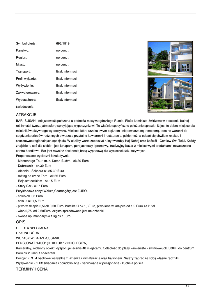 Symbol oferty: 693/1819 Państwo: no conv : Region: no conv : Miasto: no conv : Transport: Brak informacji Profil wyjazdu: Brak informacji Wyżywienie: Brak informacji Zakwaterowanie: Brak informacji Wyposażenie: Brak informacji świadczenia: ATRAKCJE BAR- SUSAŃ - miejscowość położona u podnóża masywu górskiego Rumia. Plaże kaministo-żwirkowe w otoczeniu bujnej roślinności tworzą atmosferę sprzyjającą wypoczynkowi. To właśnie specyficzne położenie sprawia, iż jest to dobre miejsce dla miłośników aktywnego wypoczynku. Miejsce, które urzeka swym pięknem i niepowtarzalną atmosferą. Idealne warunki do spędzania urlopów rodzinnych stwarzają przytulne kawiarenki i restauracje, gdzie można oddać się chwilom relaksu i skosztować regionalnych specjałów W okolicy warto zobaczyć ruiny twierdzy Haj-Nehej oraz kościół - Cerkiew Św. Tekli. Każdy znajdzie tu coś dla siebie - jest lunapark, port jachtowy i promowy, tradycyjny bazar z miejscowymi produktami, nowoczesne centra handlowe. Bar jest również doskonałą bazą wypadową dla wycieczek fakultatywnych. Proponowane wycieczki fakultatywnie: - Montenergo Tour: m.in. Kotor, Budva - ok.30 Euro - Dubrownik - ok.30 Euro - Albania - Szkodra ok.25-30 Euro - rafting na rzece Tara - ok.65 Euro - Rejs stateczkiem - ok.15 Euro - Stary Bar - ok.7 Euro Przykładowe ceny: Walutą Czarnogóry jest EURO. - chleb ok.0,5 Euro - cola 2l ok.1,5 Euro - piwo w sklepie 0,5l ok.0,50 Euro, butelka 2l ok.1,8Euro, piwo lane w knajpce od 1,2 Euro za kufel - wino 0,75l od 2,50Euro, często sprzedawane jest na dzbanki - owoce np. mandarynki 1 kg ok.1Euro OPIS OFERTA SPECJALNA CZARNOGÓRA WCZASY W BARZE-SUSANIU PENSJONAT "MIJO" (9, 10 LUB 12 NOCLEGÓW) Kameralny, rodzinny obiekt, dysponuje łącznie 48 miejscami. Odległość do plaży kamienisto - żwirkowej ok. 300m, do centrum Baru ok.20 minut spacerem. Pokoje: 2, 3 i 4 osobowe wszystkie z łazienką i klimatyzacją oraz balkonem. Należy zabrać ze sobą własne ręczniki. Wyżywienie - / HB/ śniadania i obiadokolacje - serwowane w pensjonacie - kuchnia polska. TERMINY I CENA 1/3 TERMINY 9 NOCLEGOWE: 09.07-20.07.2014 (9 noclegów) CENA: 780zł + 120 EUR PROMOCJA DLA DZIECI: Dzieci do 18 lat: 520zł+100EUR 18.07-30.07.2014 (9 noclegów) CENA: 880zł + 120 EUR ================================== TERMIN 12 NOCLEGÓW: 27.07-10.08.2014 (12 noclegów) 880zł + 140 EUR ================================== TERMIN 10 NOCLEGÓW: 08.08-20.08.2014 880zł + 130 EUR 18.08-30.08.2014 PROMOCJA DLA DZIECI: Osoba dorosła: 780zł+130 EUR Dzieci do 18 lat: 520zł+110EUR TERMINY 10 NOCLEGÓW: 28.08-09.09.2014 07.09-19.09.2014 CENA LAST MINUTE: 680zł + 110 EUR Cena PLN (płatne w Polsce) + EUR (płatne na miejscu) zawiera: - przejazd autokarem / video, WC, klimatyzacja/ - zakwaterowanie: 9, 10 lub 12 noclegów (wg wybranego terminu) - wyżywienie: śniadania i obiadokolacje (serwowane) - opieka pilot-rezydent - taksa klimatyczna - Ubezpieczenie PZU KL i NNW Cena nie zawiera: - dopłaty za klimatyzację ok.20 Euro za pobyt/pokój (9 noclegów 18 EUR, 12 noclegow 24 EUR, 10 noclegów 20 EUR) - wycieczek fakultatywnych Przykładowe wycieczki fakultatywnie: Na miejscu o wycieczkach informuje rezydent. - Montenegro Tour: Kotor, Budva, Cetinje - ok.30Euro - Dubrownik - ok.30 Euro - Albania - Szkodra ok.28-30Euro - rafting na rzece Tara - ok.65Euro - Rejs stateczkiem - ok.15 Euro - Stary Bar - ok.7 Euro UWAGI oraz ŻNIŻKI UWAGA: 1. Kwota w zł płatna jest w Polsce, kwota w EUR płatna jest w Czarnogórze: 2. W przypadku wpłaty całej kwoty w Polsce, kwotę EUR należy przeliczyć po kursie sprzedaży banku NBP z dnia wpłaty całości. 3. Przy dojeździe własnym pobyt zaczyna się o 1 dzień później, i kończy 1 dzień wcześniej w stosunku do terminu wyjazdu 2/3 autokarem. ZNIŻKI: - za dojazd własny -150 zł, - dzieci do 2 lat, nie korzystające ze świadczeń płaca tylko 380zł / koszt transportu + ubezpieczenie/ - dzieci od 2-12 lat, przy 2-ch osobach dorosłych pełnopłatnych na swoim łóżku -20% zniżki od całej kwoty. W terminach 09.07 oraz 18.08 Promocja DZIECI DO 18 LAT (wg cennika). WYJAZD WYJAZD: KATOWICE, godz.15. ul.Kopernika przystanek autobusowy - powyżej fontanny na Pl. Andrzeja. Przejazd przez Polskę, Słowację, Węgry, Serbię lub Czechy, Austrię, Słowenię, Chorwację do Czarnogóry. W trakcie przerwa na posiłek w zakresie własnym. Przejazd trwa ok. 22-24 godzin. REZERWACJA Rezerwacja wstępna na zamówienie, po sprawdzeniu dostępności miejsc potwierdzamy rezerwację. TERMINY: CENNIK: Długość pobytu: dni Grupa cenowa: Waluta: PLN Aktualne ceny z systemu S.A.R.T. (-) - cena usługi, podatku kalkulowana przy osobie lub gratis (*) - kwota wliczona w cenę standardową 3/3