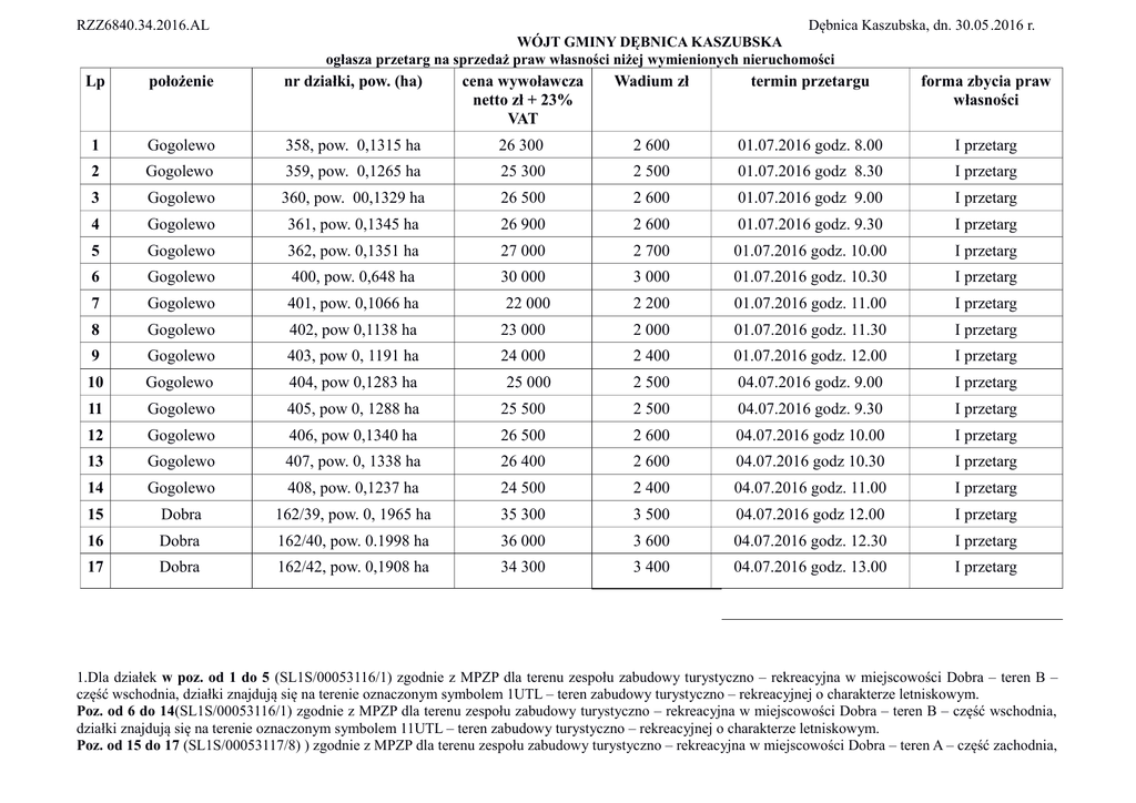 RZZ6840.34.2016.AL Dębnica Kaszubska, dn. 30.05.2016 r. WÓJT GMINY DĘBNICA KASZUBSKA ogłasza przetarg na sprzedaż praw własności niżej wymienionych nieruchomości Lp położenie nr działki, pow. (ha) cena wywoławcza netto zł + 23% VAT Wadium zł termin przetargu forma zbycia praw własności 1 Gogolewo 358, pow. 0,1315 ha 26 300 2 600 01.07.2016 godz. 8.00 I przetarg 2 Gogolewo 359, pow. 0,1265 ha 25 300 2 500 01.07.2016 godz 8.30 I przetarg 3 Gogolewo 360, pow. 00,1329 ha 26 500 2 600 01.07.2016 godz 9.00 I przetarg 4 Gogolewo 361, pow. 0,1345 ha 26 900 2 600 01.07.2016 godz. 9.30 I przetarg 5 Gogolewo 362, pow. 0,1351 ha 27 000 2 700 01.07.2016 godz. 10.00 I przetarg 6 Gogolewo 400, pow. 0,648 ha 30 000 3 000 01.07.2016 godz. 10.30 I przetarg 7 Gogolewo 401, pow. 0,1066 ha 2 200 01.07.2016 godz. 11.00 I przetarg 8 Gogolewo 402, pow 0,1138 ha 23 000 2 000 01.07.2016 godz. 11.30 I przetarg 9 Gogolewo 403, pow 0, 1191 ha 24 000 2 400 01.07.2016 godz. 12.00 I przetarg 10 Gogolewo 404, pow 0,1283 ha 2 500 04.07.2016 godz. 9.00 I przetarg 11 Gogolewo 405, pow 0, 1288 ha 25 500 2 500 04.07.2016 godz. 9.30 I przetarg 12 Gogolewo 406, pow 0,1340 ha 26 500 2 600 04.07.2016 godz 10.00 I przetarg 13 Gogolewo 407, pow. 0, 1338 ha 26 400 2 600 04.07.2016 godz 10.30 I przetarg 14 Gogolewo 408, pow. 0,1237 ha 24 500 2 400 04.07.2016 godz. 11.00 I przetarg 15 Dobra 162/39, pow. 0, 1965 ha 35 300 3 500 04.07.2016 godz 12.00 I przetarg 16 Dobra 162/40, pow. 0.1998 ha 36 000 3 600 04.07.2016 godz. 12.30 I przetarg 17 Dobra 162/42, pow. 0,1908 ha 34 300 3 400 04.07.2016 godz. 13.00 I przetarg 22 000 25 000 1.Dla działek w poz. od 1 do 5 (SL1S/00053116/1) zgodnie z MPZP dla terenu zespołu zabudowy turystyczno – rekreacyjna w miejscowości Dobra – teren B – część wschodnia, działki znajdują się na terenie oznaczonym symbolem 1UTL – teren zabudowy turystyczno – rekreacyjnej o charakterze letniskowym. Poz. od 6 do 14(SL1S/00053116/1) zgodnie z MPZP dla terenu zespołu zabudowy turystyczno – rekreacyjna w miejscowości Dobra – teren B – część wschodnia, działki znajdują się na terenie oznaczonym symbolem 11UTL – teren zabudowy turystyczno – rekreacyjnej o charakterze letniskowym. Poz. od 15 do 17 (SL1S/00053117/8) ) zgodnie z MPZP dla terenu zespołu zabudowy turystyczno – rekreacyjna w miejscowości Dobra – teren A – część zachodnia, działka znajduje się na terenie oznaczonym symbolem 3UTL – teren zabudowy turystyczno – rekreacyjnej o charakterze letniskowym. 1.Rozstrzygnięcie przetargu jest pozytywne, jeżeli przynajmniej jeden uczestnik zaoferuje co najmniej jedno postąpienie powyżej ceny wywoławczej. wysokości postąpienia decydują uczestnicy przetargu z tym, że postąpienie nie może wynieść mniej niż 1 % ceny wywoławczej. 2.Do uzyskanej ceny dla działek zostanie doliczony podatek vat w wysokości 23%. 3.Cena, bądź pierwsza rata, osiągnięta w przetargu, podlega zapłacie przed zawarciem umowy przenoszącej prawo własności. 4.Przetargi odbędą się w sali im. Jadwigi Karaś (na parterze w budynku Urzędu Gminy Dębnica Kaszubska, ul. Zjednoczenia 16a). 5.Warunkiem przystąpienia do przetargu, jest wpłacenie wymaganego wadium z podaniem numeru działki i miejscowości. Uczestnik przetargu, zobowiązany jest przedłożyć dowód osobisty a osoby prawne - pełnomocnictwo uprawniające do wzięcia udziału w przetargu. Osoba nie posiadająca obywatelstwa polskiego powinna mieć zgodę Ministra Spraw Wewnętrznych i Administracji na zakup ziemi. Nie dotyczy to obywateli krajów członkowskich Unii Europejskiej. 6.Wadium należy wpłacić w pieniądzu, najpóźniej do dnia 29.06.2016 r., w kasie Urzędu Gminy Dębnica Kaszubska (w godzinach pracy urzędu) lub na konto bankowe: Bank Spółdzielczy w Ustce, nr: 25 9315 0004 0060 0444 2000 0100. Datą dokonania wpłaty wadium/zaliczki jest data uznania na rachunku bankowym Gminy. Wadium, nie może być później na koncie Urzędu Gminy niż do dnia 29.06.2016 r. 7.Wadium wpłacone przez zgłaszającego, który przetarg wygrał, zalicza się na poczet ceny nabycia nieruchomości. Pozostałym uczestnikom wadium zwraca się po zamknięciu przetargu, nie później jednak niż po upływie 3 dni od dnia ich zamknięcia. 8.Wpłacenie wadium, jest równoznaczne z zapoznaniem się z przeznaczeniem zbywanego terenu jak również z Rozporządzeniem Rady Ministrów z dnia 14 września 2004 roku w sprawie sposobu i trybu przeprowadzania przetargów oraz rokowań na zbycie nieruchomości (Dz U. z 2014, poz. 1490). 9.Organizator przetargu zastrzega sobie prawo odwołania przetargu z uzasadnionej przyczyny, w trybie właściwym dla ogłoszenia o przetargu/rokowaniach. 10.Dane osobowe zawarte w protokole z przetargu/rokowań, posłużą do wskazania granic nabywanej działki oraz przeniesienia własności aktem notarialnym, którego koszt pokrywa nabywca. Wójt Gminy zawiadomi osobę ustaloną jako nabywcę nieruchomości o miejscu i terminie zawarcia umowy sprzedaży najpóźniej w ciągu 21 dni od dnia zamknięcia przetargu. Do dnia podpisania umowy notarialnej należy wpłacić zaoferowaną kwotę wraz z podatkiem VAT, jeśli taki występuje. W przypadku uchylenia się nabywcy od zawarcia umowy notarialnej tj. niestawienia się w miejscu i terminie podanym w zawiadomieniu lub braku wpłaty ceny nieruchomości do dnia zawarcia umowy Wójt Gminy Dębnica Kaszubska może odstąpić od podpisania umowy, a wpłacone wadium nie podlega zwrotowi i przepada na rzecz Gminy. 11. Nabywca pokrywa również koszt opłat notarialnych, koszt wypisów z aktu oraz opłaty sądowe. 12. Powyższe ogłoszenie będzie zamieszczone pod adresem internetowym www.ug.debnicakaszubska.ibip.pl, www.debnicakaszubska.eu, w prasie, na tablicy ogłoszeń w budynku Urzędu Gminy Dębnica Kaszubska i na tablicach sołectw Gminy. Dodatkowe informacje można uzyskać w pokoju nr 17, w budynku Urzędu Gminy Dębnica Kaszubska, lub pod nu