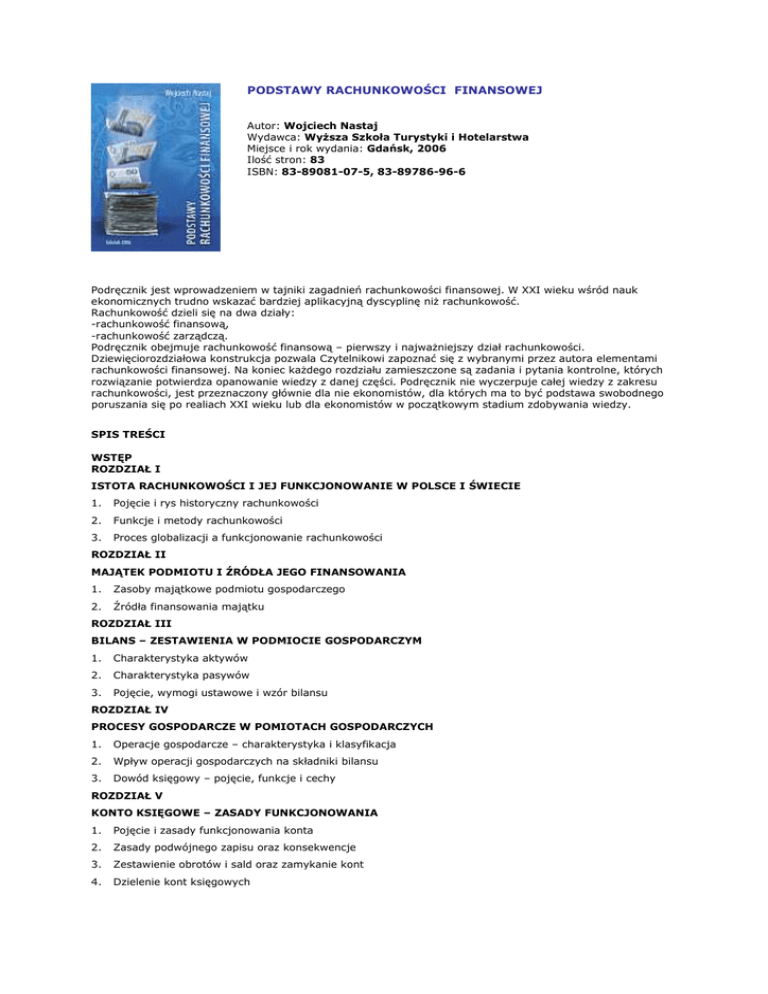 PODSTAWY RACHUNKOWOŚCI FINANSOWEJ Autor: Wojciech Nastaj Wydawca: WyŜsza Szkoła Turystyki i Hotelarstwa Miejsce i rok wydania: Gdańsk, 2006 Ilość stron: 83 ISBN: 83-89081-07-5, 83-89786-96-6 Podręcznik jest wprowadzeniem w tajniki zagadnień rachunkowości finansowej. W XXI wieku wśród nauk ekonomicznych trudno wskazać bardziej aplikacyjną dyscyplinę niŜ rachunkowość. Rachunkowość dzieli się na dwa działy: -rachunkowość finansową, -rachunkowość zarządczą. Podręcznik obejmuje rachunkowość finansową – pierwszy i najwaŜniejszy dział rachunkowości. Dziewięciorozdziałowa konstrukcja pozwala Czytelnikowi zapoznać się z wybranymi przez autora elementami rachunkowości finansowej. Na koniec kaŜdego rozdziału zamieszczone są zadania i pytania kontrolne, których rozwiązanie potwierdza opanowanie wiedzy z danej części. Podręcznik nie wyczerpuje całej wiedzy z zakresu rachunkowości, jest przeznaczony głównie dla nie ekonomistów, dla których ma to być podstawa swobodnego poruszania się po realiach XXI wieku lub dla ekonomistów w początkowym stadium zdobywania wiedzy. SPIS TREŚCI WSTĘP ROZDZIAŁ I ISTOTA RACHUNKOWOŚCI I JEJ FUNKCJONOWANIE W POLSCE I ŚWIECIE 1. Pojęcie i rys historyczny rachunkowości 2. Funkcje i metody rachunkowości 3. Proces globalizacji a funkcjonowanie rachunkowości ROZDZIAŁ II MAJĄTEK PODMIOTU I ŹRÓDŁA JEGO FINANSOWANIA 1. Zasoby majątkowe podmiotu gospodarczego 2. Źródła finansowania majątku ROZDZIAŁ III BILANS – ZESTAWIENIA W PODMIOCIE GOSPODARCZYM 1. Charakterystyka aktywów 2. Charakterystyka pasywów 3. Pojęcie, wymogi ustawowe i wzór bilansu ROZDZIAŁ IV PROCESY GOSPODARCZE W POMIOTACH GOSPODARCZYCH 1. Operacje gospodarcze – charakterystyka i klasyfikacja 2. Wpływ operacji gospodarczych na składniki bilansu 3. Dowód księgowy – pojęcie, funkcje i cechy ROZDZIAŁ V KONTO KSIĘGOWE – ZASADY FUNKCJONOWANIA 1. Pojęcie i zasady funkcjonowania konta 2. Zasady podwójnego zapisu oraz konsekwencje 3. Zestawienie obrotów i sald oraz zamykanie kont 4. Dzielenie kont księgowych 5. Łączenie kont ROZDZIAŁ VI WYNIK FINANSOWY – PODSTAWOWA KATEGORIA EKONOMICZNA 1. Elementy tworzące wynik finansowy 2. Wynik finansowy w działalności 3. Rachunek zysków i strat 4. Organizacja rachunkowości w podmiocie gospodarczym 5. Zasady rachunkowości ROZDZIAŁ VII EWIDENCJA ŚRODKÓW PIENIĘśNYCH 1. Rozliczenia gotówkowe i bezgotówkowe w podmiocie 2. Kredyty bankowe – narzędzie finansowania działalności 3. Pozostałe „quasi” pieniądze ROZDZIAŁ VIII ŚRODKI TRWAŁE ORAZ WARTOŚCI NIEMATERIALNE I PRAWNE 1. Środki trwałe – pojęcie i ich amortyzacja 2. Wartości niematerialne i prawne ROZDZIAŁ IX ROZRACHUNKI PODMIOTU 1. Ewidencja rozrachunków 2. Rozrachunki z tytułu podatków 3. Rozrachunki z tytułu wynagrodzeń oraz ich rozliczanie BIBLIOGRAFIA SPIS TABEL SPIS WZORÓW SPIS SCHEMATÓW
