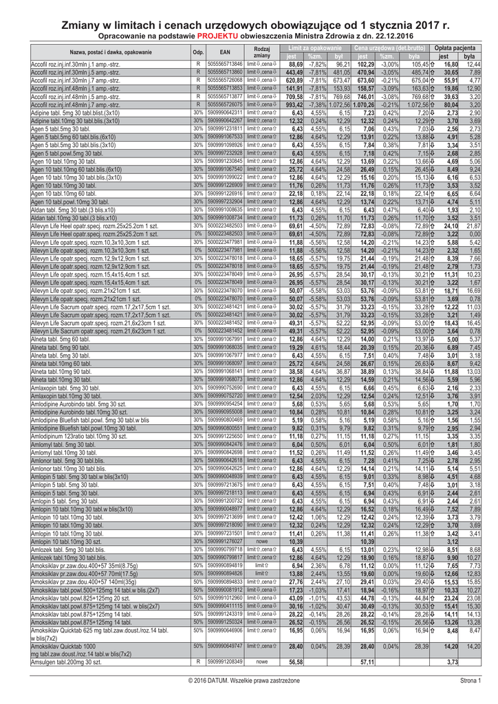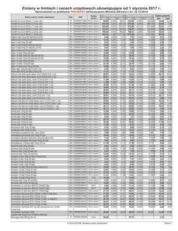 Zmiany w limitach i cenach urzędowych obowiązujące od 1 stycznia 2017 r. Opracowanie na podstawie PROJEKTU obwieszczenia Ministra Zdrowia z dn. 22.12.2016 Nazwa, postać i dawka, opakowanie Accofil roz.inj.inf.30mln j.1 amp.-strz. Accofil roz.inj.inf.30mln j.5 amp.-strz. Accofil roz.inj.inf.30mln j.7 amp.-strz. Accofil roz.inj.inf.48mln j.1 amp.-strz. Accofil roz.inj.inf.48mln j.5 amp.-strz. Accofil roz.inj.inf.48mln j.7 amp.-strz. Adipine tabl. 5mg 30 tabl.blist.(3x10) Adipine tabl.10mg 30 tabl.blis.(3x10) Agen 5 tabl.5mg 30 tabl. Agen 5 tabl.5mg 60 tabl.blis.(6x10) Agen 5 tabl.5mg 30 tabl.blis.(3x10) Agen 5 tabl.powl.5mg 30 tabl. Agen 10 tabl.10mg 30 tabl. Agen 10 tabl.10mg 60 tabl.blis.(6x10) Agen 10 tabl.10mg 30 tabl.blis.(3x10) Agen 10 tabl.10mg 30 tabl. Agen 10 tabl.10mg 60 tabl. Agen 10 tabl.powl.10mg 30 tabl. Aldan tabl. 5mg 30 tabl.(3 blis.x10) Aldan tabl.10mg 30 tabl.(3 blis.x10) Allevyn Life Heel opatr.specj. rozm.25x25.2cm 1 szt. Allevyn Life Heel opatr.specj. rozm.25x25.2cm 1 szt. Allevyn Life opatr.specj. rozm.10,3x10,3cm 1 szt. Allevyn Life opatr.specj. rozm.10,3x10,3cm 1 szt. Allevyn Life opatr.specj. rozm.12,9x12,9cm 1 szt. Allevyn Life opatr.specj. rozm.12,9x12,9cm 1 szt. Allevyn Life opatr.specj. rozm.15,4x15,4cm 1 szt. Allevyn Life opatr.specj. rozm.15,4x15,4cm 1 szt. Allevyn Life opatr.specj. rozm.21x21cm 1 szt. Allevyn Life opatr.specj. rozm.21x21cm 1 szt. Allevyn Life Sacrum opatr.specj. rozm.17,2x17,5cm 1 szt. Allevyn Life Sacrum opatr.specj. rozm.17,2x17,5cm 1 szt. Allevyn Life Sacrum opatr.specj. rozm.21,6x23cm 1 szt. Allevyn Life Sacrum opatr.specj. rozm.21,6x23cm 1 szt. Alneta tabl. 5mg 60 tabl. Alneta tabl. 5mg 90 tabl. Alneta tabl. 5mg 30 tabl. Alneta tabl.10mg 60 tabl. Alneta tabl.10mg 90 tabl. Alneta tabl.10mg 30 tabl. Amlaxopin tabl. 5mg 30 tabl. Amlaxopin tabl.10mg 30 tabl. Amlodipine Aurobindo tabl. 5mg 30 szt. Amlodipine Aurobindo tabl.10mg 30 szt. Amlodipine Bluefish tabl.powl. 5mg 30 tabl.w blis Amlodipine Bluefish tabl.powl.10mg 30 tabl. Amlodipinum 123ratio tabl.10mg 30 szt. Amlomyl tabl. 5mg 30 tabl. Amlomyl tabl.10mg 30 tabl. Amlonor tabl. 5mg 30 tabl.blis. Amlonor tabl.10mg 30 tabl.blis. Amlopin 5 tabl. 5mg 30 tabl.w blis(3x10) Amlopin 5 tabl. 5mg 30 tabl. Amlopin 5 tabl. 5mg 30 tabl. Amlopin 5 tabl. 5mg 30 tabl. Amlopin 10 tabl.10mg 30 tabl.w blis(3x10) Amlopin 10 tabl.10mg 30 tabl. Amlopin 10 tabl.10mg 30 tabl. Amlopin 10 tabl.10mg 30 tabl. Amlopin 10 tabl.10mg 30 szt. Amlozek tabl. 5mg 30 tabl.blis. Amlozek tabl.10mg 30 tabl.blis. Amoksiklav pr.zaw.dou.400+57 35ml(8.75g) Amoksiklav pr.zaw.dou.400+57 70ml(17.5g) Amoksiklav pr.zaw.dou.400+57 140ml(35g) Amoksiklav tabl.powl.500+125mg 14 tabl.w blis.(2x7) Amoksiklav tabl.powl.825+125mg 20 szt. Amoksiklav tabl.powl.875+125mg 14 tabl. w blis(2x7) Amoksiklav tabl.powl.875+125mg 14 tabl. Amoksiklav tabl.powl.875+125mg 14 tabl. Amoksiklav Quicktab 625 mg tabl.zaw.doust./roz.14 tabl. w blis(7x2) Amoksiklav Quicktab 1000 mg tabl.zaw.doust./roz.14 tabl.w blis(7x2) Amsulgen tabl.200mg 30 szt. Odp. EAN R R R R R R 30% 30% 30% 30% 30% 30% 30% 30% 30% 30% 30% 30% 30% 30% 30% 0% 30% 0% 30% 0% 30% 0% 30% 0% 30% 0% 30% 0% 30% 30% 30% 30% 30% 30% 30% 30% 30% 30% 30% 30% 30% 30% 30% 30% 30% 30% 30% 30% 30% 30% 30% 30% 30% 30% 30% 30% 50% 50% 50% 50% 50% 50% 50% 50% 50% 5055565713846 5055565713860 5055565726068 5055565713853 5055565713877 5055565726075 5909990642311 5909990642267 5909991231811 5909991067533 5909991098926 5909997232928 5909991230845 5909991067540 5909991099022 5909991226909 5909991226916 5909997232904 5909991008635 5909991008734 5000223482503 5000223482503 5000223477981 5000223477981 5000223478018 5000223478018 5000223478049 5000223478049 5000223478070 5000223478070 5000223481421 5000223481421 5000223481452 5000223481452 5909991067991 5909991068035 5909991067977 5909991068097 5909991068141 5909991068073 5909990752690 5909990752720 5909990954254 5909990955008 5909990800469 5909990800551 5909991225650 5909990842476 5909990842698 5909990642618 5909990642625 5909990048939 5909997213675 5909997218113 5909991200732 5909990048977 5909997213699 5909997218090 5909997231501 5909991276027 5909990799718 5909990799817 5909990894819 5909990894826 5909990894833 5909990081912 5909991012960 5909990411115 5909991243319 5909991250324 5909990646906 Rodzaj zmiany limitØ,cenaØ limitØ,cenaØ limitØ,cenaØ limitØ,cenaØ limitØ,cenaØ limitØ,cenaØ limit×,cena× limit×,cena× limit×,cena× limit×,cena× limit×,cena× limit×,cena× limit×,cena× limit×,cena× limit×,cena× limit×,cena× limit×,cena× limit×,cena× limit×,cena× limit×,cena× limitØ,cenaØ limitØ,cenaØ limitØ,cenaØ limitØ,cenaØ limitØ,cenaØ limitØ,cenaØ limitØ,cenaØ limitØ,cenaØ limitØ,cenaØ limitØ,cenaØ limitØ,cenaØ limitØ,cenaØ limitØ,cenaØ limitØ,cenaØ limit×,cena× limit×,cena× limit×,cena× limit×,cena× limit×,cena× limit×,cena× limit×,cena× limit×,cena× limit×,cena× limit×,cena× limit×,cena× limit×,cena× limit×,cena× limit×,cena× limit×,cena× limit×,cena× limit×,cena× limit×,cena× limit×,cena× limit×,cena× limit×,cena× limit×,cena× limit×,cena× limit×,cena× limit×,cena× nowe limit×,cena× limit×,cena× limit× limit× limit×,cena× limitØ,cenaØ limitØ,cenaØ limitØ,cenaØ limitØ,cenaØ limitØ,cenaØ limit×,cena× 50% 5909990649747 limit×,cena× R 5909991208349 nowe Limit za opakowanie Cena urzędowa (det.brutto) Opłata pacjenta jest %zm. był jest %zm. była jest była 88,69 -7,82% 96,21 102,29 -3,00% 105,45 × 16,80 12,44 443,49 -7,81% 481,05 470,94 -3,05% 485,74 × 30,65 7,89 620,89 -7,81% 673,47 673,60 -0,21% 675,04 × 55,91 4,77 141,91 -7,81% 153,93 158,57 -3,09% 163,63 × 19,86 12,90 709,58 -7,81% 769,68 746,01 -3,08% 769,68 × 39,63 3,20 993,42 -7,38% 1.072,56 1.070,26 -0,21% 1.072,56 × 80,04 3,20 6,43 4,55% 6,15 7,23 0,42% 7,20 Ø 2,73 2,90 12,32 0,24% 12,29 12,32 0,24% 12,29 × 3,70 3,69 6,43 4,55% 6,15 7,06 0,43% 7,03 Ø 2,56 2,73 12