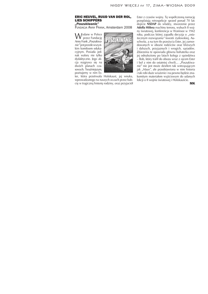 NIGDY WIĘCEJ nr 17, ZIMA-WIOSNA 2009 ERIC HEUVEL, RUUD VAN DER ROL, LIES SCHIPPERS „Poszukiwanie” FUNDACJA ANNY FRANK, Amsterdam 2008 W ydane w Polsce przez Fundację Anny Frank „Poszukiwanie” jest przede wszystkim komiksem edukacyjnym. Posiada jednak walory nie tylko dydaktyczne. Jego akcja rozgrywa się na dwóch planach czasowych. Teraźniejszym, poznajemy w nim Ester, która przetrwała Holokaust, jej wnuka, wprowadzanego na naszych oczach przez babcię w tragiczną historię rodziny, oraz przyjaciół Ester z czasów wojny. Tę współczesną narrację przeplatają retrospekcje sprzed ponad 70 lat: dojście NSDAP do władzy, stworzenie przez Adolfa Hitlera machiny terroru, wybuch II wojny światowej, konferencja w Wannsee w 1942 roku, podczas której zapadła decyzja o „ostatecznym rozwiązaniu” kwestii żydowskiej, Auschwitz, a na tym tle przeżycia Ester, jej zamordowanych w obozie rodziców oraz bliższych i dalszych, przyjaznych i wrogich, sąsiadów. Zdarzenia te opowiada główna bohaterka oraz jej odnaleziony po latach kolega z sąsiedztwa – Bob, który trafił do obozu wraz z ojcem Ester i był z nim do ostatniej chwili… „Poszukiwanie” nie jest może dziełem tak wstrząsającym jak „Maus”, ale przedstawiona w nim historia i tak robi duże wrażenie i na pewno będzie znakomitym materiałem wyjściowym do udanych lekcji o II wojnie światowej i Holokauście. MK