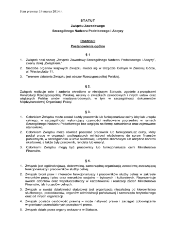 Stan prawny: 14 marca 2014 r. STATUT Związku Zawodowego Szczególnego Nadzoru Podatkowego i Akcyzy Rozdział I Postanowienia ogólne §1 1. Związek nosi nazwę „Związek Zawodowy Szczególnego Nadzoru Podatkowego i Akcyzy”, zwany dalej „Związkiem.” 2. Siedziba organów krajowych Związku mieści się w Urzędzie Celnym w Zielonej Górze, ul. Westerplatte 11. 3. Terenem działania Związku jest obszar Rzeczypospolitej Polskiej. § 2. Związek realizuje cele i zadania określone w niniejszym Statucie, zgodnie z przepisami Konstytucji Rzeczypospolitej Polskiej, ustawy o związkach zawodowych i innych ustaw oraz wiążących Polskę umów międzynarodowych, w tym w szczególności dokumentów Międzynarodowej Organizacji Pracy. § 3. 1. Członkiem Związku może zostać każdy pracownik lub funkcjonariusz celny izby lub urzędu celnego, w szczególności wykonujący czynności realizowane poprzednio w ramach Szczególnego Nadzoru Podatkowego bez względu na formę zatrudnienia oraz zajmowane stanowisko. 2. Członkiem Związku może również pozostać pracownik lub funkcjonariusz celny, który podjął pracę w organach podlegających ministrowi właściwemu do spraw finansów publicznych, w szczególności w izbie skarbowej, urzędzie skarbowym lub urzędzie kontroli skarbowej, a także były pracownik, rencista lub emeryt. 3. Członkami Związku mogą być pracownicy lub funkcjonariusze celni Ministerstwa Finansów. § 4. 1. Związek jest ogólnokrajową, dobrowolną, samorządną organizacją zawodową zrzeszającą funkcjonariuszy i pracowników służby celnej. 2. Związek broni praw i interesów funkcjonariuszy i pracowników służby celnej w zakresie warunków pracy i płac oraz warunków socjalno – bytowych i kulturalnych. Reprezentuje swoich członków oraz współuczestniczy w kształtowaniu i realizacji zadań Ministerstwa Finansów, izb i urzędów celnych. 3. Związek w swojej działalności statutowej jest organizacją niezależną od kierownictwa służbowego, pracodawców, organów administracji państwowej i samorządu terytorialnego oraz od innych organizacji. 4. Związek posiada osobowość prawną – może nabywać prawa i zaciągać zobowiązania w granicach przewidzianych przepisami prawa. 5. Związek działa przez organy wskazane w Statucie. 2 6. Związek może przystępować do krajowych i międzynarodowych zrzeszeń i organizacji związkowych. 7. Związek może współpracować z innymi organizacjami. Rozdział II Cele i zadania Związku § 5. Celem Związku i jego ogólnokrajowych organów jest obrona praw, godności i interesów prawnych pracowników i funkcjonariuszy celnych oraz interesów prawnych Związku, w szczególności: 1) ochrona interesów zawodowych, materialnych, socjalnych i kulturalnych pracowników i funkcjonariuszy celnych, i ich rodzin, 2) obrona praw pracowniczych w zakresie wykonywanej pracy zawodowej, wynagrodzenia, warunków socjalno – bytowych oraz bezpieczeństwa i higieny pracy, 3) harmonizacja działań zakładu pracy z interesami pracowników i funkcjonariuszy celnych, 4) kształtowanie etyki zawodowej i sumiennego stosunku do obowiązków pracowniczych, 5) inicjowanie i popieranie działań na rzecz tworzenia pracownikom i funkcjonariuszom celnym możliwości podnoszenia kwalifikacji zawodowych, 6) adaptacji społeczno – zawodowej nowoprzyjętych pracowników i funkcjonariuszy celnych, 7) współuczestnictwo w kształtowaniu i realizacji zadań Urzędów. § 6. Związek oraz jego ogólnokrajowe organy dążą do osiągnięcia celów oraz interesów prawnych Związku, a także interesów prawnych członków Związku, wskazanych w §5, w szczególności poprzez: 1) współdziałanie z Ministerstwem Finansów i organami administracji publicznej kierownictwami zakładów pracy oraz innymi związkami zawodowymi w nich działającymi, a także z organami samorządu terytorialnego, 2) współdziałanie z Ministerstwem Finansów i resortowymi organami administracji rządowej oraz kierownictwami zakładów pracy w zakresie usprawniania i doskonalenia pracy Urzędów, 3) kontrolę działalności społecznej inspekcji pracy i współdziałanie w tym zakresie z państwową inspekcją pracy, 4) inicjowanie, opiniowanie i aktywne kształtowanie założeń lub projektów aktów prawnych oraz decyzji dotyczących praw i interesów pracowniczych, w szczególności tych dotyczących praw i obowiązków funkcjonariuszy i pracowników Służby Celnej. 5) występowanie, na podstawie art. 191 ust. 1 pkt 4 Konstytucji RP do Trybunału Konstytucyjnego z wnioskami o wszczęcie kontroli aktów normatywnych dotyczących spraw objętych zakresem działania Związku, 6) występowanie w obronie interesów swoich członków do sądów powszechnych z wnioskiem o dopuszczenie do udziału w postępowaniu w charakterze pełnomocnika. Związek może też składać skargi do wojewódzkich sądów administracyjnych w sprawach dotyczących interesów prawnych swoich członków, jeżeli uprzednio brał udział w postępowaniu administracyjnym dotyczącym takiej sprawy, a także brać udział 3 w innych postępowaniach dotyczących Związku i jego członków, w tym postępowaniach karnych i postępowaniach administracyjnych, 7) rozwiązywanie powstałych sporów w drodze negocjacji oraz zawierania porozumień, 8) reprezentowanie interesów zawodowych swoich członków wobec kierownictw zakładów pracy, organów administracji, organizacji społecznych i samorządowych, 9) sprawowanie kontroli nad przestrzeganiem przepisów prawa pracy, udzielanie pomocy prawnej oraz podejmowanie interwencji i mediacji w indywidualnych sprawach na tle stosunku pracy, 10) sprawowanie kontroli nad przestrzeganiem przez kierownictwa zakładów pracy zapewniania pracownikom bezpiecznych i higienicznych warunków pracy, a także udział w opracowywaniu planów poprawy warunków pracy, 11) zajmowanie stanowiska wobec kierownictw zakładów pracy w sprawach dotyczących praw i intere