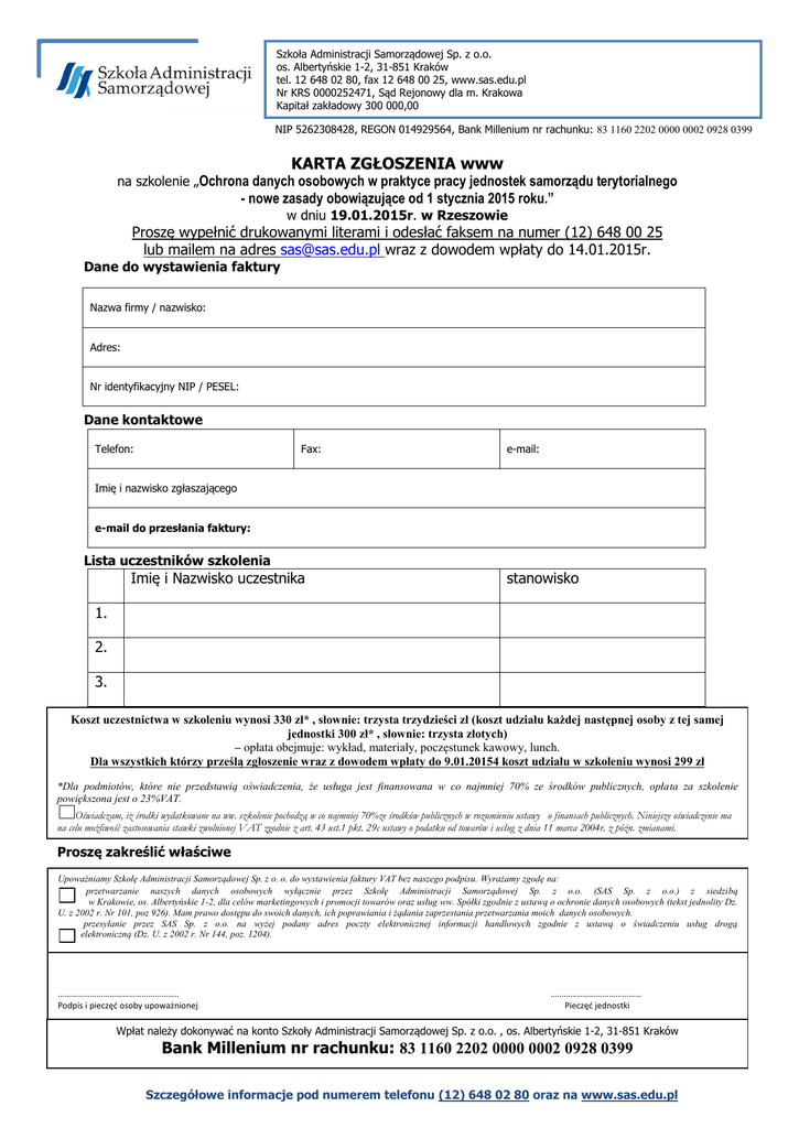 Szkoła Administracji Samorządowej Sp. z o.o. os. Albertyńskie 1-2, 31-851 Kraków tel. 12 648 02 80, fax 12 648 00 25, www.sas.edu.pl Nr KRS 0000252471, Sąd Rejonowy dla m. Krakowa Kapitał zakładowy 300 000,00 b NIP 5262308428, REGON 014929564, Bank Millenium nr rachunku: 83 1160 2202 0000 0002 0928 0399 KARTA ZGŁOSZENIA www na szkolenie „Ochrona danych osobowych w praktyce pracy jednostek samorządu terytorialnego - nowe zasady obowiązujące od 1 stycznia 2015 roku.” w dniu 19.01.2015r. w Rzeszowie Proszę wypełnić drukowanymi literami i odesłać faksem na numer (12) 648 00 25 lub mailem na adres [email protected] wraz z dowodem wpłaty do 14.01.2015r. Dane do wystawienia faktury Nazwa firmy / nazwisko: Adres: Nr identyfikacyjny NIP / PESEL: Dane kontaktowe Telefon: Fax: e-mail: Imię i nazwisko zgłaszającego e-mail do przesłania faktury: Lista uczestników szkolenia Imię i Nazwisko uczestnika stanowisko 1. 2. 3. Koszt uczestnictwa w szkoleniu wynosi 330 zł* , słownie: trzysta trzydzieści zł (koszt udziału każdej następnej osoby z tej samej jednostki 300 zł* , słownie: trzysta złotych) – opłata obejmuje: wykład, materiały, poczęstunek kawowy, lunch. Dla wszystkich którzy prześlą zgłoszenie wraz z dowodem wpłaty do 9.01.20154 koszt udziału w szkoleniu wynosi 299 zł *Dla podmiotów, które nie przedstawią oświadczenia, że usługa jest finansowana w co najmniej 70% ze środków publicznych, opłata za szkolenie powiększona jest o 23%VAT. Oświadczam, iż środki wydatkowane na ww. szkolenie pochodzą w co najmniej 70%ze środków publicznych w rozumieniu ustawy o finansach publicznych. Niniejsze oświadczenie ma na celu możliwość zastosowania stawki zwolnionej VAT zgodnie z art. 43 ust.1 pkt. 29c ustawy o podatku od towarów i usług z dnia 11 marca 2004r. z późn. zmianami. Proszę zakreślić właściwe Upoważniamy Szkołę Administracji Samorządowej Sp. z o. o. do wystawienia faktury VAT bez naszego podpisu. Wyrażamy zgodę na: przetwarzanie naszych danych osobowych wyłącznie przez Szkołę Administracji Samorządowej Sp. z o.o. (SAS Sp. z o.o.) z siedzibą w Krakowie, os. Albertyńskie 1-2, dla celów marketingowych i promocji towarów oraz usług ww. Spółki zgodnie z ustawą o ochronie danych osobowych (tekst jednolity Dz. U. z 2002 r. Nr 101, poz 926). Mam prawo dostępu do swoich danych, ich poprawiania i żądania zaprzestania przetwarzania moich danych osobowych. przesyłanie przez SAS Sp. z o.o. na wyżej podany adres poczty elektronicznej informacji handlowych zgodnie z ustawą o świadczeniu usług drogą elektroniczną (Dz. U. z 2002 r. Nr 144, poz. 1204). ……………………………………………….. Podpis i pieczęć osoby upoważnionej …………………………………… Pieczęć jednostki Wpłat należy dokonywać na konto Szkoły Administracji Samorządowej Sp. z o.o. , os. Albertyńskie 1-2, 31-851 Kraków Bank Millenium nr rachunku: 83 1160 2202 0000 0002 0928 0399 Szczegółowe informacje pod numerem telefonu (12) 648 02 80 oraz na www.sas.edu.pl ZAPRASZAMY NA SZKOLENIE: Ochrona danych osobowych w praktyce pracy jednostek samorządu terytorialnego - nowe zasady obowiązujące od 1 stycznia 2015 roku. Celem szkolenia jest przedstawienie zasad ochrony danych osobowych oraz ochrony informacji niejawnych, a także zarządzania zbiorami danych. Uzyskanie i utrwalenie wiedzy w zakresie obowiązujących regulacji prawnych, wskazanie praktycznych problemów związanych z koniecznością respektowania ochrony w związku z funkcjonowaniem instytucji. Omówienie zasad tworzenia regulaminów ochrony danych osobowych. W trakcie szkolenia omówione zostaną również nowe rozwiązania prawne dot. Administratorów Bezpieczeństwa Informacji, rejestru ABI, nowych obowiązków dla ABI, które wejdą w życie od 1.01.2015r. Nowe zasady rejestracji zbiorów danych osobowych w GIODO. Dla wszystkich którzy prześlą zgłoszenie wraz z dowodem wpłaty do 9.01.2015 koszt udziału w szkoleniu wynosi 299 zł Szkolenie jest przeznaczona dla osób bezpośrednio zajmujących się problematyką ochrony danych osobowych oraz wszystkich innych osób zainteresowanych tematyką ochrony danych osobowych. PROWADZĄCY: radca prawny, od 2011 roku członek Samorządowego Kolegium Odwoławczego. Posiada kilkuletnie doświadczenie w pomocy prawnej. Zajmuje się prawem umów, prawem własności intelektualnej oraz prawem i postępowaniem administracyjnym. Doświadczony wykładowca oraz trener z zakresu prawa i postępowania administracyjnego, prawa autorskiego, prawa reklamy, ochrony danych osobowych. 19.01.2015 – RZESZÓW - Hotel Polonia, ul. Grottgera 6, godziny 10.00 – 15.00 Nieobecność zgłoszonego uczestnika nie zwalnia od opłaty za szkolenie! PROGRAM SZKOLENIA: Ochrona danych osobowych i bezpieczeństwo informacji: 1. Wprowadzenie do tematyki ochrony danych osobowych. Przedstawienie aktualnych przepisów prawa regulujących tematykę ochrony danych osobowych. Ustawa o ochronie danych osobowych i inne ustawy, akty wykonawcze oraz przepisy „branżowe” dotyczące tej tematyki. 2. Omówienie regulacji unijnych dotyczących ochrony danych osobowych. 3. Podmioty wskazane w ustawie, jako objęte jej wymogami: Administrator Danych Osobowych, Administrator Bezpieczeństwa Informacji, Generalny Inspektor Ochrony Danych Osobowych, Inspektorzy GIODO, Administrator Systemu Informatycznego, Osoba upoważniona do przetwarzania danych osobowych, „Procesor” danych osobowych, Przedstawiciel ADO, Odbiorca danych osobowych. 4. Dane osobowe - przedmiot regulacji, podział danych na zwykłe i tzw. dane „wrażliwe”. Zgoda na przetwarzanie danych osobowych. Obowiązek informacyjny. 5. Zbiory danych i obowiązek ich rejestracji. Procedury. 6. Zabezpieczenia fizyczne, organizacyjne i informatyczne danych osobowych. Obszar przetwarzania. 7. Polityka haseł i kluczy. Zarządzanie systemem informatycznym. Sposób, miejsce i okres przech