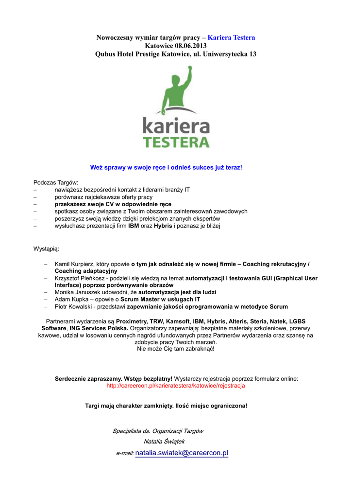 Nowoczesny wymiar targów pracy – Kariera Testera Katowice 08.06.2013 Qubus Hotel Prestige Katowice, ul. Uniwersytecka 13 Weź sprawy w swoje ręce i odnieś sukces już teraz! Podczas Targów: nawiążesz bezpośredni kontakt z liderami branży IT porównasz najciekawsze oferty pracy przekażesz swoje CV w odpowiednie ręce spotkasz osoby związane z Twoim obszarem zainteresowań zawodowych poszerzysz swoją wiedzę dzięki prelekcjom znanych ekspertów wysłuchasz prezentacji firm IBM oraz Hybris i poznasz je bliżej Wystąpią: Kamil Kurpierz, który opowie o tym jak odnaleźć się w nowej firmie – Coaching rekrutacyjny / Coaching adaptacyjny Krzysztof Pieńkosz - podzieli się wiedzą na temat automatyzacji i testowania GUI (Graphical User Interface) poprzez porównywanie obrazów Monika Januszek udowodni, że automatyzacja jest dla ludzi Adam Kupka – opowie o Scrum Master w usługach IT Piotr Kowalski - przedstawi zapewnianie jakości oprogramowania w metodyce Scrum Partnerami wydarzenia są Proximetry, TRW, Kamsoft, IBM, Hybris, Alteris, Steria, Natek, LGBS Software, ING Services Polska. Organizatorzy zapewniają: bezpłatne materiały szkoleniowe, przerwy kawowe, udział w losowaniu cennych nagród ufundowanych przez Partnerów wydarzenia oraz szansę na zdobycie pracy Twoich marzeń. Nie może Cię tam zabraknąć! Serdecznie zapraszamy. Wstęp bezpłatny! Wystarczy rejestracja poprzez formularz online: http://careercon.pl/karieratestera/katowice/rejestracja Targi mają charakter zamknięty. Ilość miejsc ograniczona! Specjalista ds. Organizacji Targów Natalia Świątek e-mail: [email protected]