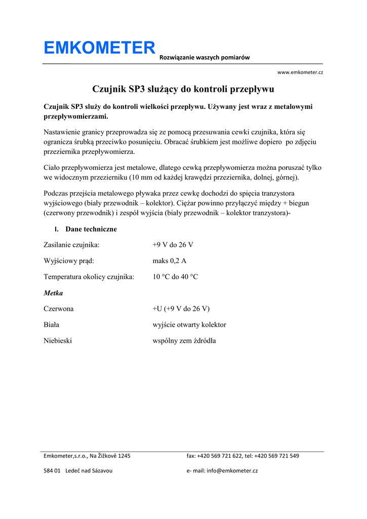 EMKOMETER Rozwiązanie waszych pomiarów www.emkometer.cz Czujnik SP3 slużący do kontroli przepływu Czujnik SP3 sluży do kontroli wielkości przepływu. Używany jest wraz z metalowymi przepływomierzami. Nastawienie granicy przeprowadza się ze pomocą przesuwania cewki czujnika, która się ogranicza śrubką przeciwko posunięciu. Obracać śrubkiem jest możliwe dopiero po zdjęciu przeziernika przepływomierza. Ciało przepływomierza jest metalowe, dlatego cewką przepływomierza można poruszać tylko we widocznym przezierniku (10 mm od każdej krawędzi przeziernika, dolnej, górnej). Podczas przejścia metalowego pływaka przez cewkę dochodzi do spięcia tranzystora wyjściowego (biały przewodnik – kolektor). Ciężar powinno przyłączyć między + biegun (czerwony przewodnik) i zespół wyjścia (biały przewodnik – kolektor tranzystora)I. Dane techniczne Zasilanie czujnika: +9 V do 26 V Wyjściowy prąd: maks 0,2 A Temperatura okolicy czujnika: 10 °C do 40 °C Metka Czerwona +U (+9 V do 26 V) Biała wyjście otwarty kolektor Niebieski wspólny zem źdródła Emkometer,s.r.o., Na Žižkově 1245 fax: +420 569 721 622, tel: +420 569 721 549 584 01 Ledeč nad Sázavou e- mail: [email protected] EMKOMETER Rozwiązanie waszych pomiarów www.emkometer.cz II. Schemat podłączenia czerwony czujnik Ciało czujnika obciążenie biały niebieski zem Zasilanie U1 można wybrać według obciążenia w zakresie +9 V do +26 V czujnik czerwony Ciało czujnika obciążenie biały niebieski zem Zasilanie obciążenia ze samodzielnego źródła. U1 jest w zakresie + 9 do + 26 Vss . U2 może być w zakresie od (teoretycznnie 0,7 V do 26 Vss), wybór według obciążenia. Emkometer,s.r.o., Na Žižkově 1245 fax: +420 569 721 622, tel: +420 569 721 549 584 01 Ledeč nad Sázavou e- mail: [email protected]