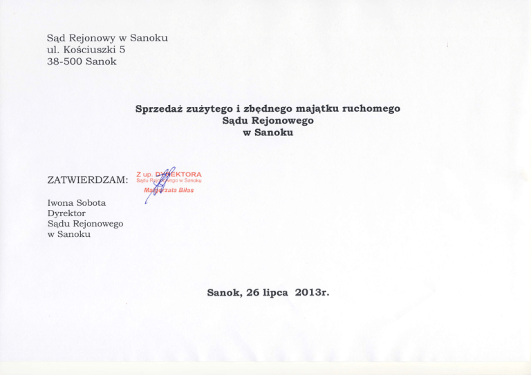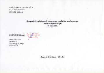 Sąd Rejonolvy w Sanoku ul. Kościuszki 5 38-500 Sanok Sprzedaż zużytego i zbędnego majątku ruchomego Sądu Rejonowego w Sanoku n/) ZATWIERDZAM: Iwona Sobota Dyrektor Sądu Rejonowego w Sanoku Z up.WE.xroąn saduaę7fftegow Sanoku M7,$*łzataBitas L Sanok, 26 lipca 2OLBr. SAD - 3 8REJONOWY -5S0 SANOK ul"Kościuszki5 tel.4s56 745 fax.4656 7C0 A - 2 4 - r/ 1 3 Sanok, 26.07.2OL3r. oGłoszENIt uI 7aÓdnie z RozporzĄdnniem P.ady MinistrÓw z dnia 2r.o5.2oror. w sprawie sposobu i Eybu gospodarowEnia sldadnikgmi rzeczoli,ymi najątku ruchomeao, w ktÓre typosażone są jednostki (Dz. U. NI 1I4' poz. 761), sąd Rejonowy w sglloku irformuje' ż w djliu 01.oa'2013l. q' god2. 1000do 12oo odbę&ie się sprzedaż zt''Eao i fbędnego majątku wa zalączonego spisu. sprzedaż odbędzie się w budyntu sądu w sanoku przy ul. Kościuszki 5 - informaqia w pokoju 2o5. Lp. Nozwo skłodniko Pozycjo z księgi inwentorzowej Stopiefi zużycia Proponowono Ceno III 1 Monitor LCD Belineo wP-4-49t-Oo-00-020 too% L,oozł 2. wP-4-491-LO-00-014 too% I,oozł wP-4-49t-LO-00-001 too% L,oozł 4. Czrltnik Dotologic DLCTOTOMP52/USB Czytnik Dotologic DLCTOTOMP52/USB Monitor LCD Belineo wP-4-491-00-00-041 100% I,oozł 5. MonitorLCD Belineo wP-4-491-OO-00-029 100% t,oozł 6. MonitorLCD Belineo wP-4-49t-O0-00-043 too% L,oozł 7. MonitorLCD Belineo wP-4-49t-00-00-079 rco% |,oożl 8 MonitorLCD Belineo wP-4-491-O0-00-058 LOO% t,oolt v. wP-5-548-14-00-021 too% t,oozł 10. DrukorkoSomsung ML-1210 Komputer wP-4-491-49-00-067 too% 1,oozł 11 Komputer wP-4-491-49-00-104 rco% t,oozł J. Uwogi Uszkodzony- brok moż|iwości nqDrowv(brok cześci) Uszkodzony (nie czyta), noderwony przew d, noprowoniemoż| iwo Uszkodzony (nie czyto), noprowo niemoż|iwo Uszkodzony(spolony), noprowo niemoż|iwo Uszkodzony(spolony), noprowo niemoż|iwo Uszkodzonomotryco.noprowo nieopłocoIno Uszkodzonomotryco,noprowo nieopłocoIno Uszkodzonomotryco,noprowo nieopłocoIno Uszkodzono, wyeksplootowono, noprowonieoptocolno PrzestarzaĘ system, wyeksplootowony, brok dysku, nopęducD. RAM, zosi|ącza Uszkodzona Wta d., brok nopędu DVD, zosiloczo.brok RAM t? Komputer wP-4-49r-49-00-O91 too% L,oozł 14. Komputer wP-4-49r-49-00-083 LOO% 1.oOzł 15. Komputer wP-4-491-49-00-081 1007 1o,OO zł 16. Czojnik bezlrzewodowy Poz.22 roo% I,oozł t7. Czojnik bezlrzewodowv Czojnik bezprzewodow Poz.38 too% |,oozł Poz.40 100% |,oozł Czojnik bezorzewodowy Czojnik bązprzewodowy Czojnik bezorzewodowv Aporot telefoniczny Siemens wP-8-808-14-05-044 rco% L,oozł Poz.44 too% 1,0Ozł Rozszczelniony korpus, spolono qrząlłka Poz.49 100% I,oozł Rozszczelniony korpus. spolono qrzatko Poz.4 too% t,oozł Niesprowny gitośni k. wytorte przyciski 23. Aporottelefoniczny Ponosonic Poz. !6 too% l,oo zł 24. Aporot telefoniczny Ponosonic Poz.27 100% t,oozł Niesprowny grtośni k, wytarte orzyciski 25. TelefonDorTel Poz.49 too% 1,oozł 26. CitizenCTKolkulotor 500 Citizen Kolkulotor sDc-8887 Poz.39 Poz.48 too% t,oozł Zepsuty wyświetlacz,zocino się podczos procy 28. Fotel obrotowy Poz.8 too% l.oozł 29. 30. Wykłodzinodywonowo Wvkłodzinodvwonowo Poz.3 loo% l,OO ztt Uszkodzonyukłodsiedzisko,oporcio lub .iezdny.niskie woloryestetyczne pr zet arta, postrzępiono PopIomiono, przet arta, postrzępiono PopIomiono, 18. 19. 20. 2t. 22. 27. t,oozł Wo-8-808-12-03-055 100% |,oozł Brok dysku, nopędu CD, zasi|aczo, RAM, uszkodzona pł.qł. Uszkodzono fivtąd.. brokdysku, nopęduCD, zosi|oczo,RAM PrzestorzaĘ syśtem, wyeksplootowony. brok dysku, nopędu cD, RAM, zosiloczo Pozszczelnionykorpus,spolono qrzotko Rozszczelniony korpus,spolono qrzotko Rozszczelnionykorpus,spolono orzołko Rozszczelniony korpus,spolono qrzołko Niesprownygłośnik, wytarte przyciski Niesprowny9łośnik, wytorte przyciski Zepsuty wyświet|ocz, zocino się podczos Drocy too% roo% 1,oozł 1,oozł |,oozł 1,oozł L,oozł Pop|omiono,przetgrta, postrzępiono Poplomiono.przet art a. postrzepiono Pop|omiono,przetort o, postrzępiono Pop|omiono.przet arta, postrzępiono rco% rco% L.oozł Połomone oqroniczniki, stępiony nÓż L,OOzlr 90% |,oozł Wp-8-808-06-Ot-Os4 90% |,oozł 41. Biurkoz kontenerkiem Wp-8-808-06-ot-o87 90% l,oo zł 42. Biurkoz kontenerkiem Wp-8-808-06-Ot-092 90% |,oozł 43. Biurkozkontenerkiem Wp-8-808-06-01-093 90% 1,oozł Niesprownyg'łośnik, wytorte przyciski Uszkodzonefronty szuflod i drzwiczek,przef arto poIituro, wvszczerbione brzeoi Nie spełnio wymogw f unkcjono|nych orąz ergonomii d|ostonowisko komputerowego. Uszkodzone f r onty szuf fod i drzwiczek,przel arta poIituro, wyszczerbionebrzeqi Nie spełnio wymogw f unkcjono|nych orąz ergonomii d|ostonowisko komputerowego. Uszkodzone f ronty szuffodi drzwiczek,przetorto poIituro, W szczerbionebrzeąi Nie spełnio wymogw f unkcjono|nych orsz ergonomii dlo stonowisko go. komputerowe U szkodzonef r onty szuf |odi drzwiczek,P?zetąrto, poIituro, wyszczerbionebrzeqi Nie spełnio wymogw f unkcjonolnych o|ąz ergonomii d|ostonowisko komputerowego. Uszkodzone f ronty szuflod i drzwiczek,przetarta poIituro, wyszczerbionebrzeąi 31. 32, 33. 35. 36. Wo-8-808-12-03-053 Wp-8-808-12-03-054 Wo-8-808-12-03-036 Poz.4 Poz.L:22:38:51 100% Aporat telefoniczny Wp-8-808-14-03-0Ol Wp-6-626-14-10-048 39. Biurkokomputerowe Wp-8-808-07-08-008 40. Biurko 37. 38. Wvkłodzino dvwonowo Wykłodzino dywonowo Wykłodzino dywonowo Wykłqdzino dywonowo Kosze na śmieci( 4 szt.) - mate Obcinorko (qilotyno) too% too% pokrywyi kuĘ Połomone 45. Biurko Poweł Wp-8-808-06-Ot-Loz 47. Niszczorko Fellowes P-58Cs NiszczorkoKobro5150 NiszczorkoFellowes P-40 wP-8-808-14-24-025 100% t,oozł wP-8-808-14-24-OO4 too% |,oozł Poz.4 L@% I,oozł 48. 49. 90% L,oozł Nie spełrrio wymogw f unkcjono|nych ordz ergonomiidlo stonowisko komputerowego. Uszkodzonef ronty szuffad i drzwiczek,przetorto polituro, W szczerbione brze ąi EksperĘza techniczno.noprowo nieoptocolno Ekspertyzotechniczno-noprowo nieoy'ocalno Ekspertyzo techniczno-noprowa nieopłocoIno