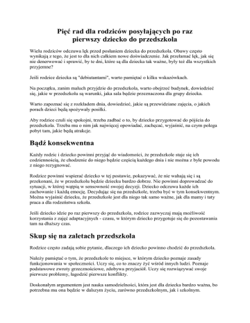 Pięć rad dla rodziców posyłających po raz pierwszy dziecko do przedszkola Wielu rodziców odczuwa lęk przed posłaniem dziecka do przedszkola. Obawy często wynikają z tego, że jest to dla nich całkiem nowe doświadczenie. Jak przełamać lęk, jak się nie denerwować i sprawić, by te dni, które są dla dziecka tak ważne, były też dla wszystkich przyjemne? Jeśli rodzice dziecka są "debiutantami", warto pamiętać o kilku wskazówkach. Na początku, zanim maluch przyjdzie do przedszkola, warto obejrzeć budynek, dowiedzieć się, jakie w przedszkolu są warunki, jaka sala będzie przeznaczona dla grupy dziecka. Warto zapoznać się z rozkładem dnia, dowiedzieć, jakie są przewidziane zajęcia, o jakich porach dzieci będą spożywały posiłki. Aby rodzice czuli się spokojni, trzeba zadbać o to, by dziecko przygotować do pójścia do przedszkola. Trzeba mu o nim jak najwięcej opowiadać, zachęcać, wyjaśnić, na czym polega pobyt tam, jakie będą atrakcje. Bądź konsekwentna Każdy rodzic i dziecko powinni przyjąć do wiadomości, że przedszkole staje się ich codziennością, że chodzenie do niego będzie częścią każdego dnia i nie można z byle powodu z niego rezygnować. Rodzice powinni wspierać dziecko w tej postawie, pokazywać, że nie wahają się i są przekonani, że w przedszkolu będzie dziecku bardzo dobrze. Nie powinni doprowadzać do sytuacji, w której wątpią w sensowność swojej decyzji. Dziecko odczuwa każde ich zachowanie i każdą emocję. Decydując się na przedszkole, trzeba być w tym konsekwentnym. Można wyjaśnić dziecku, że przedszkole jest dla niego tak samo ważne, jak dla mamy i taty praca a dla rodzeństwa szkoła. Jeśli dziecko idzie po raz pierwszy do przedszkola, rodzice zazwyczaj mają możliwość korzystania z zajęć adaptacyjnych - czasu, w którym dziecko przygotuje się do pozostawania tam na dłuższy czas. Skup się na zaletach przedszkola Rodzice często zadają sobie pytanie, dlaczego ich dziecko powinno chodzić do przedszkola. Należy pamiętać o tym, że przedszkole to miejsce, w którym dziecko poznaje zasady funkcjonowania w społeczności. Uczy się, co to znaczy żyć wśród innych ludzi. Poznaje podstawowe zwroty grzecznościowe, zdobywa przyjaciół. Uczy się rozwiązywać swoje pierwsze problemy, łagodzić pierwsze konflikty. Doskonałym argumentem jest nauka samodzielności, która jest dla dziecka bardzo ważna, bo potrzebna mu ona będzie w dalszym życiu, zarówno przedszkolnym, jak i szkolnym. W przedszkolu odbywają się liczne zajęcia, podczas których dziecko bardzo wiele się uczy. Ważne jest to, że nauka odbywa się podczas zabawy pod okiem wykwalifikowanej kadry pedagogicznej. Dzieci uczą się nawiązywania podstawowych kontaktów międzyludzkich, poznają piosenki, wyliczanki, wierszyki, doskonalą słuch muzyczny. Ćwiczą także swoje umiejętności manualne, co jest potrzebne do późniejszej nauki pisania. Poznają własne ciało, rozwijają je poprzez ćwiczenia fizyczne. Porzuć obawy Rodzice czasem mają dylemat, pozostawiając swoją pociechę w przedszkolu, zwłaszcza gdy widzą płacz czy tęsknotę malucha. Obawy są niepotrzebne. Tak jak my, dorośli, odnajdujemy się w pracy i własnym środowisku, tak dzieci z czasem odnajdują się w przedszkolu, wśród innych dzieci. Dobra rada dla rodziców - w pierwszych dniach pobytu w przedszkolu można dziecko zachęcić, by wzięło ze sobą ulubioną maskotkę, przytulankę. Będzie mu łatwiej w trudniejszych momentach dnia, gdy zatęskni za rodzicami. Często zdarza się sytuacja, że rodzice po powrocie dziecka z przedszkola wypytują je o to, co się tam działo, jak minął dzień, jakie były zajęcia, co jadło na obiad, z kim się bawiło, co sprawiło mu radości, a co było przykre. Równie często dzieci wcale nie chcą na te pytania odpowiadać i wtedy rodzice zaczynają się niepokoić, że skoro nie ma odzewu, to z pewnością coś złego się dzieje. Nie jest to prawdą. Dzieci najczęściej mówią tylko o tym, co jest dla nich ważne, a na co rodzice z pewnością nie zwróciliby uwagi. Mów prawdę Bardzo istotne jest to, by nie oszukiwać dziecka w kwestii odbierania go z przedszkola. Zazwyczaj pada z jego strony pytanie: Mamo/Tato, kiedy po mnie przyjdziesz?, wtedy warto określić porę w przybliżeniu - dzieci bowiem nie znają się na zegarku - Przyjadę po obiedzie, podwieczorku. Kiedy już rodzic z dzieckiem dotrze do przedszkola, warto poświęcić chwilkę na pożegnanie, lepiej niech nie odbywa się ono w samochodzie czy na progu sali. Pamiętać należy jednak, że nie powinno ono trwać zbyt długo. W kwestii przyjęcia i opieki nad dzieckiem w grupie trzeba zaufać w pełni wychowawcy. Zadbaj o ubranie A teraz rada praktyczna - zawsze ubieraj dziecko do przedszkola wygodnie, w ubrania nie krępujące jego ruchów. Niektóre mamy "stroją" dziewczynki, by wyglądały pięknie, jednak podczas pobytu w przedszkolu strój często przeszkadza w wielu czynnościach. Dzieci bardzo lubią bawić się na wykładzinie, do takiej zabawy najlepsze są wygodne spodnie, legginsy, getry. W miarę możliwości ubierajmy dziecko "na cebulkę", wtedy może samo decydować o tym, czy jest mu ciepło, czy za zimno i zdjąć lub założyć jakąś część garderoby. Pamiętać należy także o tym, jakie dziecko powinno mieć ubrania na wyjście na podwórko. Odpowiednie nakrycie głowy, obuwie, kurtka zaoszczędzą kłopotów wychowawcy, który pomaga dzieciom w ubieraniu. Jeśli jest to możliwe, kupujmy dziecku buty wsuwane, wciągane lub zapinane na rzepy. To zaoszczędzi czasu podczas przebierania. Każdy przedszkolak powinien mieć worek/plecak z kompletem ubrań na zmianę. Czasami bowiem zdarza się, że ubranie się pobrudzi, poplami. Wychowawca powinien wtedy mieć możliwość przebrania dziecka w świeże ubrania. Co musisz wiedzieć? Posiłki - jak wiadomo w przedszkolu są wydawane o stałych