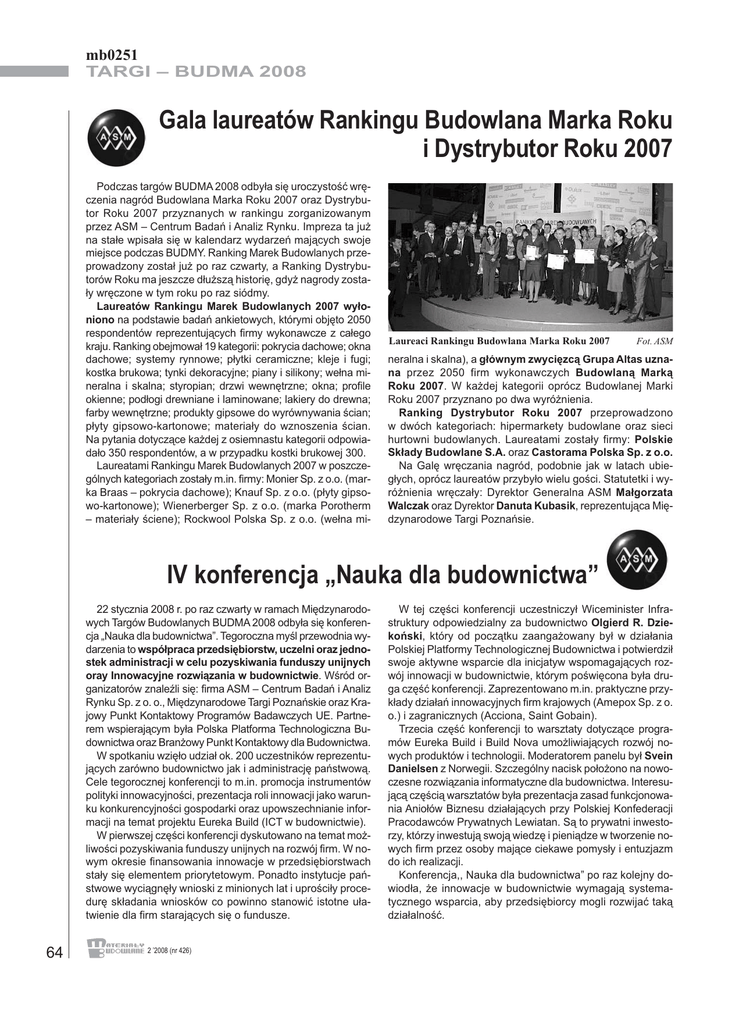mb0251 TARGI – BUDMA 2008 Gala laureatów Rankingu Budowlana Marka Roku i Dystrybutor Roku 2007 Podczas targów BUDMA 2008 odbyła się uroczystość wręczenia nagród Budowlana Marka Roku 2007 oraz Dystrybutor Roku 2007 przyznanych w rankingu zorganizowanym przez ASM – Centrum Badań i Analiz Rynku. Impreza ta już na stałe wpisała się w kalendarz wydarzeń mających swoje miejsce podczas BUDMY. Ranking Marek Budowlanych przeprowadzony został już po raz czwarty, a Ranking Dystrybutorów Roku ma jeszcze dłuższą historię, gdyż nagrody zostały wręczone w tym roku po raz siódmy. Laureatów Rankingu Marek Budowlanych 2007 wyłoniono na podstawie badań ankietowych, którymi objęto 2050 respondentów reprezentujących firmy wykonawcze z całego kraju. Ranking obejmował 19 kategorii: pokrycia dachowe; okna dachowe; systemy rynnowe; płytki ceramiczne; kleje i fugi; kostka brukowa; tynki dekoracyjne; piany i silikony; wełna mineralna i skalna; styropian; drzwi wewnętrzne; okna; profile okienne; podłogi drewniane i laminowane; lakiery do drewna; farby wewnętrzne; produkty gipsowe do wyrównywania ścian; płyty gipsowo-kartonowe; materiały do wznoszenia ścian. Na pytania dotyczące każdej z osiemnastu kategorii odpowiadało 350 respondentów, a w przypadku kostki brukowej 300. Laureatami Rankingu Marek Budowlanych 2007 w poszczególnych kategoriach zostały m.in. firmy: Monier Sp. z o.o. (marka Braas – pokrycia dachowe); Knauf Sp. z o.o. (płyty gipsowo-kartonowe); Wienerberger Sp. z o.o. (marka Porotherm – materiały ściene); Rockwool Polska Sp. z o.o. (wełna mi- Laureaci Rankingu Budowlana Marka Roku 2007 Fot. ASM neralna i skalna), a głównym zwycięzcą Grupa Altas uznana przez 2050 firm wykonawczych Budowlaną Marką Roku 2007. W każdej kategorii oprócz Budowlanej Marki Roku 2007 przyznano po dwa wyróżnienia. Ranking Dystrybutor Roku 2007 przeprowadzono w dwóch kategoriach: hipermarkety budowlane oraz sieci hurtowni budowlanych. Laureatami zostały firmy: Polskie Składy Budowlane S.A. oraz Castorama Polska Sp. z o.o. Na Galę wręczania nagród, podobnie jak w latach ubiegłych, oprócz laureatów przybyło wielu gości. Statutetki i wyróżnienia wręczały: Dyrektor Generalna ASM Małgorzata Walczak oraz Dyrektor Danuta Kubasik, reprezentująca Międzynarodowe Targi Poznańsie. IV konferencja „Nauka dla budownictwa” 22 stycznia 2008 r. po raz czwarty w ramach Międzynarodowych Targów Budowlanych BUDMA 2008 odbyła się konferencja „Nauka dla budownictwa”. Tegoroczna myśl przewodnia wydarzenia to współpraca przedsiębiorstw, uczelni oraz jednostek administracji w celu pozyskiwania funduszy unijnych oray Innowacyjne rozwiązania w budownictwie. Wśród organizatorów znaleźli się: firma ASM – Centrum Badań i Analiz Rynku Sp. z o. o., Międzynarodowe Targi Poznańskie oraz Krajowy Punkt Kontaktowy Programów Badawczych UE. Partnerem wspierającym była Polska Platforma Technologiczna Budownictwa oraz Branżowy Punkt Kontaktowy dla Budownictwa. W spotkaniu wzięło udział ok. 200 uczestników reprezentujących zarówno budownictwo jak i administrację państwową. Cele tegorocznej konferencji to m.in. promocja instrumentów polityki innowacyjności, prezentacja roli innowacji jako warunku konkurencyjności gospodarki oraz upowszechnianie informacji na temat projektu Eureka Build (ICT w budownictwie). W pierwszej części konferencji dyskutowano na temat możliwości pozyskiwania funduszy unijnych na rozwój firm. W nowym okresie finansowania innowacje w przedsiębiorstwach stały się elementem priorytetowym. Ponadto instytucje państwowe wyciągnęły wnioski z minionych lat i uprościły procedurę składania wniosków co powinno stanowić istotne ułatwienie dla firm starających się o fundusze. 64 2 ’2008 (nr 426) W tej części konferencji uczestniczył Wiceminister Infrastruktury odpowiedzialny za budownictwo Olgierd R. Dziekoński, który od początku zaangażowany był w działania Polskiej Platformy Technologicznej Budownictwa i potwierdził swoje aktywne wsparcie dla inicjatyw wspomagających rozwój innowacji w budownictwie, którym poświęcona była druga część konferencji. Zaprezentowano m.in. praktyczne przykłady działań innowacyjnych firm krajowych (Amepox Sp. z o. o.) i zagranicznych (Acciona, Saint Gobain). Trzecia część konferencji to warsztaty dotyczące programów Eureka Build i Build Nova umożliwiających rozwój nowych produktów i technologii. Moderatorem panelu był Svein Danielsen z Norwegii. Szczególny nacisk położono na nowoczesne rozwiązania informatyczne dla budownictwa. Interesującą częścią warsztatów była prezentacja zasad funkcjonowania Aniołów Biznesu działających przy Polskiej Konfederacji Pracodawców Prywatnych Lewiatan. Są to prywatni inwestorzy, którzy inwestują swoją wiedzę i pieniądze w tworzenie nowych firm przez osoby mające ciekawe pomysły i entuzjazm do ich realizacji. Konferencja,, Nauka dla budownictwa” po raz kolejny dowiodła, że innowacje w budownictwie wymagają systematycznego wsparcia, aby przedsiębiorcy mogli rozwijać taką działalność.