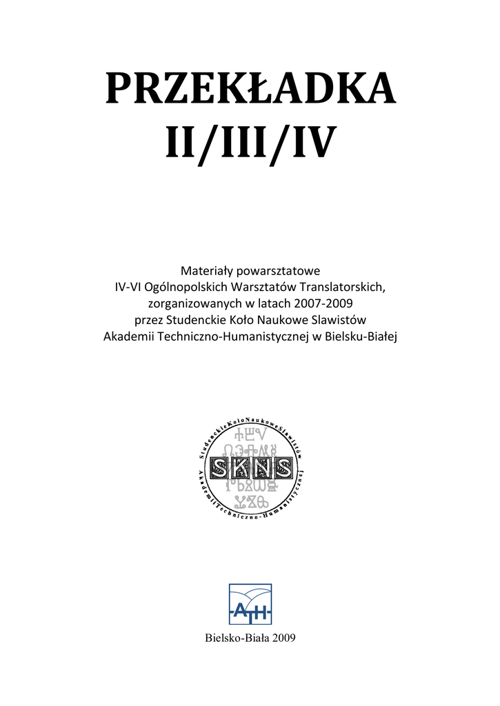 PRZEKŁADKA II/III/IV Materiały powarsztatowe IV-VI Ogólnopolskich Warsztatów Translatorskich, zorganizowanych w latach 2007-2009 przez Studenckie Koło Naukowe Slawistów Akademii Techniczno-Humanistycznej w Bielsku-Białej Bielsko-Biała 2009 REDAKTOR NACZELNY: dr hab. Jarosław Janicki, prof. ATH REDAKCJA NAUKOWA: dr Agnieszka Będkowska-Kopczyk dr Ewa Michalska RECENZJA NAUKOWA: dr hab. Libor Pavera, prof. ATH REDAKCJA TOMU: mgr Agnieszka Baran (zd. Lamers) Szymon Brandys Maria Kamioska Marta Grubka Magdalena Hankus Edyta Laszczak Paweł Powszek Piotr Szałaśny SEKRETARZ REDAKCJI: mgr Grzegorz Zamorowski PROJEKT OKŁADKI: mgr Paweł Powszek SKŁAD: Szymon Brandys ZDJĘCIE NA OKŁADCE: Adrian Spuła Adres Redakcji – Editorial Office – Adresse de redaction – Schriftleitungsadresse: Wydawnictwo Akademii Techniczno-Humanistycznej w Bielsku-Białej 43-309 Bielsko-Biała, ul. Willowa 2 tel./fax (033) 827 92 68 e-mail: [email protected] ISBN 978-83-62292-12-7 Słowo wstępne .................................................................................................. 5 PRZEKŁADKA II – 2007 ....................................................................................... 7 PRZEKŁADKA III – 2008 .................................................................................. 115 PRZEKŁADKA IV – 2009 .................................................................................. 199 SŁOWO WSTĘPNE Oddajemy do rąk Czytelników materiał, który jest pokłosiem IV, V i VI Ogólnopolskich Warsztatów Translatorskich, organizowanych przez członków Sekcji Translatorskiej przy Studenckim Kole Naukowym Slawistów Akademii Techniczno-Humanistycznej w BielskuBiałej. Warsztaty, które odbywały się w latach 2007-2009 zawsze w ostatni weekend maja, zorganizowaliśmy przy pomocy finansowej Centrum Języka Słoweoskiego jako Drugiego/Obcego przy Uniwersytecie w Lublanie oraz Akademii Techniczno-Humanistycznej. Publikację tę tworzą trzy części (trzy rozdziały): PRZEKŁADKA II, czyli studenckie podróże translatorskie PRZEKŁADKA III, czyli studenckie fascynacje różnicami kulturowymi PRZEKŁADKA IV, czyli studenckie spotkania translatorskie Ze względu na fakt, iż jest to już druga publikacja z serii PRZEKŁADKA, a poszczególne rozdziały odzwierciedlają trzy edycje Warsztatów, rozdziałom tym nadaliśmy numery II-IV. Mamy nadzieję, że będzie to przyczynek to powstania pisma studenckiego, w którym publikowane będą materiały po kolejnych Warsztatach oraz inne materiały studentów, powstałe wskutek ich fascynacji praktyką i teorią przekładu. Kryterium doboru tekstów tłumaczonych na Warsztatach w roku 2007 (II), był motyw drogi i podróżowania. Podczas prac nad tekstami zdaliśmy sobie sprawę, że metafory drogi i podróży pomocne są w zrozumieniu tego, czym jest proces tłumaczenia. Porównaliśmy go bowiem do wielowymiarowej podróży – z języka obcego do swojego, z kultury obcej do swojej (lub odwrotnie), podczas której możliwe są wycieczki do języków i kultur trzecich. Podróży tej towarzyszy ciągłe dążenie do celu – idealnego rozwiązania (najlepiej przekładu pięknego i wiernego zarazem), towarzyszą jej pułapki językowe, ślepe uliczki i błądzenie – gdy w poszukiwaniu najtrafniejszych rozwiązao, oddalamy się od pierwszej myśli, zataczamy koło i wracamy do punktu wyjścia, by tam znaleźd rozwiązanie, które wcześniej wydawało nam się nieodpowiednie. Do podróżowania można wreszcie porównad stawanie się tłumaczem – na początku gnani pasją, ale zarazem pełni obaw o efekty swej pracy, wybieramy cele najbliższe – teksty najprostsze (w naszym przekonaniu), by z czasem podejmowad wyzwania niemal egzotyczne – teksty o skomplikowanej formie, teksty odzwierciedlające idiomatykę obcej kultury, teksty pełne neologizmów, gier słownych. Doboru właśnie takich tekstów dokonaliśmy z myślą o Warsztatach w roku 2008 (PRZEKŁADKA III) i 2009 (PRZEKŁADKA IV). Każda uważna lektura tekstu obcojęzycznego sprzyja poznawaniu innej kultury – świadomemu lub nieświadomemu. Proces tłumaczenia zaś wymaga nie tylko zanurzenia się w tej kulturze, ale także zmusza tłumacza do poszukiwania relacji między kulturą własną i obcą. Zafascynował nas zwłaszcza moment, w którym tłumacz w procesie przekładu poniekąd „wymusza” spotkanie dwu kultur, dwóch różnych światów. Każde takie spotkanie – literackie i translatorskie – jest ogromną przygodą 5 intelektualną. Próbami odzwierciedlenia tej przygody są komentarze tłumaczy na temat problemów translatorskich, z jakimi się zetknęli podczas pracy nad tekstem, oraz sposobów ich rozwiązywania. Ideą Warsztatów jest doskonalenie u uczestników umiejętności przekładu tekstów artystycznych oraz rozważania na temat teorii przekładu, literatury, języka, kultury. W ramach IV Warsztatów zorganizowano częśd teoretyczną, co było możliwe dzięki uprzejmości gości, którzy wygłosili wykłady: prof. dr hab. Bożeny Pikali-Tokarz (Uniwersytet Śląski), dr. hab. Jerzego Brzozowskiego (Uniwersytet Jagiellooski i Akademia TechnicznoHumanistyczna), dr. Michała Kopczyka (Akademia Techniczno-Humanistyczna) i mgra Vítězslava Vilímka (Uniwersytet w Ostrawie). Częśd praktyczną wszystkich omawianych tu Warsztatów pomogła nam zorganizowad Tatjana Jamnik, słowenistka i tłumaczka, która współpracuje z nami regularnie od roku 2002, pośrednicząc w kontaktach z pisarzami słoweoskimi i czeskimi oraz służąc doświadczeniem w sekcji literatury słoweoskiej. Sekcję literatury słoweoskiej wspierali w latach 2007-2009 także Katarina Šalamun Biedrzycka, uznana tłumaczka literatury polskiej na język słoweoski i słoweoskiej na polski, Bojana Todorovid – lektorka języka słoweoskiego, Michał Kopczyk i Agnieszka Będkowska-Kopczyk – tłumacze literatury słoweoskiej i Regina Wojtoo – wykładowca literatury słoweo