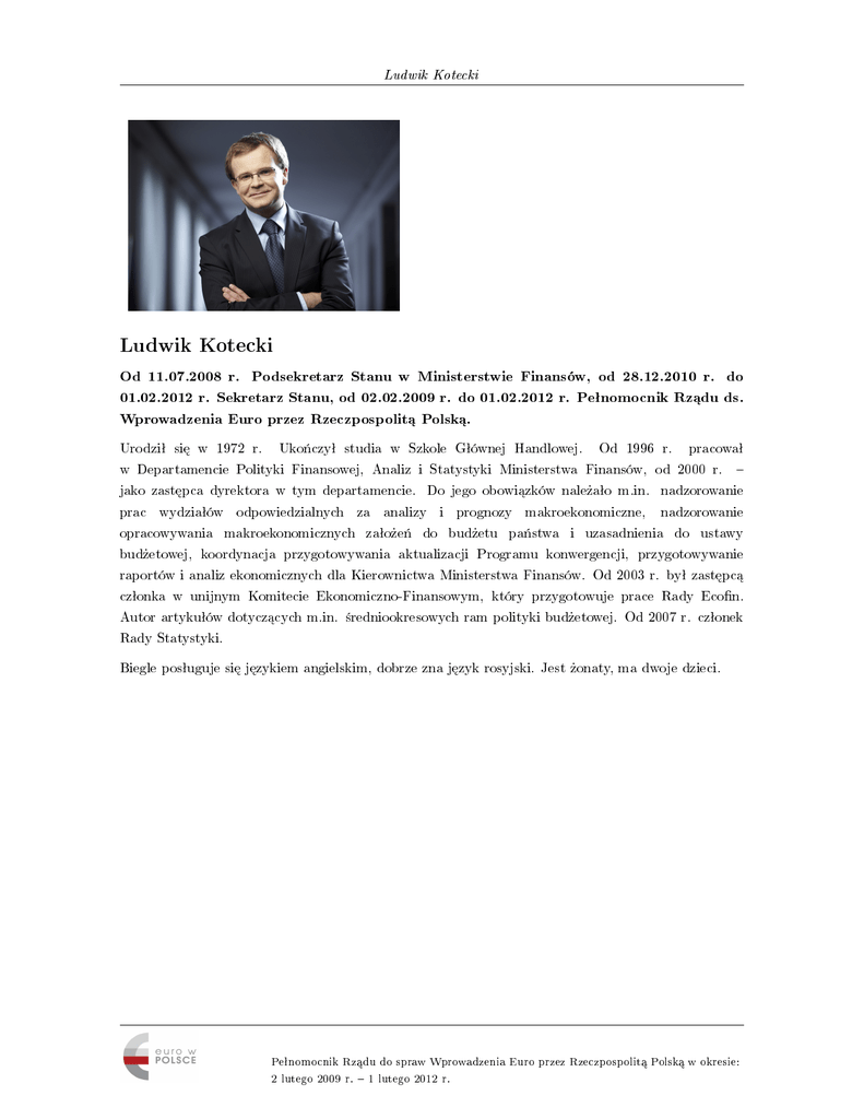 Ludwik Kotecki Ludwik Kotecki Od 11.07.2008 r. Podsekretarz Stanu w Ministerstwie Finansów, od 28.12.2010 r. do 01.02.2012 r. Sekretarz Stanu, od 02.02.2009 r. do 01.02.2012 r. Peªnomocnik Rz¡du ds. Wprowadzenia Euro przez Rzeczpospolit¡ Polsk¡. Urodziª si¦ w 1972 r. Uko«czyª studia w Szkole Gªównej Handlowej. Od 1996 r. pracowaª w Departamencie Polityki Finansowej, Analiz i Statystyki Ministerstwa Finansów, od 2000 r. jako zast¦pca dyrektora w tym departamencie. Do jego obowi¡zków nale»aªo m.in. nadzorowanie prac wydziaªów odpowiedzialnych za analizy i prognozy makroekonomiczne, nadzorowanie opracowywania makroekonomicznych zaªo»e« do bud»etu pa«stwa i uzasadnienia do ustawy bud»etowej, koordynacja przygotowywania aktualizacji Programu konwergencji, przygotowywanie raportów i analiz ekonomicznych dla Kierownictwa Ministerstwa Finansów. Od 2003 r. byª zast¦pc¡ czªonka w unijnym Komitecie Ekonomiczno-Finansowym, który przygotowuje prace Rady Econ. Autor artykuªów dotycz¡cych m.in. ±redniookresowych ram polityki bud»etowej. Od 2007 r. czªonek Rady Statystyki. Biegle posªuguje si¦ j¦zykiem angielskim, dobrze zna j¦zyk rosyjski. Jest »onaty, ma dwoje dzieci. Peªnomocnik Rz¡du do spraw Wprowadzenia Euro przez Rzeczpospolit¡ Polsk¡ w okresie: 2 lutego 2009 r. 1 lutego 2012 r.