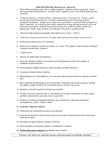 SPIS EKWIPUNKU dla harcerzy i harcerek 1. Pełne letnie umundurowanie: bluza, krótkie spodenki / spódnica, chusta, rogatywka / beret, dwie pary białych skarpetek (ew. wywijki), sztuce, gumki do sztuc, dwa białe kołnierzyki (dla harcerek) 2. Tornister wojskowy z trzema trokami – można pożyczyć w Szczepie ( ew. zielony, czarny plecak odpowiedniej pojemności, z trokami zaakceptowany przez oboźnego podczas przeglądu ekwipunku) – pakuje się do niego rzeczy potrzebne w czasie podróży pociągiem na obóz i wędrówki. Na wyjazd na obóz należy zapakować do tego plecaka prowiant, rzeczy do przebrania, potrzebne w podróży kosmetyki (szczoteczka i pasta do zębów, chusteczki higieniczne, mydło, mały ręcznik), ew. poduszkę i inne rzeczy według potrzeb 3. Śpiwór (ciepły), białe prześcieradło, biały pasek (wym. 25cm x 130cm ) 4. Szary koc (wypożyczany na kaucję w Szczepie; druk wypożyczenia dostępny na stronie www) 5. Kurtka przeciwdeszczowa (ew. peleryna) 6. Polar (polar rozpinany z przodu na zamek, ew. „ciapy” lub „kangur” koloru ciemno zielonego, czarnego, granatowego, szarego;) 7. Ciepły sweter 8. Rzeczy do spania (dres lub pidżama) 9. Dwie pary długich spodni (w tym jedne czarne lub granatowe dżinsy lub sztruksy ze szlufkami na pas harcerski) 10. Dwie koszulki z długim rękawem, cztery koszulki z krótkim rękawem 11. Czternaście zmian bielizny osobistej 12. Strój gimnastyczny, strój kąpielowy, coś chroniące głowę przed słońcem (czapeczka, chustka itp.). 13. Buty: pionierki lub trackingowe (powyżej kostki, ciemnego koloru), buty gumowe, trampki lub adidasy, klapki. Przybory do czyszczenia butów, przybory do szycia. 14. Skarpety: cztery pary grubych, dziesięć par cienkich 15. Przybory do mycia: dwa ręczniki (w tym kąpielowy), mydło, szczoteczka do zębów, pasta, grzebień, chusteczki do nosa inne rzeczy wg potrzeb 16. Przybory do jedzenia (najlepiej nietłukące się): menażka (ew. miseczka), garnuszek, niezbędnik (ew. łyżka i widelec), finka 17. Latarka!!! zapasowe baterie 18. Gitara lub inny instrument (na którym gra dziecko) 19. Dzienniczek harcerski, śpiewniczek, przybory do pisania, książeczka harcerska, książeczka stopni harcerskich 20. Koszulka szczepowa (można zakupić na obozie) 21. Strój obrzędowy (wykonany zgodnie z ustaleniami w zastępie) 22. Ważna legitymacja szkolna !!! podpisana przez dziecko Prosimy, aby dzieci nie zabierały sprzętu elektronicznego (wszelkiego rodzaju)!!