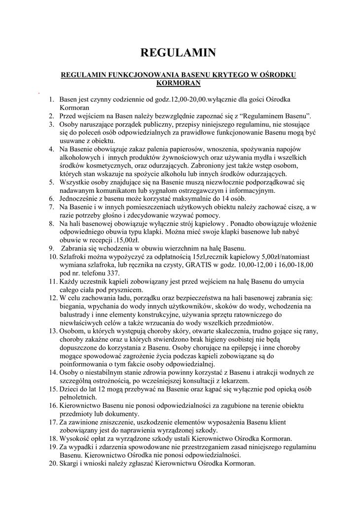 REGULAMIN REGULAMIN FUNKCJONOWANIA BASENU KRYTEGO W OŚRODKU KORMORAN . 1. Basen jest czynny codziennie od godz.12,00-20,00.wyłącznie dla gości Ośrodka Kormoran 2. Przed wejściem na Basen naleŜy bezwzględnie zapoznać się z “Regulaminem Basenu”. 3. Osoby naruszające porządek publiczny, przepisy niniejszego regulaminu, nie stosujące się do poleceń osób odpowiedzialnych za prawidłowe funkcjonowanie Basenu mogą być usuwane z obiektu. 4. Na Basenie obowiązuje zakaz palenia papierosów, wnoszenia, spoŜywania napojów alkoholowych i innych produktów Ŝywnościowych oraz uŜywania mydła i wszelkich środków kosmetycznych, oraz odurzających. Zabroniony jest takŜe wstęp osobom, których stan wskazuje na spoŜycie alkoholu lub innych środków odurzających. 5. Wszystkie osoby znajdujące się na Basenie muszą niezwłocznie podporządkować się nadawanym komunikatom lub sygnałom ostrzegawczym i informacyjnym. 6. Jednocześnie z basenu moŜe korzystać maksymalnie do 14 osób. 7. Na Basenie i w innych pomieszczeniach uŜytkowych obiektu naleŜy zachować ciszę, a w razie potrzeby głośno i zdecydowanie wzywać pomocy. 8. Na hali basenowej obowiązuje wyłącznie strój kąpielowy . Ponadto obowiązuje włoŜenie odpowiedniego obuwia typu klapki. MoŜna mieć swoje klapki basenowe lub nabyć obuwie w recepcji .15,00zł. 9. Zabrania się wchodzenia w obuwiu wierzchnim na halę Basenu. 10. Szlafroki moŜna wypoŜyczyć za odpłatnością 15zl,recznik kąpielowy 5,00zł/natomiast wymiana szlafroka, lub ręcznika na czysty, GRATIS w godz. 10,00-12,00 i 16,00-18,00 pod nr. telefonu 337. 11. KaŜdy uczestnik kąpieli zobowiązany jest przed wejściem na halę Basenu do umycia całego ciała pod prysznicem. 12. W celu zachowania ładu, porządku oraz bezpieczeństwa na hali basenowej zabrania się: biegania, wpychania do wody innych uŜytkowników, skoków do wody, wchodzenia na balustrady i inne elementy konstrukcyjne, uŜywania sprzętu ratowniczego do niewłaściwych celów a takŜe wrzucania do wody wszelkich przedmiotów. 13. Osobom, u których występują choroby skóry, otwarte skaleczenia, trudno gojące się rany, choroby zakaźne oraz u których stwierdzono brak higieny osobistej nie będą dopuszczone do korzystania z Basenu. Osoby chorujące na epilepsję i inne choroby mogące spowodować zagroŜenie Ŝycia podczas kąpieli zobowiązane są do poinformowania o tym fakcie osoby odpowiedzialnej. 14. Osoby o niestabilnym stanie zdrowia powinny korzystać z Basenu i atrakcji wodnych ze szczególną ostroŜnością, po wcześniejszej konsultacji z lekarzem. 15. Dzieci do lat 12 mogą przebywać na Basenie oraz kąpać się wyłącznie pod opieką osób pełnoletnich. 16. Kierownictwo Basenu nie ponosi odpowiedzialności za zagubione na terenie obiektu przedmioty lub dokumenty. 17. Za zawinione zniszczenie, uszkodzenie elementów wyposaŜenia Basenu klient zobowiązany jest do naprawienia wyrządzonej szkody. 18. Wysokość opłat za wyrządzone szkody ustali Kierownictwo Ośrodka Kormoran. 19. Za wypadki i zdarzenia spowodowane nie przestrzeganiem zasad niniejszego regulaminu Basenu. Kierownictwo Ośrodka nie ponosi odpowiedzialności. 20. Skargi i wnioski naleŜy zgłaszać Kierownictwu Ośrodka Kormoran. REGULAMIN UśYTKOWANIA SAUNY SAUNA JEST CZYNNA OD GODZ-14,00-19,00 1. Z sauny mogą korzystać osoby, które ukończyły 15 lat. Osoby poniŜej 15 lat mogą korzystać z sauny wyłącznie z pełnoletnim opiekunem. 2. Korzystanie z sauny przez dzieci poniŜej 6 lat i osoby powyŜej 50 lat powinno być skonsultowane z lekarzem. 3. W saunie moŜe przebywać maksymalnie do 4 osób. 4. Korzystający z kąpieli w saunie mają obowiązek uŜywania ręcznika kąpielowego 5. Sauna osiąga temperaturę od 60 do 70 stopni Celsjusza 6. Wartość temperatury widoczna jest na termometrze umieszczonym wewnątrz sauny jak i na zewnątrz w drewnianej skrzynce 7. KaŜdy korzystający podejmuje kąpiel w saunie na własne ryzyko i odpowiedzialność. 8. Zabrania się korzystania z sauny osobom, których stan zdrowia, a zwłaszcza choroby serca mogą stanowić zagroŜenie utraty zdrowia lub Ŝycia. 9. W przypadku nagłego pogorszenia się samopoczucia w saunie naleŜy powiadomić o tym fakcie obsługę sauny. 10. Przed rozpoczęciem kąpieli korzystający z sauny mają obowiązek zapoznania się ze szczegółowymi wskazaniami i przeciwwskazaniami do stosowania sauny oraz z instrukcją uŜytkowania. 11. W saunie zabrania się: przesuwania oraz dotykania pieca i kamieni, leŜenia lub siedzenia bezpośrednio na deskach ławki (bez rozścielonego ręcznika) nieuzasadnionego uŜywania dzwonka alarmowego, otwieranie sterownika sauny, niszczenie wyposaŜenia sauny, wchodzenia do sauny pod wpływem alkoholu, silnych lekarstw lub narkotyków, 12. W saunie obowiązują ogólne przyjęte zasady dobrego wychowania. 13. O kaŜdej sytuacji zagraŜającej bezpieczeństwu w saunie oraz jej uszkodzeniu naleŜy niezwłocznie powiadomić obsługę obiektu. INSTRUKCJA BEZPIECZNEGO KORZYSTANIA Z SAUNY Z sauny naleŜy korzystać w kostiumie bawełnianym. Wskazane jest siedzenie lub leŜenie na ławkach na własnym ręczniku. Niedozwolone jest korzystanie z sauny z kolczykami, biŜuterią, łańcuszkami i zegarkami. W saunie nie naleŜy przebywać w okularach i szkłach kontaktowych. Z sauny nie mogą korzystać osoby: • chore na serce, z nadciśnieniem, po udarach, • z chorobami naczyń krwionośnych, w ciąŜy, • ze stanami zapalnymi narządów wewnętrznych, • z gorączką, chore na tarczycę, chore na padaczkę (epilepsję), • małe dzieci z powodu braku wykształcenia w organizmie ośrodka termoregulacji. 6. Najkorzystniejsza temperatura dla ciała to 70-90*C. 7. Dwukrotne wejście do sauny na około 15 min. kaŜde, jest wystarczającym zabiegiem dla naszego organizmu. 8. W przerwie i po zakończeniu seansu wskazany jest wypoczynek. 9. Po wyjściu z sauny naleŜy umyć ciało i ochłodzić 