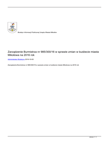 Zarządzenie Burmistrza nr 985/300/16 w sprawie zmian w budżecie