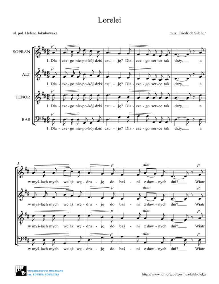 Lorelei sł. pol. Helena Jakubowska muz. Friedrich Silcher ° ## 6 p j j j j j œ™ œ œ œJ œJ œ œ™ œ œ œ œj œj j œj œ™ œj ‰ œ SOPRAN & 8 œ R J œ 1. Dla - cze - go nie - po- kój dziś czu - ję? Dla - cze - go ser - ce tak ALT a ## 6 p j j r j j j j œ œ & 8 œ œ™ œ œ J œ œ™ œ œj œ œj j j j œ™ œj ‰ œ œ œ œ ## 6 pœ œ ™ œ œ œ œ œ œ ™ j j j j j œ œ œ ‰ J œ œ œ œ œ œ™ œ & 8J J R J J J J J ‹ 1. Dla - cze - go nie-po-kój dziś czu - ję? Dla - cze - go ser - ce tak drży, a 1. Dla - cze - go nie - po- kój dziś czu - ję? Dla - cze - go ser - ce tak TENOR drży, ? ## 6 œ BAS 8J ¢ p ° ## j j œ œ œ œ™ & œ™ œR œ J j œ œ œ # j r j j & # œ™ œ œ œ œ œ œ™ j œ œ œ 5 ? ## œ ™ œ œ ¢ J R J w myś - lach mych p wciąż wę - dru - ję ## œ ™ œ œ œ œ œ™ & J R J J ‹ w myś-lach mych wciąż wę - dru w myś - lach mych a œ œ j j j ™ œ ™ œ œ œj œj œj œ ™ œ œJ J œ œ œ œ œ ‰ œ J R J J J 1. Dla - cze - go nie - po- kój dziś czu - ję? Dla - cze - go ser - ce tak w myś - lach mych drży, wciąż wę - dru - ję œ j œ œ™ do p baś do baś - - - ję do baś œ pœ œ J wciąż wę - dru - ję do baś - - a j j œ œ œ œ œ™ j ‰ œj œ j j œ œ œ œ œ™ j ‰ j œ œ j dim. œ œ p j ‰ œj œ dim. p œ œ œ J drży, ni z daw - nych dim. dni? ni z daw - nych dni? j œ œ™ ni z daw - nych œ dim. J œ dni? j ™ œ œ ni z daw - nych dni? p Wiatr p Wiatr Wiatr p œ ‰ œ J J Wiatr http://www.idn.org.pl/towmuz/biblioteka ° ## j r j j j j œ™ & œ™ œ œ œ œ œ 2 9 szu - mi, z fa - la - mi coś œ ga - ## & j™ œr j œj j j œ ™ œ œ œ œ szu - mi, z fa - la - mi coś ga - œ œ J rit. j œ #œ œ œ œ™ J j œ œ j œ œ p da, mknie wart - ko Re - nu p œ a tempo œ nurt, j œ œ rit. da, mknie wart - ko Re - nu nurt, j œ mf płaszcz mf j œ œ œ œj płaszcz p rit. ## j r j œ j j œ œ mf œ œ œ œ œ œ œ œ œ œ œ & œ™ œ œ J œ œ œ J J J J J J ‹ szu - mi, z fa - la - mi coś ga - da, mknie wart - ko Re - nu nurt, płaszcz ? ## j r j j j j œ™ œ œ œ œ œ œ™ ¢ szu - mi, z fa - la - mi coś p œ œ J œ ga - œ œ J da, mknie wart - ko Re - nu ° ## j j œ œ œ œ œ œ œ œ œ™ œ œ J & J R J J J 13 mro - ku po - wo - li o - pa - da na skal ## j r j j j j j œ œ œ & œ™ œ œ J œ œ œ œ œ mro - ku po - wo - li o - pa ## œ ™ œ œ œ œ œ œ ™ & J R J J J J ‹ mro - ku po - wo - li o - pa ? ## œ ™ œ œ j j j œ ™ ¢ J R J œ œ œ mro - ku po - wo - li o - pa - da - œ œ œ œ J - ™ œ œ J rit. da na na skal skal œ œ œ J da na skal - - - nurt, œ j œ œ j œ œ™ œ œ œ J œ œ™ J œ j ™ œ œ œ ne szczy - ty ne szczy - ty ne szczy - ty ne szczy - ty œ J mf płaszcz œ œ œ œ œ™ J J œ œ J - œ gór. gór. gór. gór. http://www.idn.org.pl/towmuz/biblioteka 3 2. Dziewczyna niezwykłej urody usiadła w górze wśród skał. Jej wzrok biegnie w stronę wody, jej myśli gonią wiatr. W poświacie tak lśni piękna szata, klejnoty zdobią pierś... Dziewczyna warkocze zaplata i dziwną śpiewa pieśń. 3. Łódeczka maleńka i krucha przecina wzburzoną toń. To żeglarz się w śpiew zasłuchał, na oślep płynie doń. Niebaczny na wiry dokoła w ułudzie widzi raj... Już nic go ocalić nie zdoła od czarów Lorelei. http://www.idn.org.pl/towmuz/biblioteka