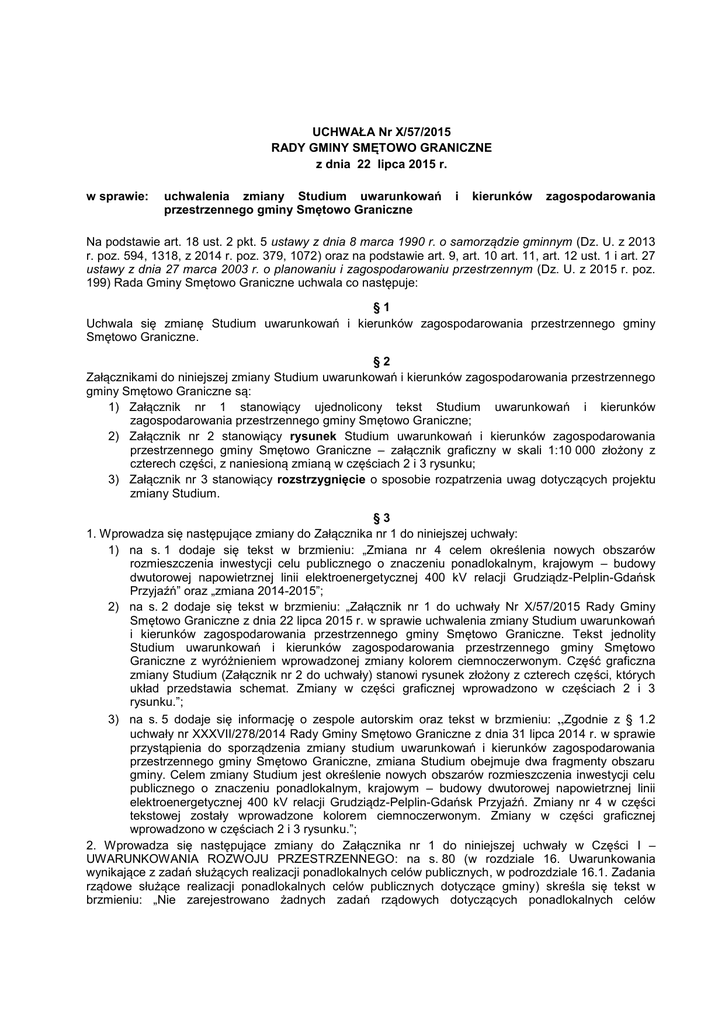 UCHWAŁA Nr X/57/2015 RADY GMINY SMĘTOWO GRANICZNE z dnia 22 lipca 2015 r. w sprawie: uchwalenia zmiany Studium uwarunkowań przestrzennego gminy Smętowo Graniczne i kierunków zagospodarowania Na podstawie art. 18 ust. 2 pkt. 5 ustawy z dnia 8 marca 1990 r. o samorządzie gminnym (Dz. U. z 2013 r. poz. 594, 1318, z 2014 r. poz. 379, 1072) oraz na podstawie art. 9, art. 10 art. 11, art. 12 ust. 1 i art. 27 ustawy z dnia 27 marca 2003 r. o planowaniu i zagospodarowaniu przestrzennym (Dz. U. z 2015 r. poz. 199) Rada Gminy Smętowo Graniczne uchwala co następuje: §1 Uchwala się zmianę Studium uwarunkowań i kierunków zagospodarowania przestrzennego gminy Smętowo Graniczne. §2 Załącznikami do niniejszej zmiany Studium uwarunkowań i kierunków zagospodarowania przestrzennego gminy Smętowo Graniczne są: 1) Załącznik nr 1 stanowiący ujednolicony tekst Studium uwarunkowań i kierunków zagospodarowania przestrzennego gminy Smętowo Graniczne; 2) Załącznik nr 2 stanowiący rysunek Studium uwarunkowań i kierunków zagospodarowania przestrzennego gminy Smętowo Graniczne – załącznik graficzny w skali 1:10 000 złożony z czterech części, z naniesioną zmianą w częściach 2 i 3 rysunku; 3) Załącznik nr 3 stanowiący rozstrzygnięcie o sposobie rozpatrzenia uwag dotyczących projektu zmiany Studium. §3 1. Wprowadza się następujące zmiany do Załącznika nr 1 do niniejszej uchwały: 1) na s. 1 dodaje się tekst w brzmieniu: „Zmiana nr 4 celem określenia nowych obszarów rozmieszczenia inwestycji celu publicznego o znaczeniu ponadlokalnym, krajowym – budowy dwutorowej napowietrznej linii elektroenergetycznej 400 kV relacji Grudziądz-Pelplin-Gdańsk Przyjaźń” oraz „zmiana 2014-2015”; 2) na s. 2 dodaje się tekst w brzmieniu: „Załącznik nr 1 do uchwały Nr X/57/2015 Rady Gminy Smętowo Graniczne z dnia 22 lipca 2015 r. w sprawie uchwalenia zmiany Studium uwarunkowań i kierunków zagospodarowania przestrzennego gminy Smętowo Graniczne. Tekst jednolity Studium uwarunkowań i kierunków zagospodarowania przestrzennego gminy Smętowo Graniczne z wyróżnieniem wprowadzonej zmiany kolorem ciemnoczerwonym. Część graficzna zmiany Studium (Załącznik nr 2 do uchwały) stanowi rysunek złożony z czterech części, których układ przedstawia schemat. Zmiany w części graficznej wprowadzono w częściach 2 i 3 rysunku.”; 3) na s. 5 dodaje się informację o zespole autorskim oraz tekst w brzmieniu: „Zgodnie z § 1.2 uchwały nr XXXVII/278/2014 Rady Gminy Smętowo Graniczne z dnia 31 lipca 2014 r. w sprawie przystąpienia do sporządzenia zmiany studium uwarunkowań i kierunków zagospodarowania przestrzennego gminy Smętowo Graniczne, zmiana Studium obejmuje dwa fragmenty obszaru gminy. Celem zmiany Studium jest określenie nowych obszarów rozmieszczenia inwestycji celu publicznego o znaczeniu ponadlokalnym, krajowym – budowy dwutorowej napowietrznej linii elektroenergetycznej 400 kV relacji Grudziądz-Pelplin-Gdańsk Przyjaźń. Zmiany nr 4 w części tekstowej zostały wprowadzone kolorem ciemnoczerwonym. Zmiany w części graficznej wprowadzono w częściach 2 i 3 rysunku.”; 2. Wprowadza się następujące zmiany do Załącznika nr 1 do niniejszej uchwały w Części I – UWARUNKOWANIA ROZWOJU PRZESTRZENNEGO: na s. 80 (w rozdziale 16. Uwarunkowania wynikające z zadań służących realizacji ponadlokalnych celów publicznych, w podrozdziale 16.1. Zadania rządowe służące realizacji ponadlokalnych celów publicznych dotyczące gminy) skreśla się tekst w brzmieniu: „Nie zarejestrowano żadnych zadań rządowych dotyczących ponadlokalnych celów publicznych odnoszących się do obszaru gminy Smętowo Graniczne.” oraz dodaje się tekst w brzmieniu: „W Planie zagospodarowania przestrzennego województwa pomorskiego (zatwierdzonego Uchwałą Nr 1004/XXXIX/09 Sejmiku województwa pomorskiego z dnia 26 października 2009 roku) wskazano, że stan techniczny linii elektroenergetycznych 400 i 220 kV jest dobry, wymagają one jednak modernizacji ze względu na konieczność zwiększenia ich zdolności przesyłowych; w ramach tych działań przewiduje się zmianę napięcia z 220 kV na 400 kV (PZPW, s. 117). W zakresie zaopatrzenia w energię elektryczną planuje się budowę, rozbudowę i modernizację elektroenergetycznej sieci przesyłowej najwyższych napięć w tym m.in.: budowę nowych linii elektroenergetycznych 400 kV Żydowo – Słupsk, Żydowo – Stężyca, Stężyca – Pelplin, Pelplin – Grudziądz, Żarnowiec – Stężyca; przebudowę istniejących linii 220 kV na 400 kV na odcinku: Żydowo – Stężyca. (PZPW, s. 253).”; 3. Wprowadza się następujące zmiany do Załącznika nr 1 do niniejszej uchwały w Części II – KIERUNKI ROZWOJU PRZESTRZENNEGO, POLITYKA PRZESTRZENNA: 1) na s. 107 (w rozdziale 9. Obszary przestrzeni chronionej o istotnych ograniczeniach lub proponowane do wyłączenia z zainwestowania. (ograniczenia w lokalizacji zabudowy). Kierunki zagospodarowania dla tych obszarów, w podrozdziale 9.5. Inne ograniczenia w lokalizacji zabudowy) dodaje się tekst w brzmieniu: „pas technologiczny linii elektroenergetycznej 400 kV o szerokości 70 m (2 x 35 m od osi linii),”; 2) na s. 108 (w rozdziale 9. Obszary przestrzeni chronionej o istotnych ograniczeniach lub proponowane do wyłączenia z zainwestowania. (ograniczenia w lokalizacji zabudowy). Kierunki zagospodarowania dla tych obszarów, w podrozdziale 9.5. Inne ograniczenia w lokalizacji zabudowy) dodaje się tekst w brzmieniu: „Przed wydaniem decyzji o pozwoleniu na budowę istnieje wymóg zgłaszania wszelkich obiektów stałych i tymczasowych o wysokości równej i większej od 50 m nad poziomem terenu do Szefostwa Służby Ruchu Lotniczego.”; 3) na s. 125 (w rozdziale 14. Kierunki rozwoju systemów infrastruktury technicznej, w podrozdziale 14.6. Zaopatrzenie w energię elektryczną) zmienia się tekst w brzmieniu „Dla linii 110 kV obowiązuje 