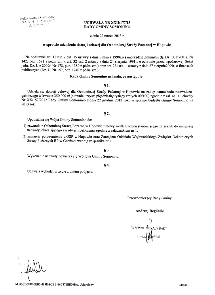 UCHWALA NR XXII/I 77 /13 RADY GMINY SOMONINO Na podstawie art. 18 ust. 2 pkt. 15 ustawy z dnia 8 marca 1990r.o samorządzie gminnym (tj. Dz. U. z 200lr. Nr 142, poz. 1591 z późno zm.), art. 32 ust. 2 ustawy z dnia 24 sierpnia 1991r. o ochronie przeciwpożarowej (tekst jedno Dz. U.z 2009r. Nr 178, poz. 1380 z późno zm.) oraz art. 221 ust. 1 ustawy z dnia 27 sierpnia2009r. o finansach publicznych (Dz. U. Nr 157, poz. 1240 z późno zm.) Rada Gminy Somonino uchwala, co następuje: Udziela się dotacji celowej dla Ochotniczej Straży Pożarnej w Hopowie na zakup samochodu ratowniczogaśniczego w kwocie 350.000 zł (słownie: trzysta pięćdziesiąt tysięcy złotych 00/100) zgodnie z zał. nr 11 uchwały Nr XX/157/20l2 Rady Gminy Somoninio z dnia 22 grudnia 2012 roku w sprawie budżetu Gminy Somonino na 2013 rok. Upoważnia się Wójta Gminy Somonino do: 1) zawarcia z Ochotniczą Strażą Pożarną w Hopowie umowy według wzoru stanowiącego załącznik do niniejszej uchwały, określającego zasady jej rozliczenia zgodnie z załącznikiem nr 1. 2) zawarcia porozumienia z OSP w Hopowie oraz Zarządem Oddziału Wojewódzkiego Związku Ochotniczych Straży Pożarnych RP w Gdańsku według załącznika nr 2. Załączniknr 1 do uchwały Rady Gminy Somonino Nr XXII/177/13z dnia 22 marca 2013r. l. Gminą Somonino, zwaną dalej Dotującym, reprezentowaną przez Wójta Gminy - Pana Mariana Kryszewskiego oraz 2. Zarządem Ochotniczej Straży Pożarnej w Ropowie, zwanym dalej OSP, na podstawie: 1. Art. 32 ust. 2 ustawy z dnia 24 sierpnia 1991r. o ochronie przeciwpożarowej (tekst jedno Dz. U. z 2009 r. Nr 178, poz. 1380 z późnozm.) 2. Art. 221 ustawy z dnia 27 sierpnia 2009r. o finansach publicznych (Dz. U. Nr 157, poz. 1240 z późno zm.) 3. Uchwały Nr ./ /2013 Rady Gminy Somonino z dnia 2013r. w sprawie udzielania dotacji dla Ochotniczej Straży Pożarnej w Ropowie. o następującej treści: §1 l. Na podstawie mmeJszeJ umowy Dotujący udziela OSP pomocy finansowej w formie dotacji celowej w wysokości 350.000,00 zł (słownie: trzysta pięćdziesiąt tysięcy złotych 00/100) z przeznaczeniem na dofinansowanie zakupu samochodu ratowniczo - gaśniczego. 2. Kwota, o której jest mowa w ust. l zostanie przekazana na konto OSP nr o oo o.... ..... - w terminie 7 dni od daty otrzymania podpisanej umowy. 3. OSP nie może przeznaczyć kwoty, o której mowa w ust. l na realizację innych celów niż objętych niniejszą umową. §2 OSP zobowiązuje się do terminowej realizacji zadania inwestycyjnego. §3 l. Dotacja celowa, o której mowa w § l może być wykorzystana w nieprzekraczalnym terminie do dnia 30 listopada 2013 roku. 2. W terminie przedstawi 9 dni od daty wykorzystania Dotującemu rozliczenie środków przyznanych finansowych oraz zwróci niewykorzystaną z pomocy i publicznej, wykorzystanych OSP środków część dotacji celowej na rachunek bankowy Urzędu Gminy Somonino nr 91 8309 0000 0080 O l 05 2000 0020 3. Rozliczenie, o którym mowa w ust. 2 będzie polegało na przedłożeniu uwierzytelnionych przez umocowane osoby kserokopii faktur, rachunków przez OSP lub innych dowodów księgowych wraz z dokumentami przelewu . 4. Środki dotacji celowej wykorzystane nadmiernej wysokości podlegają niezgodnie z przeznaczeniem zwrotowi do Dotującego wysokości określonej jak dla zaległości podatkowych wraz lub pobrane w z odsetkami w w terminie do dnia 31 grudnia 20 13r. na konto bankowe wskazane w ust. 2. 5. Odsetki, wykorzystanej o których mowa w ust. 4 nalicza niezgodnie z przeznaczeniem OSP do dnia zwrotu włącznie, SIę w przypadku od dnia przekazania a w przypadku stwierdzenia zwrotu dotacj i dotacji na rachunek nienależnego pobrania dotacji od dnia tego stwierdzenia do dnia zwrotu włącznie. Gmina Somonino zastrzega sobie prawo kontroli w zakresie prawidłowości, i rzetelności realizacji dotowanego zadania, w tym dokumentów zgodności finansowych w terminie do 3 lat od dnia, w którym nastąpiło rozliczenie dotacji. Wszelkie zmiany umowy wymagają dla swej ważności formy pisemnej w formie aneksu. §6 W sprawach nieuregulowanych niniejszą umową zastosowanie mieć będą przepisy ustawy o finansach publicznych, o samorządzie gminnym oraz przepisy pozostające w związku z niniejszą umową. §7 Ewentualne spory wynikające z niniejszej umowy rozstrzygane będą przez strony w drodze wspólnych uzgodnień, a w przypadku nie osiągnięcia właściwym do rozstrzygania będzie Sąd Rejonowy w porozumiema, . §8 Umowa została sporządzona w 2 jednobrzmiących egzemplarzach po l egz. dla każdej ze stron. Załącznik nr2 do uchwały Rady Gminy Somonino Nr XXIIIl77/13z dnia 22 marca 2013r. zawarte w dniu pomiędzy Gminą Somonino zwaną dalej "Gminą" reprezentowaną przez: - Mariana Kryszewskiego - Wójta Gminy Ochotniczą Strażą Pożarną w Hopowie, zwaną dalej OSP, reprezentowaną przez: - Ryszarda Pyszka - Prezesa OSP Hopowo a Zarządem Oddziału Wojewódzkiego Związku Ochotniczych Straży Pożarnych RP w Gdańsku, reprezentowanym przez: - Grzegorza Pladzyka - Dyrektora Zarządu Wykonawczego OW ZOSP RP w Gdańsku, zwany dalej "Oddziałem Wojewódzkim ZOSP RP" §1 l. Gmina zobowiązuje się do przekazania na zakup średniego samochodu, ratowniczo-gaśniczego, kwoty wynikającej z przetargu przeprowadzonego przez Oddział Wojewódzki ZOSP RP pomniejszonej o wysokość dotacji wymienionej w § 2 oraz wpłaty OSP wymienionej w § 3. W przypadku nie wykorzystania tych środków, bądź wykorzystania ich niezgodnie z przeznaczeniem (przekazana) kwota podlega zwrotowi. 2. Kwota, o której mowa w ust. l zostanie przekazana przez Gminę w fonnie dotacji celowej dla OSP Hopowo. §2 Oddział Wojewódzki ZOSP RP w Gdańsku realizuje dotację KW PSP - środki KSRG w wysokości IS0.000zł (słownie: sto pięćdziesiąt tysięcy), która wraz z kwotą przekazaną przez Gminę i OSP (określoną w § l i 3), zostanie wykorzystana na zakup średniego samochodu ratowniczo-gaśniczego z 