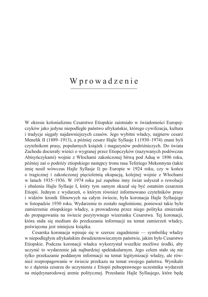 Wprowadzenie W okresie kolonializmu Cesarstwo Etiopskie zaistniało w świadomości Europejczyków jako jedyne niepodległe państwo afrykańskie, którego cywilizacja, kultura i tradycje sięgały najdawniejszych czasów. Jego wybitni władcy, najpierw cesarz Menelik II (1889–1913), a później cesarz Hajle Syllasje I (1930–1974) znani byli czytelnikom prasy, popularnych książek i magazynów podróżniczych. Do świata Zachodu docierały wieści o wygranej przez Etiopczyków (nazywanych podówczas Abisyńczykami) wojnie z Włochami zakończonej bitwą pod Aduą w 1896 roku, później zaś o podróży etiopskiego następcy tronu rasa Teferiego Mekonnyna (takie imię nosił wówczas Hajle Syllasje I) po Europie w 1924 roku, czy w końcu o tragicznej i zakończonej pięcioletnią okupacją, kolejnej wojnie z Włochami w latach 1935–1936. W 1974 roku już zupełnie inny świat usłyszał o rewolucji i obaleniu Hajle Syllasje I, który tym samym okazał się być ostatnim cesarzem Etiopii. Jednym z wydarzeń, o którym również informowano czytelników prasy i widzów kronik filmowych na całym świecie, była koronacja Hajle Syllasjego w listopadzie 1930 roku. Wydarzenie to zostało nagłośnione, ponieważ takie było zamierzenie etiopskiego władcy, a prowadzona przez niego polityka zmierzała do propagowania na świecie pozytywnego wizerunku Cesarstwa. Tej koronacji, która stała się medium do przekazania informacji na temat zamierzeń władcy, poświęcona jest niniejsza książka. Cesarska koronacja wpisuje się w szersze zagadnienie — symbolikę władzy w niepodległym afrykańskim dwudziestowiecznym państwie, jakim było Cesarstwo Etiopskie. Podczas koronacji władca wykorzystał wszelkie możliwe środki, aby uczynić to wydarzenie jak najbardziej spektakularnym. Jego celem stało się nie tylko przekazanie poddanym informacji na temat legitymizacji władzy, ale również rozpropagowanie w świecie przekazu na temat swojego państwa. Wynikało to z dążenia cesarza do uczynienia z Etiopii pełnoprawnego uczestnika wydarzeń na międzynarodowej arenie politycznej. Przesłanie Hajle Syllasjego, które będę 12 Wprowadzenie próbowała zdefiniować na kartach tej książki, oscylowało pomiędzy odwołaniami do tradycji i długiej historii Cesarstwa oraz dążeniem do zmian w sposobie działania państwa i życia jego mieszkańców. Moim celem jest analiza wydarzenia, jakim była koronacja, oraz symboliki jego poszczególnych elementów. Zamierzam podjąć próbę odczytania przekazu zawartego w ceremonii intronizacyjnej etiopskiego władcy i odpowiedzieć na pytanie o to, jakimi sposobami przekazywano informację dotyczącą najważniejszego problemu ówczesnej Etiopii, jakim było jej miejsce — miejsce starożytnego afrykańskiego cesarstwa — w świecie XX wieku. Innymi słowy, celem niniejszej pracy jest analiza propagandowego przekazu służącego tworzeniu wizerunku państwa i jego władcy. Truizmem, coraz częściej powtarzanym w kolejnych publikacjach jest stwierdzenie, że oddawana w ręce czytelnika książka nie powstałaby bez wsparcia wielu osób. Prawdziwość tych słów mogą potwierdzić jednak ci, którym przyszło zmierzyć się z opracowaniem i wydaniem drukiem wybranego zagadnienia, czyli z napisaniem książki. Praca nad tą książką przyniosła mi przekonanie, że niewyczerpane są pokłady cierpliwości, bezinteresownej chęci pomocy i życzliwości bliźnich. Jestem szczerze i ogromnie wdzięczna wielu osobom, którzy popychali mnie — czasami wbrew mojej woli — w kierunku celu, wspierali merytorycznie, dobrym słowem i kubkiem herbaty. Dlatego chciałam podziękować moim koleżankom i kolegom z Katedry Języków i Kultur Afryki Uniwersytetu Warszawskiego. Nie mam wątpliwości, że wszyscy, nawet jeżeli nie przyczynili się bezpośrednio do powstania tej książki, życzyli mi powodzenia w pracy. Jestem im za to bardzo wdzięczna. Książka ta nie powstałaby też bez finansowego wsparcia ze strony mojej macierzystej Katedry oraz Fundacji Uniwersytetu Warszawskiego, które to instytucje umożliwiły mi wielokrotne wyjazdy badawcze do Etiopii, a co za tym idzie zbieranie materiałów i obcowanie z kulturą in situ. Państwowemu Muzeum Etnograficznemu w Warszawie oraz Anglo-Ethiopian Society w Londynie dziękuję za udostępnienie materiałów. Za wielogodzinne dyskusje o rytuałach i symbolach władzy w Afryce wdzięczna jestem dr hab. Robertowi Piętkowi, za dobre rady i odpowiedzi na niekończące się pytania daleko wykraczające poza etiopską kulturę, dr Marcinowi Krawczukowi. Prof. dr hab. Ninie Pawlak, prof. dr hab. Stanisławowi Piłaszewiczowi i dr hab. Kamilowi Kuraszkiewiczowi za wsparcie, koleżeńskie i formalne. Prof. dr hab. Ewie Pałasz-Rutkowskiej za celne spostrzeżenia, dr hab. Katrin Bromber, dr hab. Paulinie Lewickiej, prof. Michaelowi Gerversowi i dr Wolbertowi Smidtowi za podpowiedzi i materiały. Dr Izabeli Will i dr Ewie Wołk-Sore za uważną lekturę myśli lepiej i gorzej ubranych w słowa. Kustosz biblioteki Katedry Języków i Kultur Afryki, Bożennie Hanczce-Wrzosek za wiele wspólnych doświadczeń. Moi bliscy wiedzą za co i jak bardzo jestem im wdzięczna.