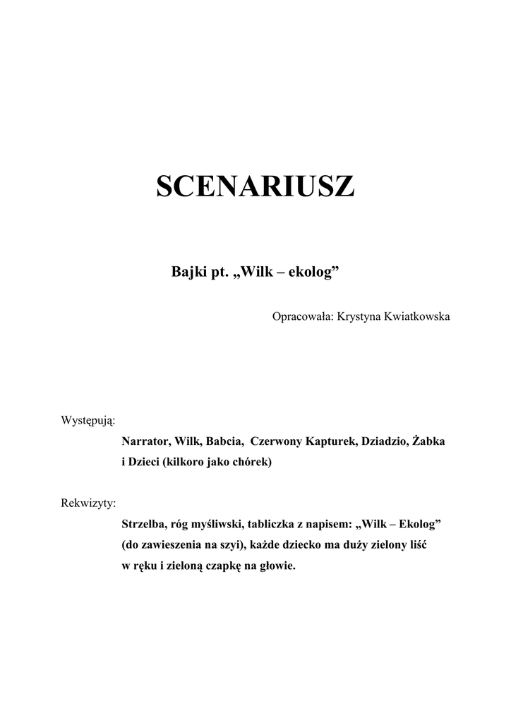 SCENARIUSZ Bajki pt. „Wilk – ekolog” Opracowała: Krystyna Kwiatkowska Występują: Narrator, Wilk, Babcia, Czerwony Kapturek, Dziadzio, śabka i Dzieci (kilkoro jako chórek) Rekwizyty: Strzelba, róg myśliwski, tabliczka z napisem: „Wilk – Ekolog” (do zawieszenia na szyi), kaŜde dziecko ma duŜy zielony liść w ręku i zieloną czapkę na głowie. Narrator: Pod zieloną ścianą lasu Tak, tam właśnie Robiła babunia kapturek z włóczki dla swej kochanej maleńkiej wnuczki Od tego kapturka i duzi, i mali Czerwonym Kapturkiem dziewczynkę nazwali. Chórek dzieci: Czerwonym Kapturkiem? Narrator: A co było dalej wszyscy dobrze wiecie … Dziadzio – to leśniczy najlepszy w powiecie. Babcia niedomaga biegnie przez las wnusia wilczysko się skrada połyka babusię. Chórek: No i małą wnusię! Wilk, który od początku akcji przykucnął tyłem do widowni w głębi sceny obok kronikarza (obaj w czerni) wykonuje czynności jak w tekście: skrada się, „połyka” – nakrywa szeroką czarną peleryną babcię i wnusię. Kronikarz, będący mimowolnym świadkiem zdarzenia, podnosi się. Kronikarz: Pogoda jak złoto a słonko przygrzewa będzie – li wilk ubit? Wszystko jako drzewiej? Wilk: A ty kto u licha? Dziwna twoja mowa! Kronikarz: Z czternastego wieku jam Janko z Czarnkowa. Przed siedmiuset laty polowano co dnia. Wnet wyzioniesz ducha. Dziadzio celuje w wilka. Wilk: Co ??? A ekologia ??? Ochrona przyrody ??? To jest sprawa nowa! Kronikarz: Drogi Przyjacielu! Słowa. Słowa. Słowa. Narrator: Dziadzio migiem pojął wszystko i … ogłuszył to wilczysko. Babcia z wnuczką wyskakują spod peleryny Dziadzio: Puścimy cię bezpiecznie tylko odtąd Ŝyj grzecznie!! Narrator: Nie minęła jedna chwilka i juŜ nikt nie poznał wilka: do zwierzaczków się uśmiecha, Ŝe aŜ patrzeć jest uciecha, kwiatki wącha, sobie śpiewa tańczy z Ŝabką koło drzewa Wilk zachowuje się jak wyŜej w tekście. Tańczy z Ŝabką w takt melodii Chórek (śpiewa): Była sobie Ŝabka mała re re kum kum, re re kum kum co się mamy nie słuchała re re kum kum bęc. Na spacerek wychodziła re re kum kum, re re kum kum innym Ŝabkom się dziwiła re re kum kum bęc. A na brzegu stare Ŝaby re, re … rajcowały jak te baby re, re … bęc. Jedna drugiej w ucho kracze re, re … jak ta mała pięknie skacze re, re … bęc. Narrator: Ślimak patrzy … nie dowierza … Ślimak: Co za sympatyczne zwierzę! To dawne groźne wilczysko odmieniło w lesie wszystko! Czysto teraz i bezpiecznie. Przyjdźcie tu, do nas, koniecznie! Wilk na zmianę z Kronikarzem: WzdłuŜ Noteci ruszaj z nami borem, lasem, dolinami z wiatrem w polu stań w zawody a poczujesz się jak młody wilk. Słońce górą puszcza dołem lub odwrotnie, jak kto woli lecz pamiętaj na wybiegu: ziemię mamy tylko jedną. Narrator: Pan leśniczy z dziarską miną róg myśliwski w ręku trzyma. Dziadzio gra na rogu hejnał myśliwski. Dziadzio (skończywszy grać): Niech nowina w świat popłynie: wilk w opiece ma zwierzynę! Więc mu dzisiaj nadać mogę tytuł: Wilka – Ekologa! Zawiesza wilkowi na szyi odznaczenie, tabliczkę lub medal z napisem: WILK – EKOLOG. Gromkie brawa na scenie. Chórek (śpiewa na melodię „Było morze”): WzdłuŜ Noteci ruszaj z nami … Wilk i Kronikarz: (oraz chórek w tle ustawiony gęsiego imitując skradanie się na palcach …) Idźmy leśną ścieŜką cicho, cichuteńko moŜe zobaczymy sarniątko z sarenką. MoŜe zobaczymy wiewióreczkę małą jak wesoło skacze z gałęzi na gałąź. I niech nikt po lesie nie gwiŜdŜe nie woła moŜe usłyszymy pukanie dzięcioła. Po skończonym tekście Wilk i Kronikarz dołączają się do ustawionej grupy. Wszyscy zaczynają tekst od początku i grupa skradając się opuszcza scenę. Idźmy leśną ścieŜką cicho …