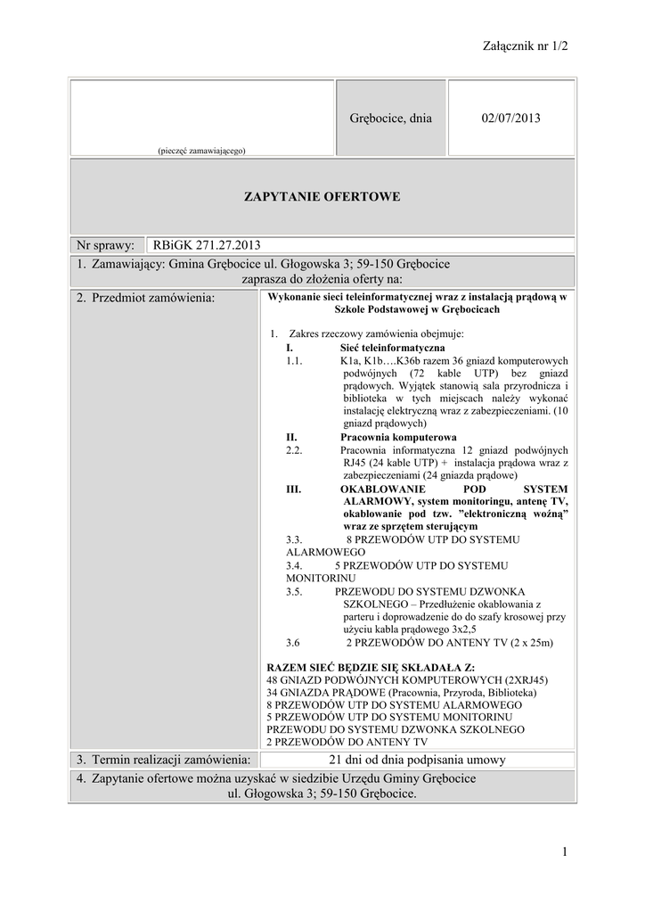 Załącznik nr 1/2 Grębocice, dnia 02/07/2013 (pieczęć zamawiającego) ZAPYTANIE OFERTOWE Nr sprawy: RBiGK 271.27.2013 1. Zamawiający: Gmina Grębocice ul. Głogowska 3; 59-150 Grębocice zaprasza do złożenia oferty na: Wykonanie sieci teleinformatycznej wraz z instalacją prądową w 2. Przedmiot zamówienia: Szkole Podstawowej w Grębocicach 1. Zakres rzeczowy zamówienia obejmuje: I. Sieć teleinformatyczna 1.1. K1a, K1b….K36b razem 36 gniazd komputerowych podwójnych (72 kable UTP) bez gniazd prądowych. Wyjątek stanowią sala przyrodnicza i biblioteka w tych miejscach należy wykonać instalację elektryczną wraz z zabezpieczeniami. (10 gniazd prądowych) II. Pracownia komputerowa 2.2. Pracownia informatyczna 12 gniazd podwójnych RJ45 (24 kable UTP) + instalacja prądowa wraz z zabezpieczeniami (24 gniazda prądowe) III. OKABLOWANIE POD SYSTEM ALARMOWY, system monitoringu, antenę TV, okablowanie pod tzw. ”elektroniczną woźną” wraz ze sprzętem sterującym 3.3. 8 PRZEWODÓW UTP DO SYSTEMU ALARMOWEGO 3.4. 5 PRZEWODÓW UTP DO SYSTEMU MONITORINU 3.5. PRZEWODU DO SYSTEMU DZWONKA SZKOLNEGO – Przedłużenie okablowania z parteru i doprowadzenie do do szafy krosowej przy użyciu kabla prądowego 3x2,5 3.6 2 PRZEWODÓW DO ANTENY TV (2 x 25m) RAZEM SIEĆ BĘDZIE SIĘ SKŁADAŁA Z: 48 GNIAZD PODWÓJNYCH KOMPUTEROWYCH (2XRJ45) 34 GNIAZDA PRĄDOWE (Pracownia, Przyroda, Biblioteka) 8 PRZEWODÓW UTP DO SYSTEMU ALARMOWEGO 5 PRZEWODÓW UTP DO SYSTEMU MONITORINU PRZEWODU DO SYSTEMU DZWONKA SZKOLNEGO 2 PRZEWODÓW DO ANTENY TV 3. Termin realizacji zamówienia: 21 dni od dnia podpisania umowy 4. Zapytanie ofertowe można uzyskać w siedzibie Urzędu Gminy Grębocice ul. Głogowska 3; 59-150 Grębocice. 1 Załącznik nr 1/2 5. Osoba do kontaktu u której można uzyskać dodatkowe informacje na temat zapytania ofertowego oraz dodatkową dokumentację (jeżeli nie było możliwe jej opublikowanie w BIP) określającą szczegółowe warunki udziału w postępowaniu o udzielenie zamówienia: Przemysław Fercho 6. Kryteria wyboru ofert: 100% - cena 7. Wymagania, jakie powinni spełniać wykonawcy zamówienia w zakresie dokumentów i oświadczeń (np. uprawnienia, posiadanie koncesji, zezwolenia): 1. Zamawiający uzna, że wykonawca spełnia warunek dotyczący posiadania wiedzy i doświadczenia niezbędnych do wykonania przedmiotowego zamówienia wówczas, gdy wykażą się doświadczeniem polegającym na wykonaniu w okresie ostatnich pięciu lat a jeżeli okres działalności jest krótszy - w tym okresie robót budowlanych odpowiadających przedmiotowi zamówienia tj. należytą realizację co najmniej 2 zamówień dotyczących budowy lub przebudowy sieci teleinformatycznej odpowiadających przedmiotowi zamówienia o wartości robót minimum 50 000,00 zł każda. Informacja powyższa winna wynikać ze złożonych przez wykonawcę dokumentów potwierdzających, że roboty te zostały wykonane zgodnie z zasadami sztuki budowlanej i prawidłowo ukończone. 2. Aby potwierdzić warunek dotyczący dysponowania osobami zdolnymi do wykonania zamówienia, wykonawca winien wykazać, że w okresie realizacji zamówienia będzie dysponował osobami posiadającymi uprawnienia i kwalifikacje w celu wykonania zamówienia tj.: a) kierownik budowy – co najmniej jedna osoba posiadająca uprawnienia w specjalności instalacyjnej w zakresie sieci, instalacji i urządzeń elektrycznych i elektromagnetycznych lub odpowiadające im równoważne uprawnienia budowlane, które zostały wydane na podstawie wcześniej obowiązujących przepisów. Ww. osoby muszą posiadać stwierdzenie przygotowania zawodowego do wykonywania samodzielnych funkcji w budownictwie w wymaganym zakresie w rozumieniu ustawy z dnia 7 lipca 1994r. Prawo budowlane (tekst jednolity: Dz. U. 2010, Nr 243, poz. 1623 ze zm.) oraz zaświadczenia o członkostwie we właściwej izbie samorządu zawodowego aktualne w terminie składania ofert w niniejszym postępowaniu. 3. Na potwierdzenie spełniania warunku udziału w postępowaniu w zakresie sytuacji ekonomicznej wykonawca winien wykazać, że jest ubezpieczony od odpowiedzialności cywilnej w zakresie prowadzonej działalności związanej z przedmiotem zamówienia na kwotę nie mniejszą niż 100.000,00 zł. 8. Szczegółowe wymogi, jakie powinna spełniać oferta: 2 Załącznik nr 1/2 złożony formularz ofertowy wraz z kosztorysem ofertowym Wykonawca ma prawo w obecności przedstawiciela zamawiającego sprawdzić miejsce realizacji zamówienia i dokonać własnych pomiarów i analiz porównawczych. W tym celu należy się skontaktować z osobą upoważnioną do kontaktów celem ustalenia terminu wizyty. 9. Wzór umowy lub istotne postanowienia umowy, które zostaną w jej treści zawarte (jeżeli jest wymagana forma pisemna umów na podstawie odrębnych przepisów zamawiającego): załącznik do zapytania ofertowego – projekt umowy 10. Wymagania dotyczące zabezpieczenia należytego wykonania umowy, sposobu oraz formy jego wniesienia (jeżeli jest wymagany): zgodnie z § 10 w projekcie umowy 11. Warunki gwarancji: Udzielona Gwarancja na wykonaną sieć komputerową 36 m-cy, na urządzenia aktywne minimum 24 m-ce W przypadku awarii sieci komputerowej w okresie gwarancyjnym Wykonawca zobowiązany jest stawić się na wezwanie Zamawiającego w ciągu 24 godzin od zgłoszenia telefonicznego, celem naprawy usterki. W przypadku nie usunięcia awarii w czasie 24 godzin należy dostarczyć sprzęt zastępczy. 12. Sposób przygotowania oferty: ofertę należy sporządzić w języku polskim, w formie pisemnej 13. faksem e-mailem Miejsce i termin składania ofert: ofertę należy w Centrum Obsługi 10.07.2013r. do godziny 12:00 złożyć do dnia Mieszkańca (pok. nr 1) w siedzibie Zamawiającego tj. w Urzędzie Gminy w Grębocicach ul. Głogowska 3, 59-150 Grębocice Tel. 076 831 55 01; faks 076 831 50 77 e-mail: [email protected] Z Up. Wójta /-/ Edyta Jakubowska – Leśniak sekretarz gminy (podpis