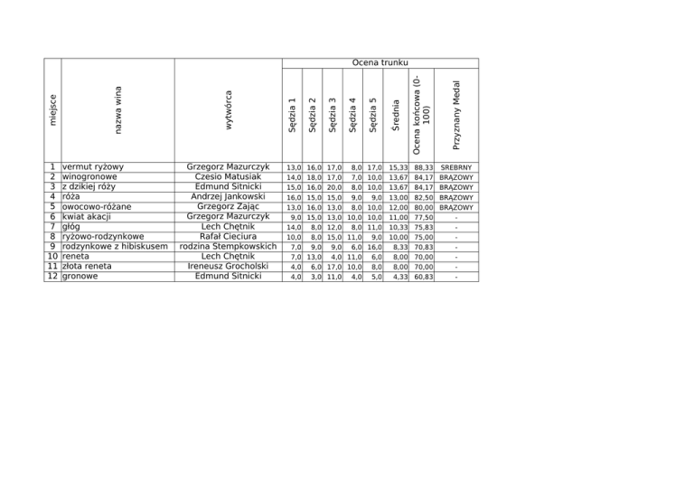miejsce nazwa wina wytwórca Ocena trunku Sędzia 1 Sędzia 2