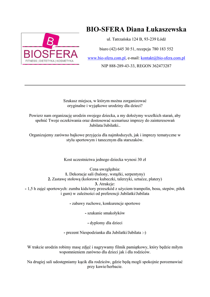BIO-SFERA Diana Łukaszewska ul. Tatrzańska 124 B, 93-239 Łódź biuro (42) 645 30 51, recepcja 780 183 552 www.bio-sfera.com.pl, e-mail: [email protected] NIP 888-289-43-33, REGON 362473287 Szukasz miejsca, w którym można zorganizować oryginalne i wyjątkowe urodziny dla dzieci? Powierz nam organizację urodzin swojego dziecka, a my dołożymy wszelkich starań, aby spełnić Twoje oczekiwania oraz dostosować scenariusz imprezy do zainteresowań Jubilata/Jubilatki.. Organizujemy zarówno bajkowe przyjęcia dla najmłodszych, jak i imprezy tematyczne w stylu sportowym i tanecznym dla starszaków. Kost uczestnictwa jednego dziecka wynosi 30 zł Cena uwzględnia: 1. Dekoracje sali (balony, wstążki, serpentyny) 2. Zastawę stołową (kolorowe kubeczki, talerzyki, sztućce, platery) 3. Atrakcje: - 1,5 h zajęć sportowych: zumba kids/tory przeszkód z użyciem trampolin, bosu, stepów, piłek i gum) w zależności od preferencji Jubilatki/Jubilata - zabawy ruchowe, konkurencje sportowe - szukanie smakołyków - dyplomy dla dzieci - prezent Niespodzianka dla Jubilatki/Jubilata :-) W trakcie urodzin robimy masę zdjęć i nagrywamy filmik pamiątkowy, który będzie miłym wspomnieniem zarówno dla dzieci jak i dla rodziców. Na drugiej sali udostępniamy kącik dla rodziców, gdzie będą mogli spokojnie porozmawiać przy kawie/herbacie. Tort, poczęstunek oraz napoje dla dzieci pozostawiamy w gestii rodziców. Zapraszamy do wspólnego świętowania :-) Klub BIO-SFERA