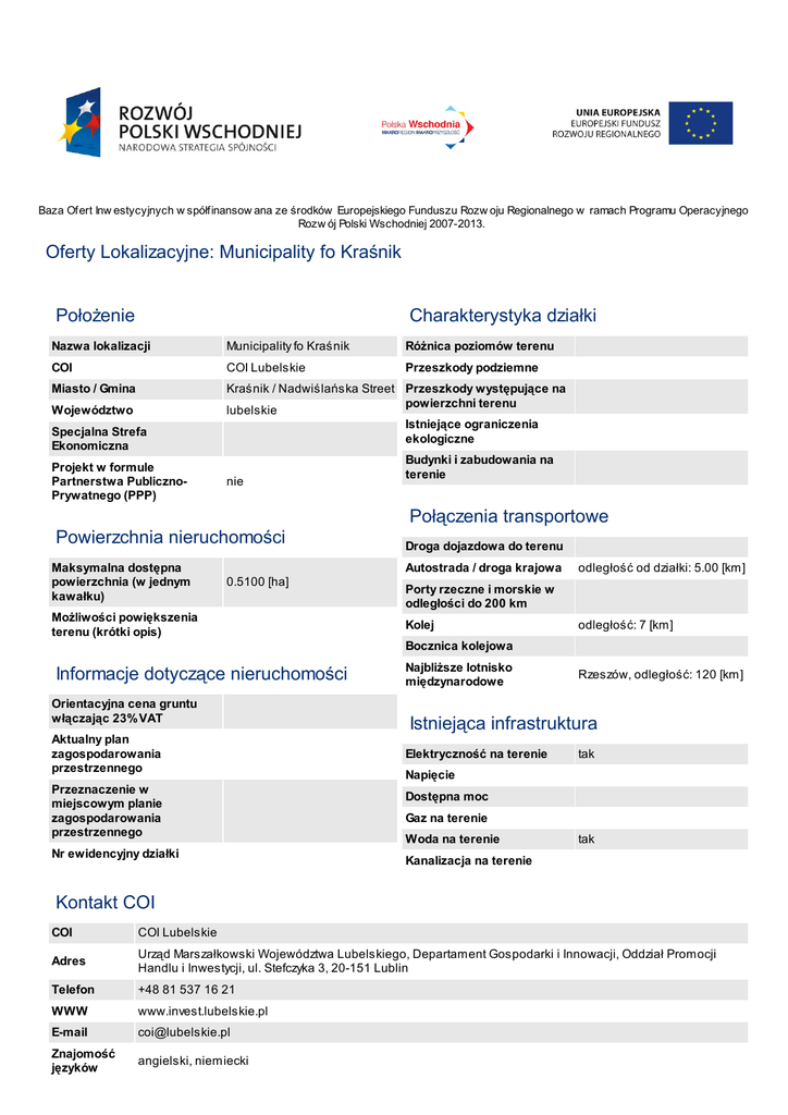 Baza Ofert Inw estycyjnych w spółfinansow ana ze środków Europejskiego Funduszu Rozw oju Regionalnego w ramach Programu Operacyjnego Rozw ój Polski Wschodniej 2007-2013. Oferty Lokalizacyjne: Municipality fo Kraśnik Położenie Charakterystyka działki Nazwa lokalizacji Municipality fo Kraśnik Różnica poziomów terenu COI COI Lubelskie Przeszkody podziemne Miasto / Gmina Kraśnik / Nadwiślańska Street Przeszkody występujące na powierzchni terenu lubelskie Istniejące ograniczenia ekologiczne Województwo Specjalna Strefa Ekonomiczna Projekt w formule Partnerstwa PublicznoPrywatnego (PPP) nie Budynki i zabudowania na terenie Połączenia transportowe Powierzchnia nieruchomości Maksymalna dostępna powierzchnia (w jednym kawałku) Droga dojazdowa do terenu Autostrada / droga krajowa 0.5100 [ha] Możliwości powiększenia terenu (krótki opis) odległość od działki: 5.00 [km] Porty rzeczne i morskie w odległości do 200 km Kolej odległość: 7 [km] Bocznica kolejowa Informacje dotyczące nieruchomości Orientacyjna cena gruntu włączając 23% VAT Aktualny plan zagospodarowania przestrzennego Przeznaczenie w miejscowym planie zagospodarowania przestrzennego Nr ewidencyjny działki Najbliższe lotnisko międzynarodowe Rzeszów, odległość: 120 [km] Istniejąca infrastruktura Elektryczność na terenie tak Napięcie Dostępna moc Gaz na terenie Woda na terenie tak Kanalizacja na terenie Kontakt COI COI COI Lubelskie Adres Urząd Marszałkowski Województwa Lubelskiego, Departament Gospodarki i Innowacji, Oddział Promocji Handlu i Inwestycji, ul. Stefczyka 3, 20-151 Lublin Telefon +48 81 537 16 21 WWW www.invest.lubelskie.pl E-mail [email protected] Znajomość języków angielski, niemiecki Zdjęcia Wydruk z: 2017-03-07 01:53:50 2012 © Polska Wschodnia. Wszelkie prawa zastrzeżone.