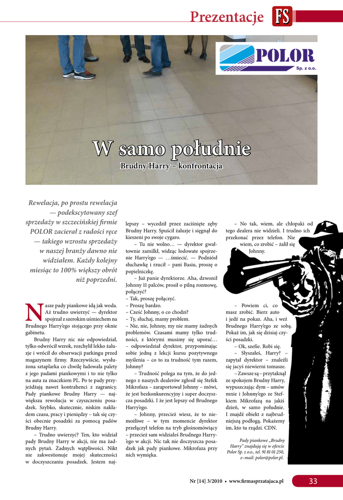 Prezentacje W samo południe Brudny Harry – konfrontacja Rewelacja, po prostu rewelacja — podekscytowany szef sprzedaży w szczecińskiej firmie POLOR zacierał z radości ręce — takiego wzrostu sprzedaży w naszej branży dawno nie widziałem. Każdy kolejny miesiąc to 100% większy obrót niż poprzedni. N asze pady piankowe idą jak woda. Aż trudno uwierzyć — dyrektor spojrzał z szerokim uśmiechem na Brudnego Harry’ego stojącego przy oknie gabinetu. Brudny Harry nic nie odpowiedział, tylko odwrócił wzrok, rozchylił lekko żaluzje i wrócił do obserwacji parkingu przed magazynem firmy. Rzeczywiście, wysłużona sztaplarka co chwilę ładowała palety z jego padami piankowymi i to nie tylko na auta za znaczkiem PL. Po te pady przyjeżdżają nawet kontrahenci z zagranicy. Pady piankowe Brudny Harry — największa rewolucja w czyszczeniu posadzek. Szybko, skutecznie, niskim nakładem czasu, pracy i pieniędzy – tak się czyści obecnie posadzki za pomocą padów Brudny Harry. – Trudno uwierzyć? Ten, kto widział pady Brudny Harry w akcji, nie ma żadnych pytań. Żadnych wątpliwości. Nikt nie zakwestionuje mojej skuteczności w doczyszczaniu posadzek. Jestem naj- lepszy – wycedził przez zaciśnięte zęby Brudny Harry. Spuścił żaluzje i sięgnął do kieszeni po swoje cygaro. – Tu nie wolno… — dyrektor gwałtownie zamilkł, widząc lodowate spojrzenie Harry’ego — …śmiecić. — Podniósł słuchawkę i rzucił – pani Basiu, proszę o popielniczkę. – Już panie dyrektorze. Aha, dzwonił Johnny 11 palców, prosił o pilną rozmowę, połączyć? – Tak, proszę połączyć. – Proszę bardzo. – Cześć Johnny, o co chodzi? – Ty, słuchaj, mamy problem. – Nie, nie, Johnny, my nie mamy żadnych problemów. Czasami mamy tylko trudności, z którymi musimy się uporać… – odpowiedział dyrektor, przypominając sobie jedną z lekcji kursu pozytywnego myślenia – co to za trudność tym razem, Johnny? – Trudność polega na tym, że do jednego z naszych dealerów zgłosił się Stefek Mikrofaza – zaraportował Johnny – mówi, że jest bezkonkurencyjny i super doczyszcza posadzki. I że jest lepszy od Brudnego Harry’ego. – Johnny, przecież wiesz, że to niemożliwe – w tym momencie dyrektor przełączył telefon na tryb głośnomówiący – przecież sam widziałeś Brudnego Harry’ego w akcji. Nic tak nie doczyszcza posadzek jak pady piankowe. Mikrofaza przy nich wymięka. – No tak, wiem, ale chłopaki od tego dealera nie widzieli. I trudno ich przekonać przez telefon. Nie wiem, co zrobić – żalił się Johnny. – Powiem ci, co masz zrobić. Bierz auto i jedź na pokaz. Aha, i weź Brudnego Harry’ego ze sobą. Pokaż im, jak się dzisiaj czyści posadzki. – Ok, szefie. Robi się. – Słyszałeś, Harry? – zapytał dyrektor – znaleźli się jacyś niewierni tomasze. – Zawsze są – przytaknął ze spokojem Brudny Harry, wypuszczając dym – umów mnie i Johnny’ego ze Stefkiem Mikrofazą na jakiś dzień, w samo południe. I znajdź obiekt z najbrudniejszą podłogą. Pokażemy im, kto tu rządzi. CDN. Pady piankowe „Brudny Harry” znajdują się w ofercie Polor Sp. z o.o., tel. 91 81 01 250, e–mail: [email protected]. Nr [14] 3/2010 • www.firmasprzatajaca.pl 33