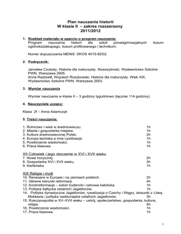 Plan nauczania historii W klasie II – zakres rozszerzony 2011/2012 1. Rozkład materiału w oparciu o program nauczania: Program nauczania historii dla szkół ponadgimnazjalnych ogólnokształcącego, liceum profilowanego i technikum. liceum Numer dopuszczenia MENiS: DKOS 4015-82/02 2. Podręcznik: Jarosław Czubaty, Historia dla maturzysty. Nowożytność, Wydawnictwo Szkolne PWN, Warszawa 2005. Anna Radziwiłł, Wojciech Roszkowski, Historia dla maturzysty. Wiek XIX, Wydawnictwo Szkolne PWN, Warszawa 2003. 3. Wymiar nauczania Wymiar nauczania w klasie II – 3 godziny tygodniowo (łącznie 114 godziny). 4. Nauczyciele uczący: Klasa 2f – Anna Adamczyk 5. Treści nauczania: 1. Rolnictwo i wieś w średniowieczu. 2. Miasta i gospodarka miejska. 3. Kultura średniowiecznej Polski. 4. Europa łacińska a inne cywilizacje. 5. Powtórzenie wiadomości. 6. Praca klasowa. 1h 1h 2h 1h 1h 1h XII Człowiek i jego otoczenie w XVI i XVII wieku 7. Nowe horyzonty. 8. Gospodarka XVI i XVII wieku. 9. Kartkówka 2h 2h 1h XIII Religia i myśl 10. Renesans w Europie i na ziemiach polskich. 2h 11. Główne kierunki reformacji. 4h 12. Kontrreformacja – sobór trydencki i odnowa katolicka. 1h 13. Polityka bałtycka ostatnich Jagiellonów. 1h 14. . Polityka dynastyczna Jagiellonów, rywalizacja o Czechy i Węgry, stosunki z Litwą. Mołdawia i polityka naddunajska ostatnich Jagiellonów. 3h 15. Rzeczpospolita w XV–XVII wieku – ustrój, społeczeństwo, gospodarka, kultura, religia. 5h 16. Powtórzenie wiadomości. 1h 17. Praca klasowa. 1h 1 XIV Państwa i ustroje 18. Ku monarchii absolutnej. 1h 19. Absolutyzm XVII wieku (Francja, Rosja). Monarchia parlamentarna w Anglii. 3h 20. Rzeczpospolita w drugiej połowie XVI wieku – czasy Henryka Walezego i Stefana Batorego. 2h 21. Rzeczpospolita w pierwszej połowie XVII wieku – Zygmunt III i Władysław IV 2h 22. Polityka wewnętrzna i zagraniczna Rzeczypospolitej za panowania Jana Kazimierza. 2h 23. Powtórzenie wiadomości. 1h 24. Praca klasowa. 1h XV Scena polityki europejskiej 25. Racje stanu i racje religijne. 26. Wojna trzydziestoletnia – przyczyny, przebieg, skutki. 27. Zmagania mocarstw. 28. Powtórzenie wiadomości. 29. Praca klasowa. 30. Rzeczpospolita w XVII wieku – szanse i zagrożenia. 31. Schyłek potęgi Rzeczpospolitej. 32. Kartkówka. 1h 1h 2h 1h 1h 2h 4h 1h XVI Przemiany doby oświecenia 33. U progu wielkiej zmiany. 34. Europa i daleki świat w XVIII i pierwszej połowie XIX wieku. 35. W kręgu oświecenia. 36. Władcy i filozofowie. 37. Wojna o niepodległość Stanów Zjednoczonych. 38. Rewolucja francuska. 39. Próby naprawy Rzeczpospolitej w latach 1733-1772. 40. Ostatnia szansa i upadek. Rzeczpospolita w latach 1788-1794. 41. Powtórzenie wiadomości. 42. Praca klasowa. 43. Wielkie cesarstwo. 44. Cesarz i Polacy. 45. O źródłach – dylematy XIX wiecznych badaczy historii. 46. Powtórzenie wiadomości. 47. Praca klasowa. 1h 1h 1h 2h 1h 3h 2h 3h 1h 1h 2h 2h 1h 1h 1h XVII Gospodarka i społeczeństwo 48. Europa i świat – postęp techniczny. 49. Ziemie polskie- opóźniona rewolucja przemysłowa. 1h 1h XVIII Myśl polityczna i kulturalna 50. Kierunki ideowe – koncepcje ustrojów i kwestia narodowa. 51. Kultura europejska w XIX wieku. 1h 1h XIX Europa 1815-1871 52. Europa legitymizmu i buntu 1815-1847. 53. Wiosna Ludów 1848-1849. 54. Wojna krymska. 55. Zjednoczenie Włoch i Niemiec. 2h 3h 1h 2h 2 56. Kartkówka 1h XX Ziemie polskie 1815-1864 57. Lata 1815-1830. 58. Powstanie listopadowe i jego konsekwencje. 59. Wielka Emigracja i spiski w kraju. 60. Powstanie styczniowe. 1h 1h 1h 2h XXI Problemy wewnętrzne państw Europy 1850 – 1914 61. Kształtowanie się demokracji oraz rozwój ruchów społeczno-politycznych.1h 62. Rosja od „koszar mikołajowskich” do 1905 roku. 1h 63. Problemy wewnętrzne pozostałych państw europejskich. 1h XXII Ziemie polskie 1864-1907 64. Polityka władz zaborczych wobec Polaków. 2h 65. Lojalizm, ugoda, praca organiczna – różne postawy Polaków wobec polityki władz zaborczych w II połowie XIX wieku. 1h 66. Polskie ruchy polityczne w II połowie XIX wieku. 2h 67. Kultura polska w służbie narodowej 1815–1914. 1h XXIII Świat pozaeuropejski w XIX wieku 68. Powstanie niepodległych państw w Ameryce Południowej i Środkowej i ich problemy wewnętrzne. 1h 69. Wojna secesyjna w USA – przyczyny, przebieg i następstwa. 1h 70. Problemy wewnętrzne Chin i Japonii w XIX wieku. 1h 71. Geneza, formy i następstwa kolonializmu w XIX wieku. 1h Łącznie 114 godzin 3