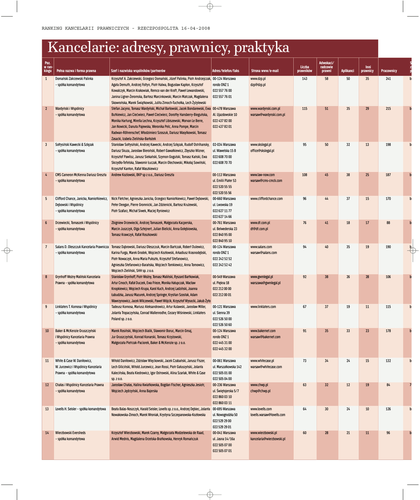 RANKING KANCELARII PRAWNICZYCH - RZECZPOSPOLITA 16-04-2008 Kancelarie: adresy, prawnicy, praktyka Poz. w rankingu Pełna nazwa i forma prawna Liczba prawników Adwokaci/ radcowie prawni Aplikanci Inni prawnicy Pracownicy S z p www.dzp.pl [email protected] 143 58 50 35 241 br 00-478 Warszawa Al. Ujazdowskie 10 022 437 82 00 022 437 82 01 www.wardynski.com.pl [email protected] 115 51 35 29 215 br 02-034 Warszawa ul. Wawelska 15 B 022 608 70 00 022 608 70 70 www.skslegal.pl [email protected] 95 50 32 13 198 br 00-113 Warszawa ul. Emilii Plater 53 022 520 55 55 022 520 55 56 Clifford Chance, Janicka, Namiotkiewicz, Nick Fletcher, Agnieszka Janicka, Grzegorz Namiotkiewicz, Paweł Dębowski, 00-660 Warszawa Dębowski i Wspólnicy Peter Deegan, Pierre Gromnicki, Jan Zdzienicki, Bartosz Krużewski, ul. Lwowska 19 – spółka komandytowa Piotr Szafarz, Michał Siwek, Maciej Ryniewicz 022 627 11 77 022 627 14 66 Drzewiecki, Tomaszek i Wspólnicy Zbigniew Drzewiecki, Andrzej Tomaszek, Małgorzata Kacperska, 00-761 Warszawa – spółka komandytowa Marcin Juszczyk, Olga Sztejnert, Julian Bielicki, Anna Gołębiowska, ul. Belwederska 23 Tomasz Krawczyk, Rafał Roszkowski 022 840 95 00 022 840 95 10 Salans D. Oleszczuk Kancelaria Prawnicza Tomasz Dąbrowski, Dariusz Oleszczuk, Marcin Bartczak, Robert Dulewicz, 00-124 Warszawa – spółka komandytowa Karina Furga, Marek Grodek, Wojciech Kozłowski, Arkadiusz Krasnodębski, rondo ONZ 1 Piotr Nowaczyk, Anna Maria Pukszto, Krzysztof Stefanowicz, 022 242 52 52 Agnieszka Stefanowicz-Barańska, Wojciech Tomkiewicz, Anna Tomowicz, 022 242 52 42 Wojciech Zieliński, SHH sp. z o.o. Grynhoff Woźny Maliński Kancelaria Stanisław Grynhoff, Piotr Woźny, Tomasz Maliński, Ryszard Bartkowiak, 00-549 Warszawa Prawna – spółka komandytowa Artur Cmoch, Rafał Duczek, Ewa Frieze, Monika Hałupczak, Wacław ul. Piękna 18 Knopkiewicz, Wojciech Krupa, Karol Kuch, Andrzej Ladziński, Joanna 022 212 00 00 Łabudzka, Janusz Mazurek, Andrzej Springer, Krystian Szostak, Adam 022 212 00 01 Wawrzynowicz, Jacek Wilczewski, Paweł Wójcik, Krzysztof Wysocki, Jakub Żyto Linklaters T. Komosa i Wspólnicy Tadeusz Komosa, Mariusz Aleksandrowicz, Artur Kulawski, Jarosław Miller, 00-121 Warszawa – spółka komandytowa Jolanta Tropaczyńska, Conrad Wallenrodhe, Cezary Wiśniewski, Linklaters ul. Sienna 39 Poland sp. z o.o. 022 526 50 00 022 526 50 60 Baker & McKenzie Gruszczyński Marek Rosiński, Wojciech Bialik, Sławomir Boruc, Marcin Gmaj, 00-124 Warszawa i Wspólnicy Kancelaria Prawna Jur Gruszczyński, Konrad Konarski, Tomasz Krzyżowski, rondo ONZ 1 – spółka komandytowa Małgorzata Pietrzak-Paciorek, Baker & McKenzie sp. z o.o. 022 445 31 00 022 445 32 00 www.law-now.com [email protected] 108 45 38 25 187 br www.cliffordchance.com 96 44 37 15 170 br www.dt.com.pl [email protected] 76 41 18 17 88 br www.salans.com [email protected] 94 40 35 19 190 br www.gwmlegal.pl [email protected] 92 38 26 28 106 br www.linklaters.com 67 37 19 11 115 br www.bakernet.com [email protected] 91 35 33 23 178 br 11 White & Case W. Daniłowicz, W. Jurcewicz i Wspólnicy Kancelaria Prawna – spółka komandytowa www.whitecase.pl [email protected] 73 34 24 15 132 br 12 Chałas i Wspólnicy Kancelaria Prawna – spółka komandytowa www.chwp.pl [email protected] 63 32 12 19 84 70 13 Lovells H. Seisler – spółka komandytowa www.lovells.com [email protected] 64 30 24 10 126 br 14 Wierzbowski Eversheds – spółka komandytowa www.wierzbowski.pl [email protected] 60 28 21 11 96 br 1 Domański Zakrzewski Palinka – spółka komandytowa 2 Wardyński i Wspólnicy – spółka komandytowa 3 Sołtysiński Kawecki & Szlęzak – spółka komandytowa 4 CMS Cameron McKenna Dariusz Greszta – spółka komandytowa 5 6 7 8 9 10 Szef i nazwiska wspólników/partnerów Adres/telefon/faks Strona www/e-mail Krzysztof A. Zakrzewski, Grzegorz Domański, Józef Palinka, Piotr Andrzejczak, Agata Demuth, Andrzej Foltyn, Piotr Halwa, Bogusław Kapłon, Krzysztof Kowalczyk, Marcin Krakowiak, Remco van der Kroft, Paweł Lewandowski, Janina Ligner-Żeromska, Bartosz Marcinkowski, Marcin Matczak, Magdalena Skowrońska, Marek Świątkowski, Julita Zimoch-Tuchołka, Lech Żyżylewski Stefan Jacyno, Tomasz Wardyński, Michał Barłowski, Jacek Bondarewski, Ewa Butkiewicz, Jan Ciećwierz, Paweł Ciećwierz, Dorothy Hansberry-Bieguńska, Monika Hartung, Mirella Lechna, Krzysztof Libiszewski, Morvan Le Berre, Jan Nowicki, Danuta Pajewska, Weronika Pelc, Anna Pompe, Marcin Radwan-Rõhrenschef, Włodzimierz Szoszuk, Dariusz Wasylkowski, Tomasz Zasacki, Izabela Zielińska-Barłożek Stanisław Sołtysiński, Andrzej Kawecki, Andrzej Szlęzak, Rudolf Ostrihansky, Dariusz Skuza, Jarosław Bieroński, Robert Gawałkiewicz, Zbyszko Wizner, Krzysztof Pawlisz, Janusz Siekański, Szymon Gogulski, Tomasz Kański, Ewa Skrzydło-Tefelska, Sławomir Łuczak, Marcin Olechowski, Mikołaj Sowiński, Krzysztof Kanton, Rafał Waszkiewicz Andrew Kozlowski, BKP sp z o.o., Dariusz Greszta 00-124 Warszawa rondo ONZ 1 022 557 76 00 022 557 76 01 Witold Daniłowicz, Zdzisław Więckowski, Jacek Czabański, Janusz Fiszer, Lech Giliciński, Witold Jurcewicz, Jean Rossi, Piotr Gałuszyński, Jolanta Kalecińska, Beata Kiedrowicz, Igor Ostrowski, Alina Szarlak, White & Case sp. z o.o. Jarosław Chałas, Halina Kwiatkowska, Bogdan Fischer, Agnieszka Jesiotr, Wojciech Jędrzyński, Anna Bajerska 00-061 Warszawa ul. Marszałkowska 142 022 505 01 00 022 505 04 00 00-236 Warszawa ul. Świętojerska 5/7 022 860 03 10 022 860 03 11 Beata Balas-Noszczyk, Harald Seisler, Lovells sp. z o.o., Andrzej Dębiec, Jolanta 00-695 Warszawa Nowakowska-Zimoch, Marek Wroniak, Krystyna Szczepanowska-Kozłowska ul. Nowogrodzka 50 022 529 29 00 022 529 29 01 Krzysztof Wierzbowski, Marek Czarny, Małgorzata Modzelewska de Raad, 00-041 Warszawa Arwid Mednis, Magdalena Orzelska-Bratkowska, Henryk Romańczuk ul. Jasna 14/16a 022 505 07 00 022 505 07 01 RANKING KANCELARII PR